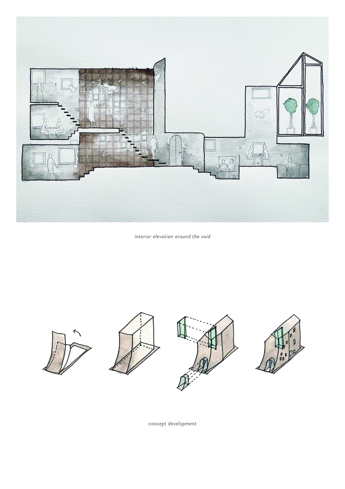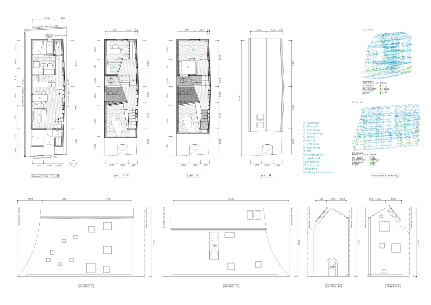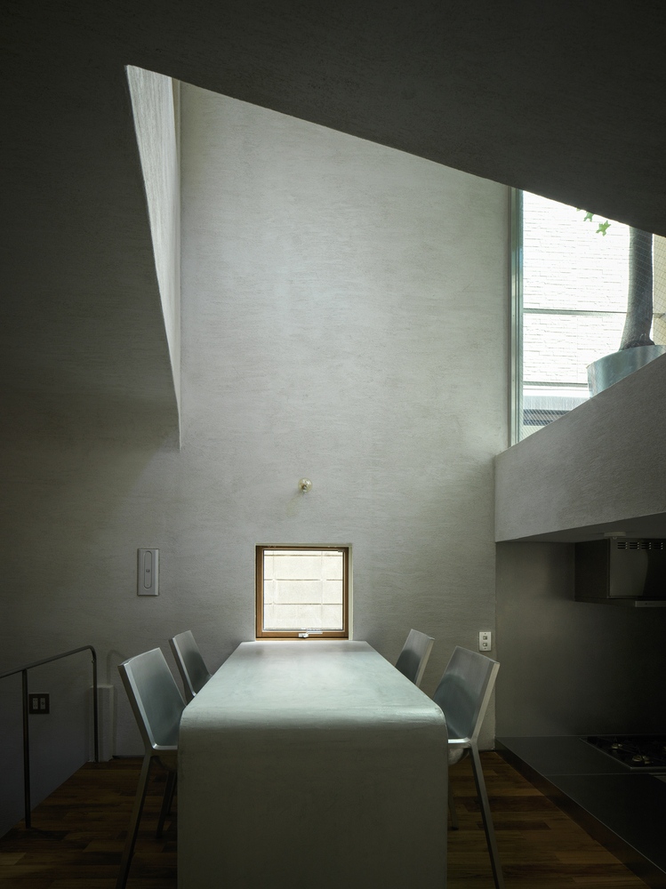 Tan Yamanouchi kreatívan újragondolta a térkapcsolatokat, hogy a kis alapterületen (44 négyzetméter) minden kívánt funkció megtalálja a helyét. A koncepció kiindulópontja a ház metszete volt, az utca felé zárt, lendületesen ívelt falával, az utcafronton két, a hátsó traktusban három szinttel, megmozgatott födémszintekkel. A rajzfilmbe illő utcai homlokzaton csak egyetlen íves átjáró nyílik, mely a ház bejáratához vezet. Az ablakok az oldalsó homlokzatokon is aprók, az északi oldalon viszont egy üvegezett világítóudvar kapott helyet.