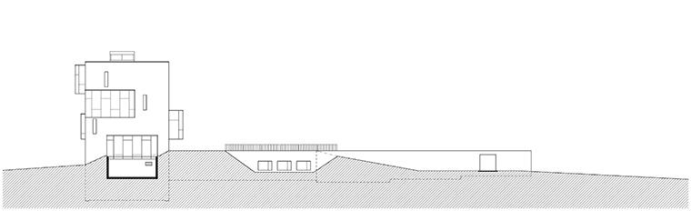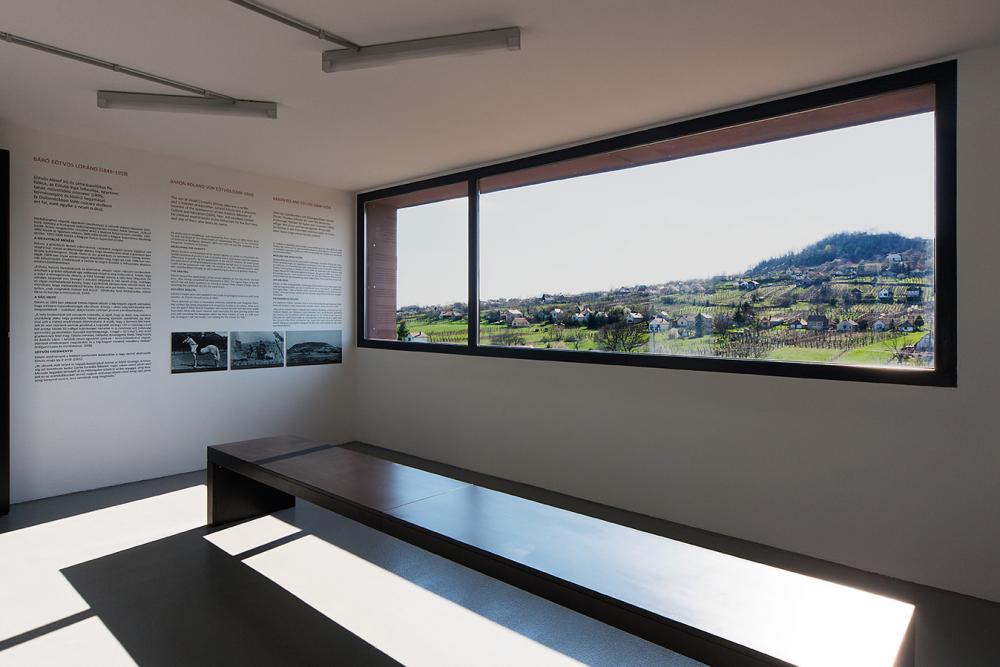Itt jegyzem meg, hogy ezen az ablakon keresztül, pontosan a hegy lábánál látható egy kopott vakolatú, titokzatos, ugyancsak pontszerű, zárt, ipari karakterű épület. Kérdésemre, azt a választ kapom, hogy talán víztorony volt. Ha valaki megszállottja az építészet-illeszkedésnek, akkor nyugodtan összeolvashatja azt a majd száz évvel ezelőtti torony és az új épület morfológiáját. Ráadásul a látogatóközpont indusztriális olvasata sem téves, ha tudjuk, hogy a régió egyik legnagyobb kőbányája működött itt. Csak néhány szó erejéig térjünk azonban vissza a kiállítóterekbe.