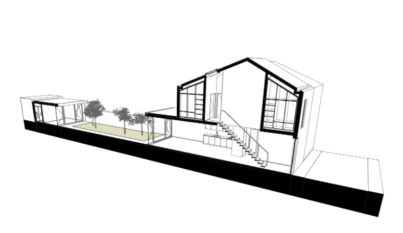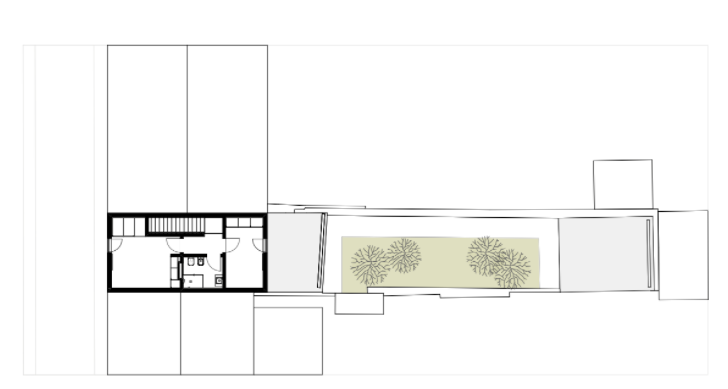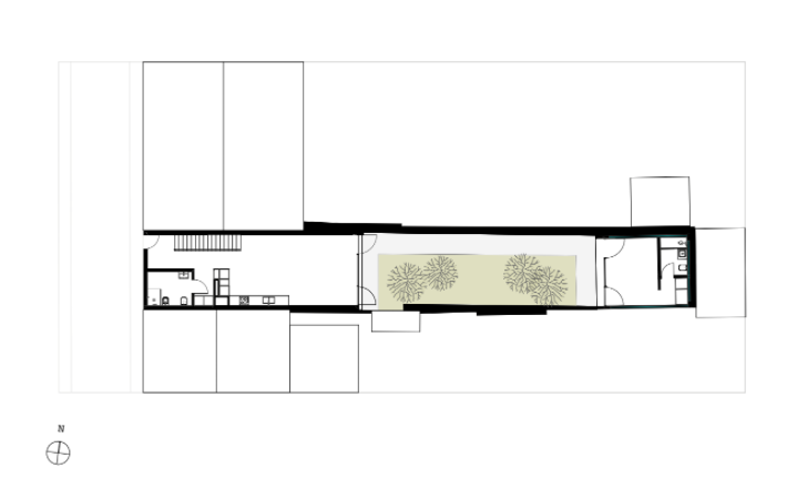 Bent nincsenek átmeneti vagy elválasztó terek. Az alsó szint osztatlan közösségi tere mélységében nyer dimenziót azzal, hogy a végén ott a kert. A kert teremti meg az egyensúlyt a ház és a telek végén található építmény között. Az emeleten a keleti hálószoba teraszáról a környékre oly jellemző városi házak panorámája nyílik.