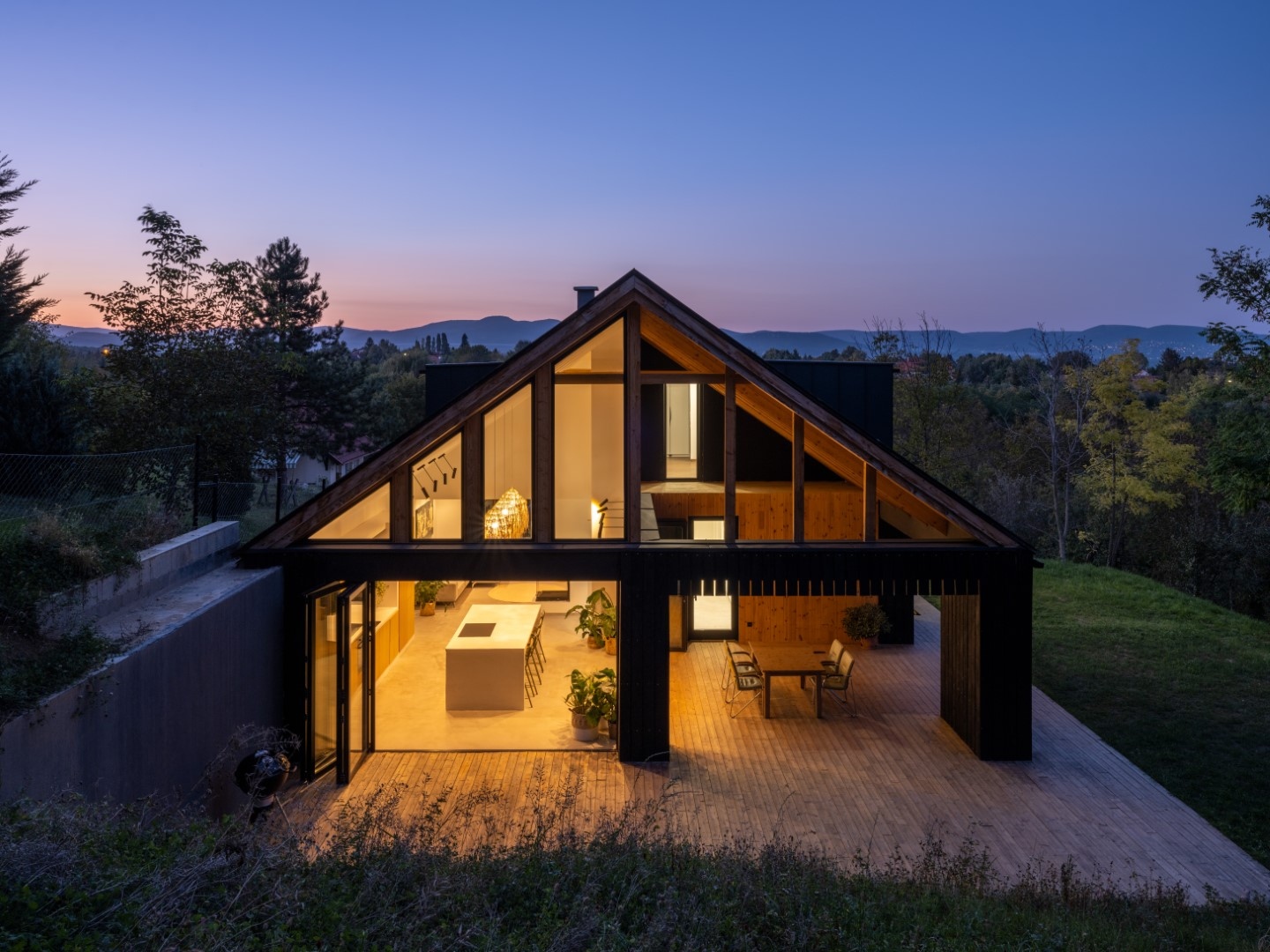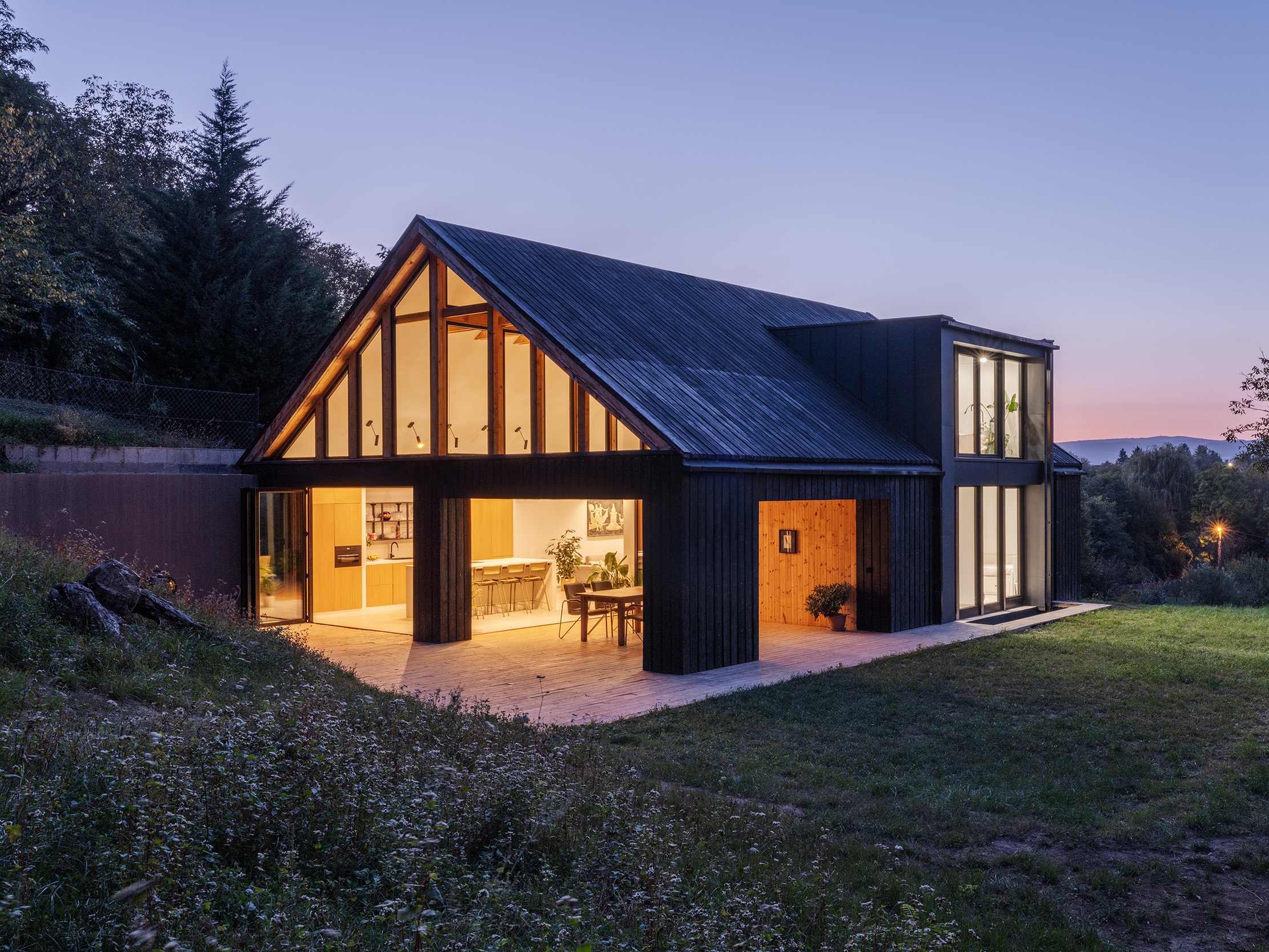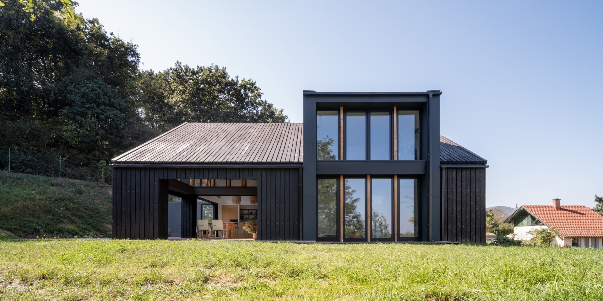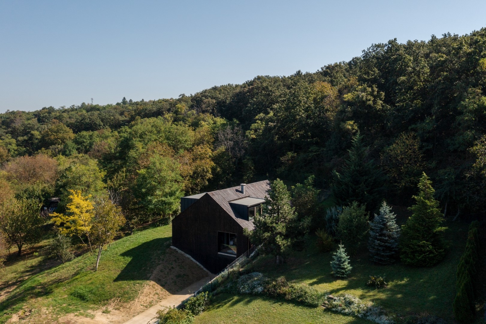 Fekete otthon fákkal határolt, lejtős telken, Budakalász közepén: szerkezetében összekeveredik nyitott és zárt, akárcsak a kicsi és a nagy, de még az aszimmetria is találkozik a szimmetrikussal. A helyi szabályozások egy maximum 150 négyzetméteres házat engedtek meg, ennek ellenére Őrfi József legújabb munkájában elfért egy nagyon tágas konyha-étkező-nappali, egy szülői hálószoba, a gyerekszoba, két vendégszoba – no meg még két fürdő, tároló és az autóbeálló is a szuterén szinten. Két hatásos gesztus is van az alaprajzban.