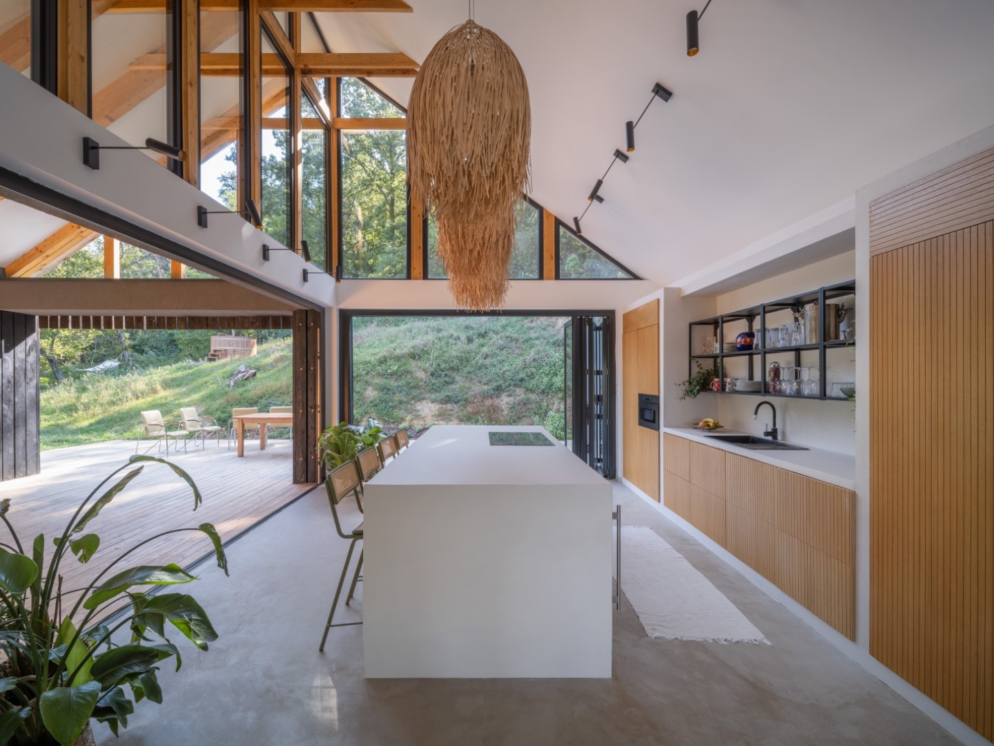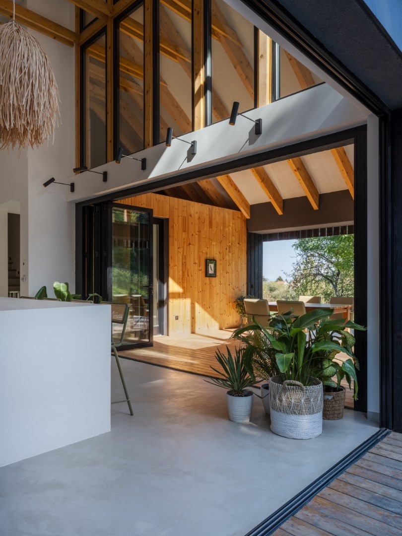 a hatalmas közösségi tér fapadlója egyszerűen túlkúszik a kertbe, és az a házat átölelve, a harmonika nyílászárók közbenjárásával teszi a nappalit és a konyhát a kert részévé alkalomadtán.