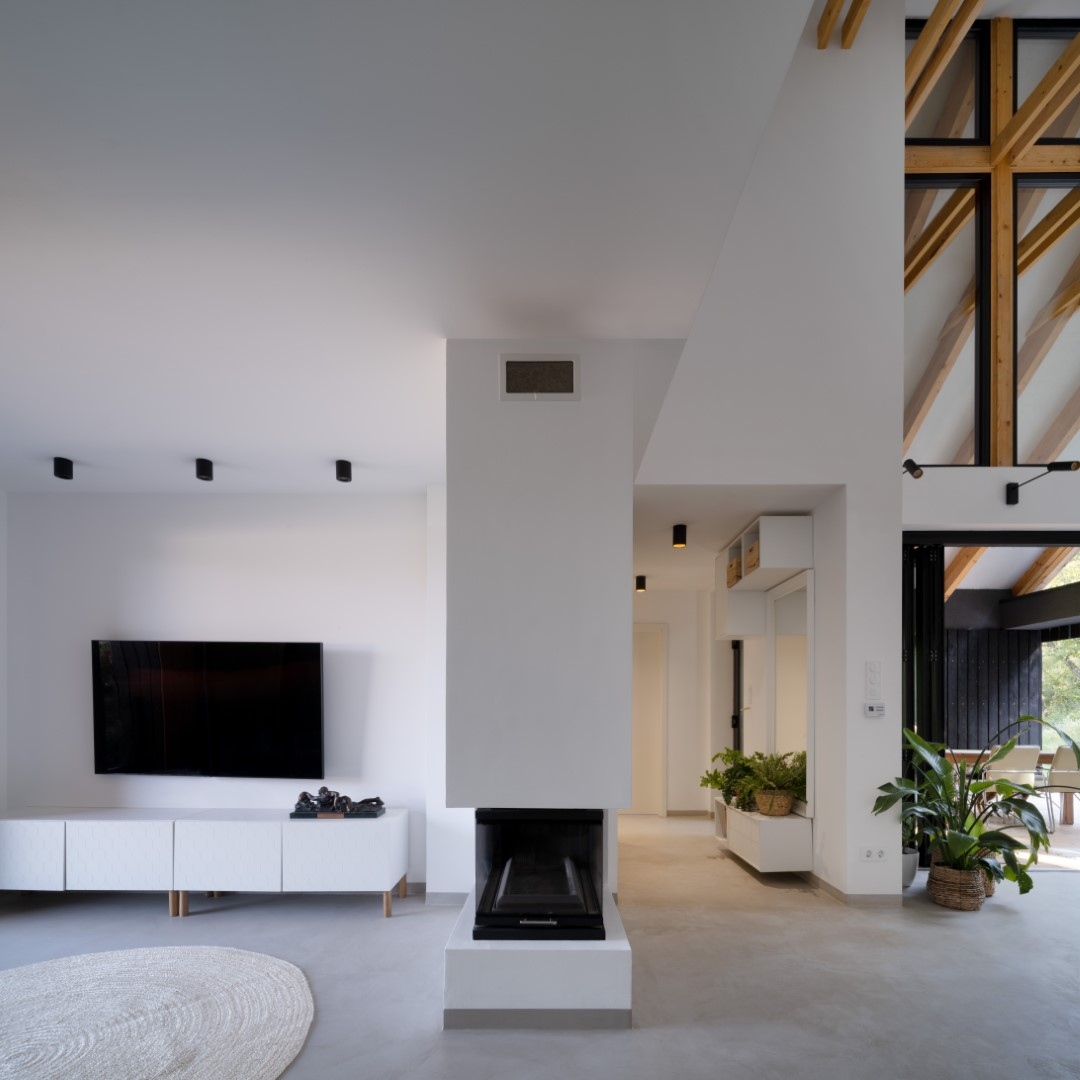 A belsőépítészet majdnem teljes egészében a tulajdonosok saját tervei szerint valósult meg, nem egy részletet maguk is csináltak a két kezükkel. Építész és megrendelő szoros barátságra lelt itt, a tervezést követően az építés során is közösen csiszolták a részleteket, volt, hogy együtt égették a fekete burkolatot is. A terveiben és történetében is lakályos ház a fák árnyéka közé rejtőzve bújik most meg különös árnyalatával, frappáns alaprajzával pedig kint és bent fogalmát mosta össze lakói meghitt, otthonra vágyó örömére.