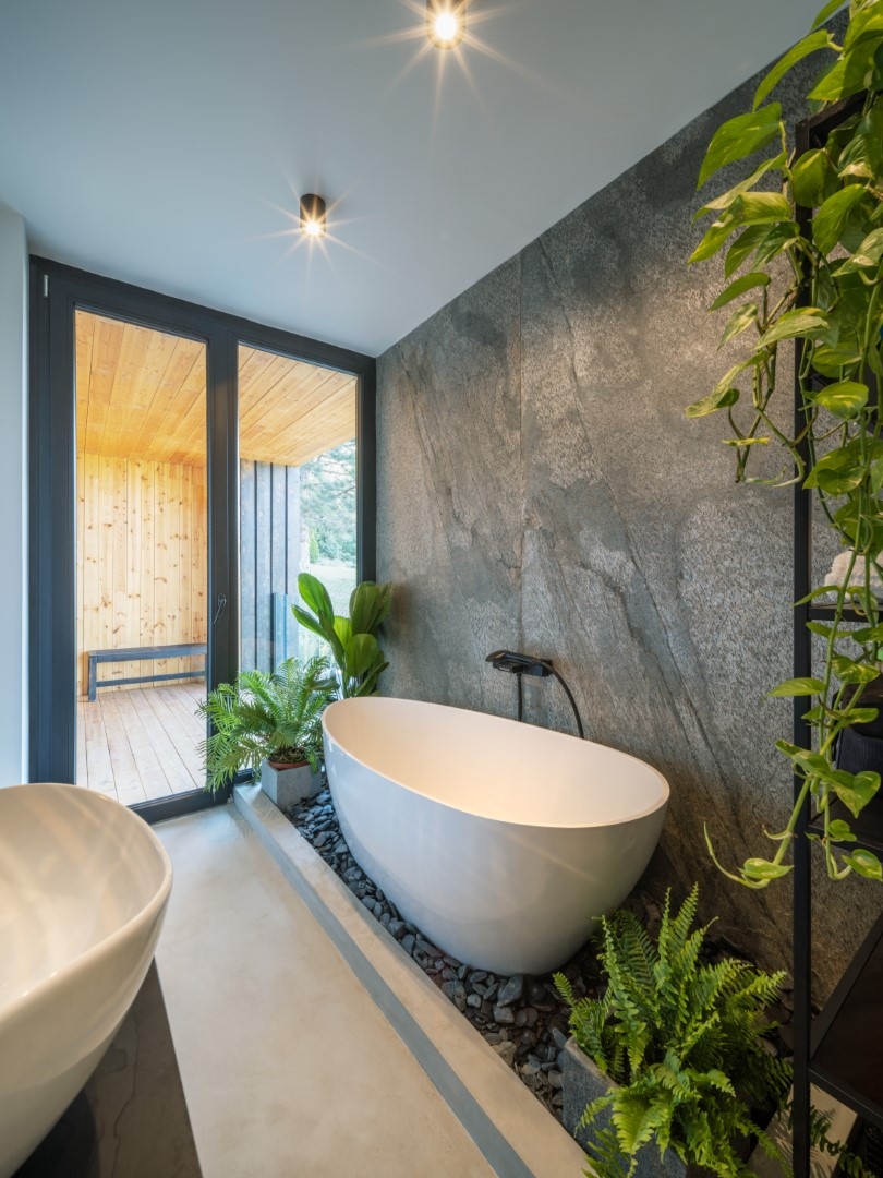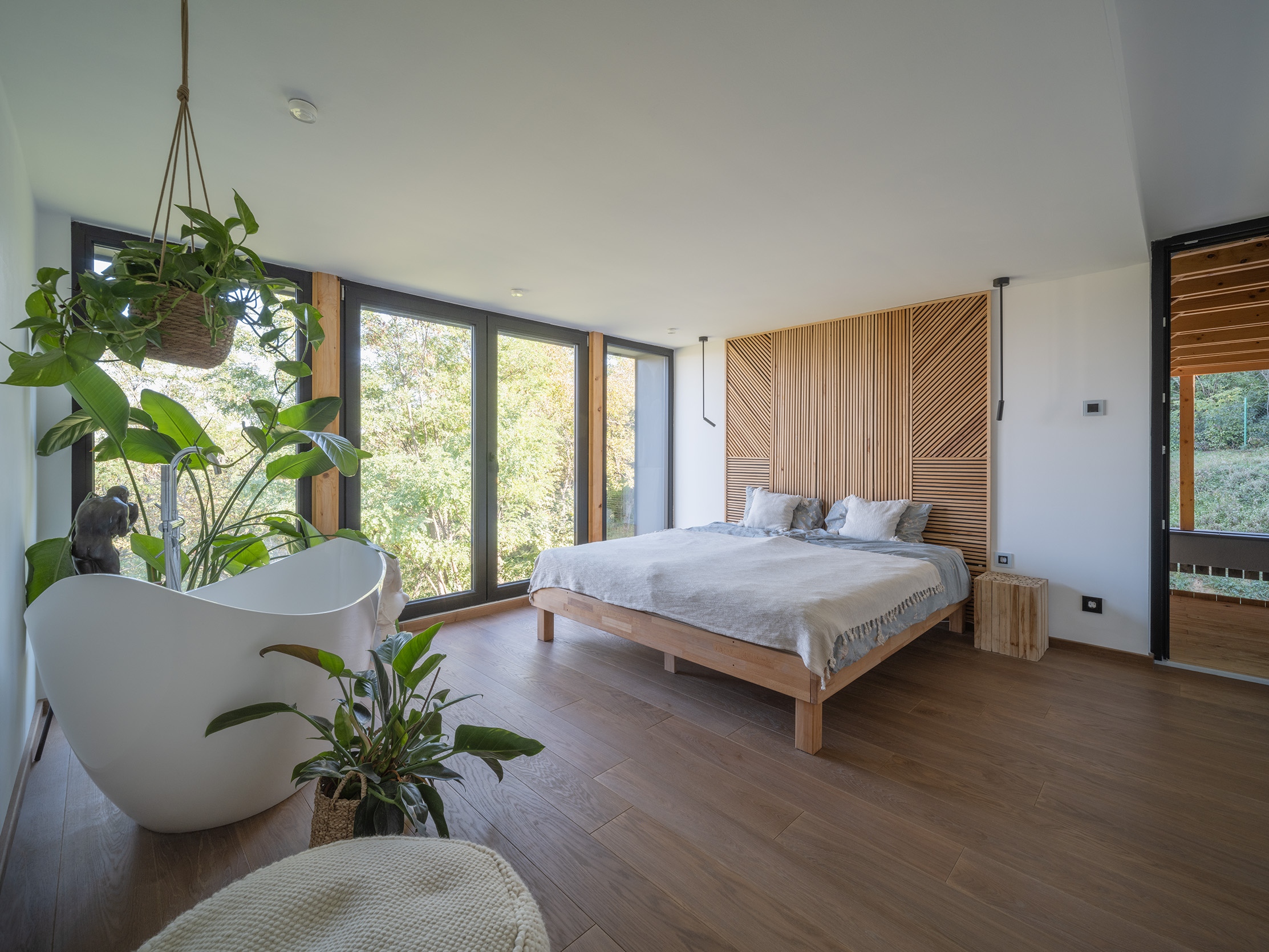 A másik érdekesség a magassági és településképi korlátból adódik. A lejtős terep mentén egy „ház-alakú” épület jöhetett létre, viszont megrendelői kérés volt a tetőtér lehető legnagyobb mértékben történő kihasználása is. Ezt egy apró ötlettel sikerült meglépni: tulajdonképpen egy hasáb metszi át a nyeregtető tömegét, amely sziluettben megfűszerezi ugyan az archetipikus formát két lapostetős szegmenssel a homlokzatokon – magát a hagyományos sziluettet mégsem bontja meg nagy mértékben.