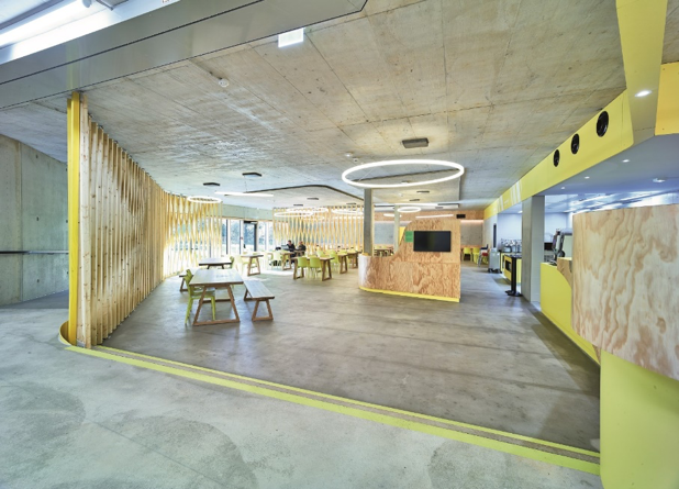 A kivitelezők a közösségi életet tartották szem előtt, akik nem mindennapi módon egy áttetsző és szokatlan kialakítású, magas központi helyiséggel rendelkező komplexumot álmodtak meg.