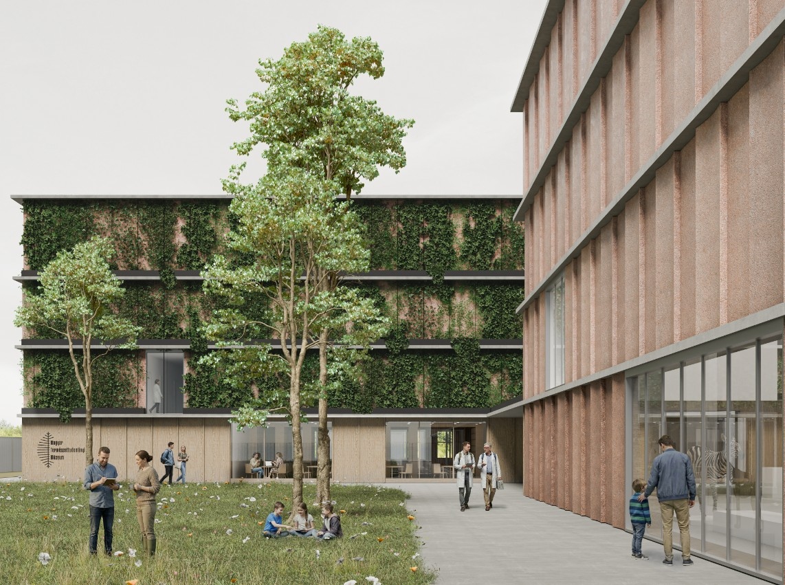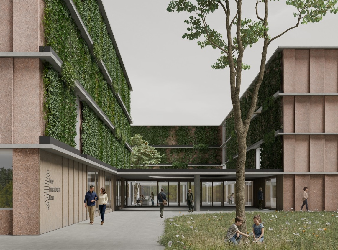 Fontos és kiemelt szempontnak tartjuk az intézmény szellemiségével összhangban a fenntartható anyagok használatát, nem csak a belső terekben, de a homlokzatokon is. Az alapvetően vasbeton pillérvázas szerkezet külső héja, homlokzatburkolata egy egyedi földbeton panel, mely a pinceszint által kitermelt agyagos földet használja fel. Az tervezési területtől délre, a Vezér utca és a 33-as főút között volt egykori tégla- és cserépgyár a terület agyagos talajának hasznosíthatóságáról tesz tanúbizonyságot. A külső homlokzati héjra szerelt 125 cm széles, 345 cm magas panelek a helyben található agyagos talaj és beton keverékéből létrejövő, egyedi, világos terrakotta színű homlokzati elemek, melyekből minden második íves felületű. Az íves és egyenes felületű elemek váltakozásából alakul ki az alapvetően tömör homlokzatok szőtt összképe, mely az irodaterületeknél az elemmagas ablakok segítségével felszakad és felsejlenek a kutatás terei. A tömör felületeket egy-egy nagyobb méretű nyílás oldja, melyeket a fontosabb látványtáraknál és a természetes fényt megengedő nagyobb raktáraknál helyeztünk el, betekintést nyújtva a raktározási és kiállítási területekre a kertből is.