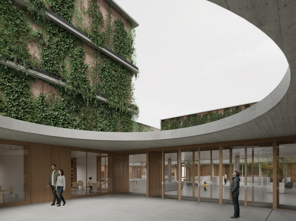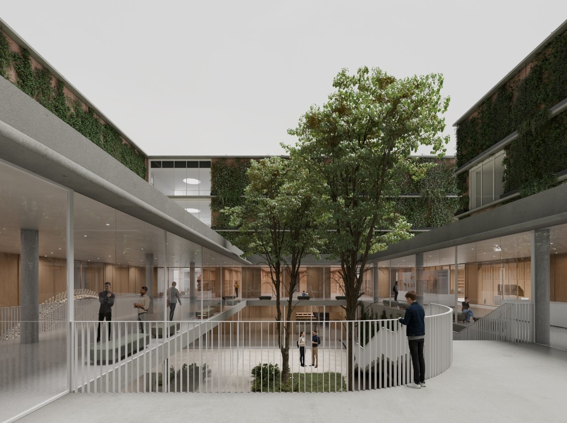 - Az épületegyüttes zöld központja: a különböző épületszárnyak, és a földszint ill. az alagsor esetében a közönségforgalmi terek koncentrálása, rendezése az épület közepén kialakított, intenzív zöld átrium és azt körülvevő körbejárható aula köré az egész térszervezés kulcsmotívuma. Az átriumudvar afféle zöld oázisként szervezi a központi közlekedőtereket, ugyanakkor az két főtömeg udvar felé néző zöldhomlokzata is - annak klimatikus hatásain túl - erre erősít rá.