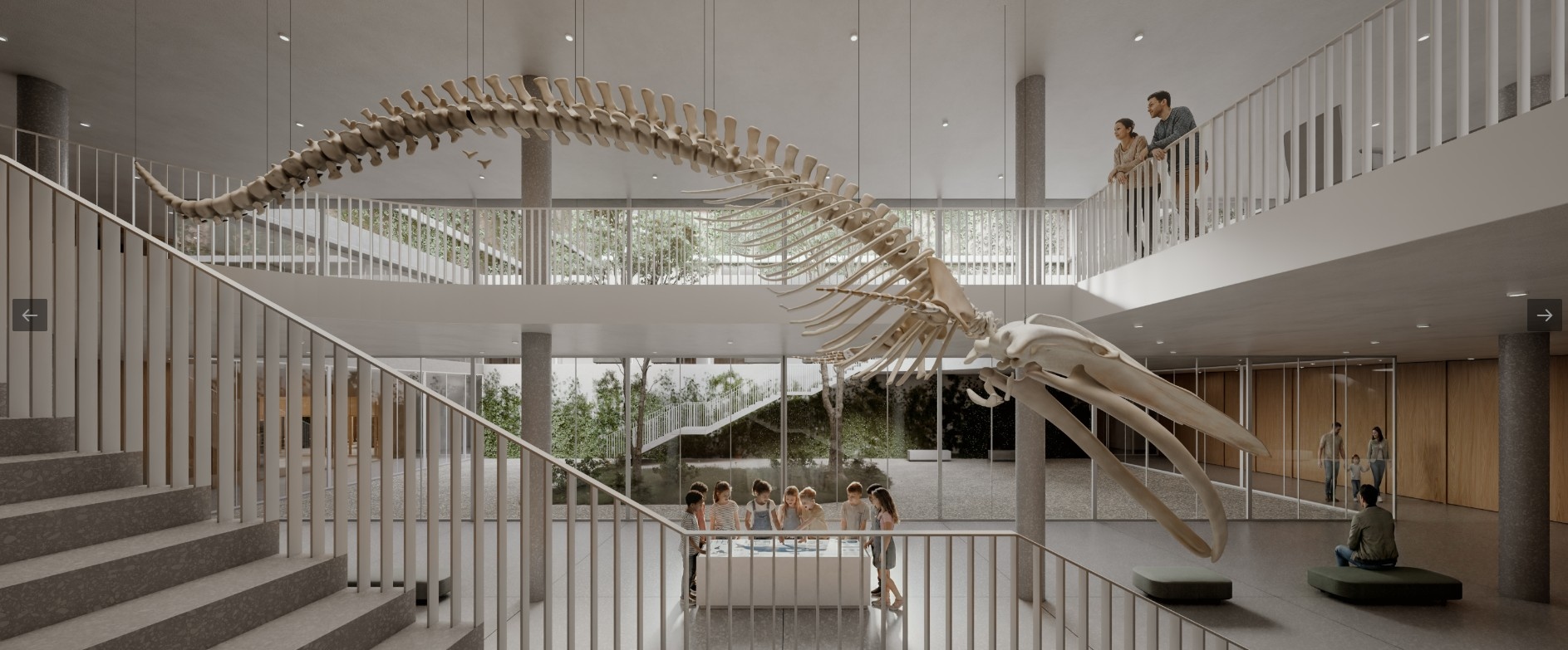 A különböző tárakat úgy helyeztük el, hogy a központi aulát három oldalról körbeveszi az a három osztály, melyekhez látványtár is kapcsolódik. A negyedik oldalon pedig a szintén publikus tereket is tartalmazó Központi Könyvtár kap helyet.