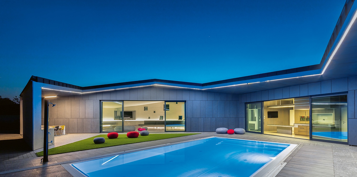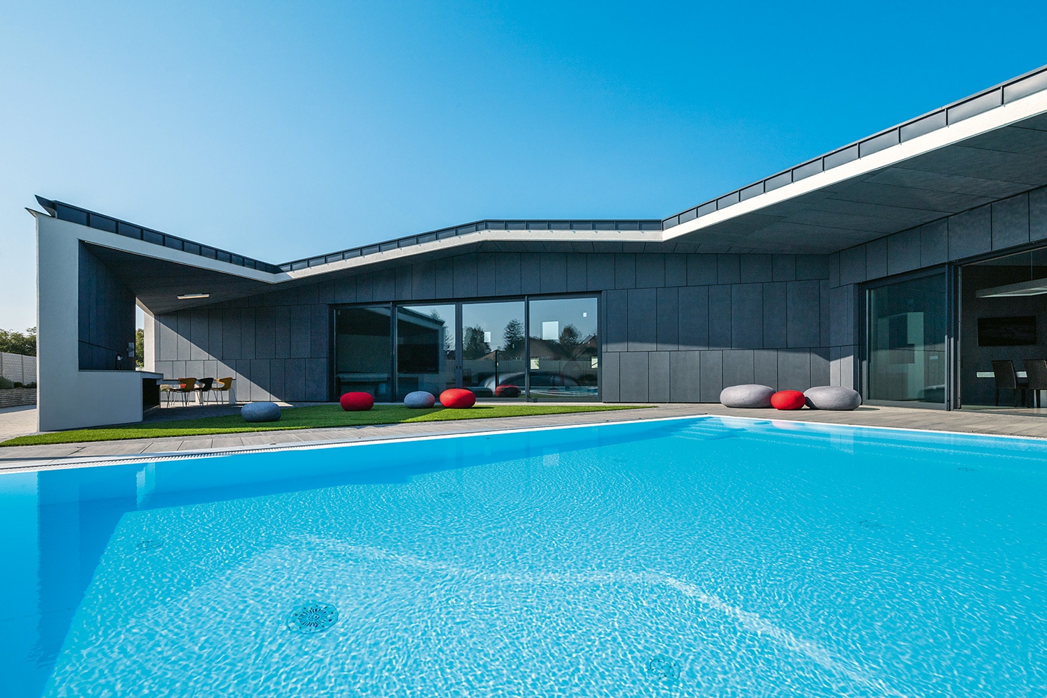 Balatoni nyaraló, erről van egy általános elképzelésünk: kis kert, szűk hálószobák, jó esetben terasz, ahol barátainkat leültethetjük. Ehhez a sémához képest jóval nagyvonalúbb, a társasági életet a középpontba helyező házat képzelt el magának a megrendelő család, amikor felkérte Berecz Tamás és Katók Edit építészeket. Siófokon, de a tótól távolabb, egy hosszan elnyújtott, háromszög alaprajzú telken kezdtek nem mindennapi második otthon építésébe. A megrendelő kívánsága szerint kiemelten nagy tér jut a társasági életnek, a közös kikapcsolódásnak, anyaghasználatában pedig leginkább a betonban gondolkoztak, de nem csak az épület szerkezetének szintjén, hanem egyes bútorok megvalósításánál is.