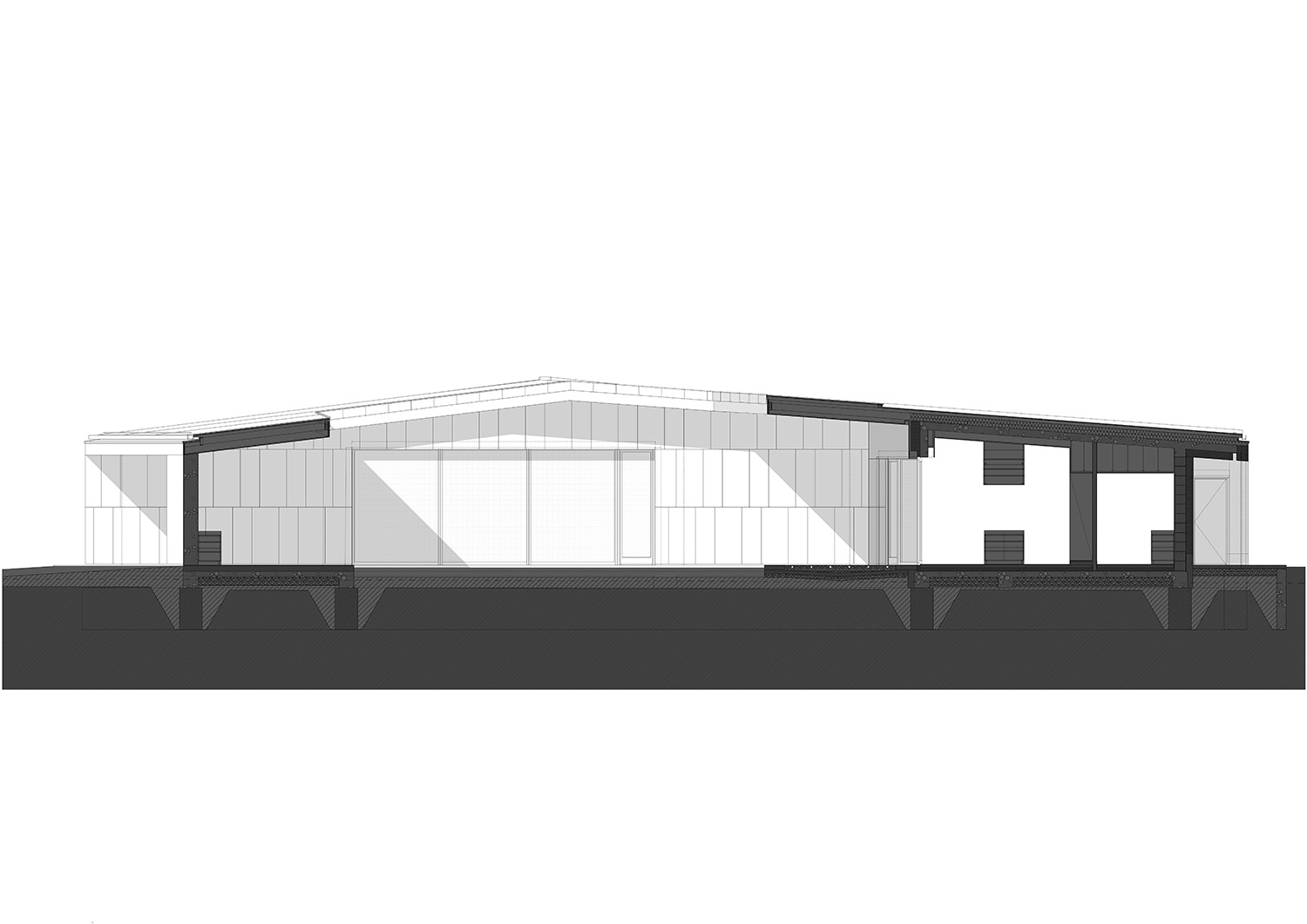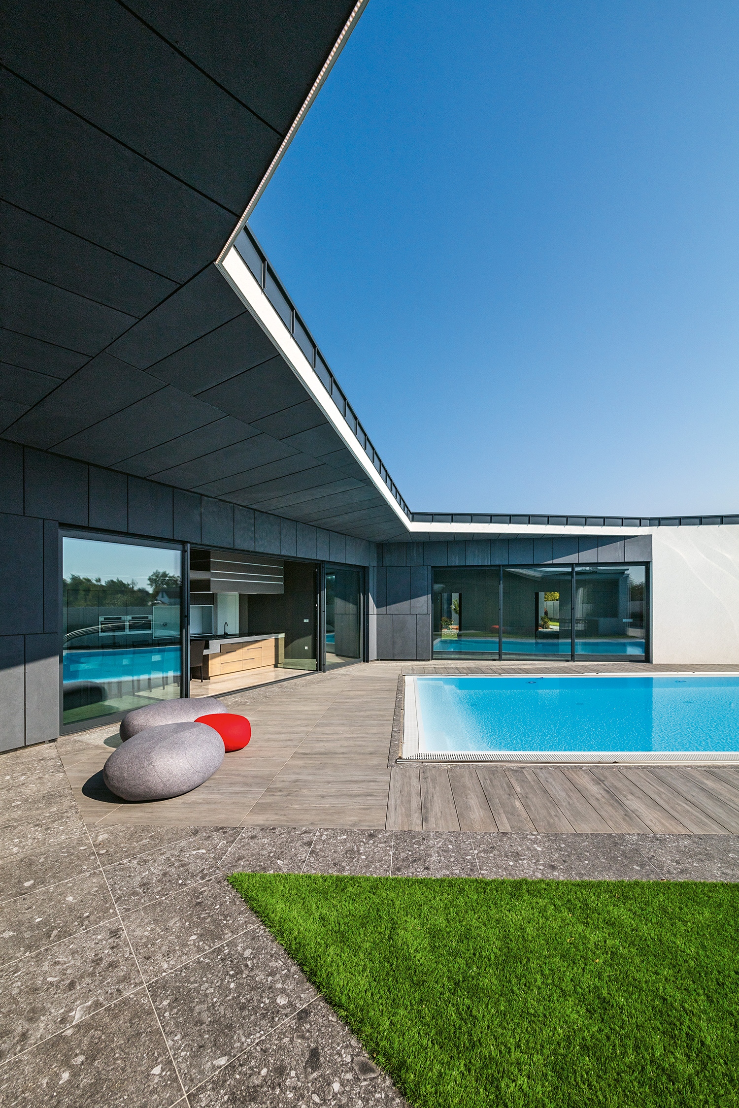E háznak, amely egy hagyományos falusias, de nemrég megnyitott utcában áll, szinte minden szomszédja a hátát mutatja, pontosabban a kertek sufnivilága adja a hátteret hozzá. Ezért a tervezők az épületet befelé, egy átriumszerű belső udvar köré szervezték. A szomszédok irányába teljesen zárt, kívülről fehérre vakolt falazat biztosítja a belső intimitást, az utcai fronton játékosan, szinte véletlenszerűen helyezkednek el a fő társasági helyszínnek, a hatalmas nappalinak az ablakai, míg a kert felé a hálószobák már teljesen nyitottak. A nagy tolóajtókkal kitárulkozó és szálcement lapokkal borított épület három irányból öleli körbe a medencével színesített belső udvart. A körbezárt tér számtalan érdekes térbeli formát rajzol ki, amit erősítenek a változatos méretű és formájú tetőkinyúlások is. A fény, az ég, az árnyékok különböző kivágásokban jelennek meg, bárhonnan is nézünk az udvarra, a háznak saját ege van.
