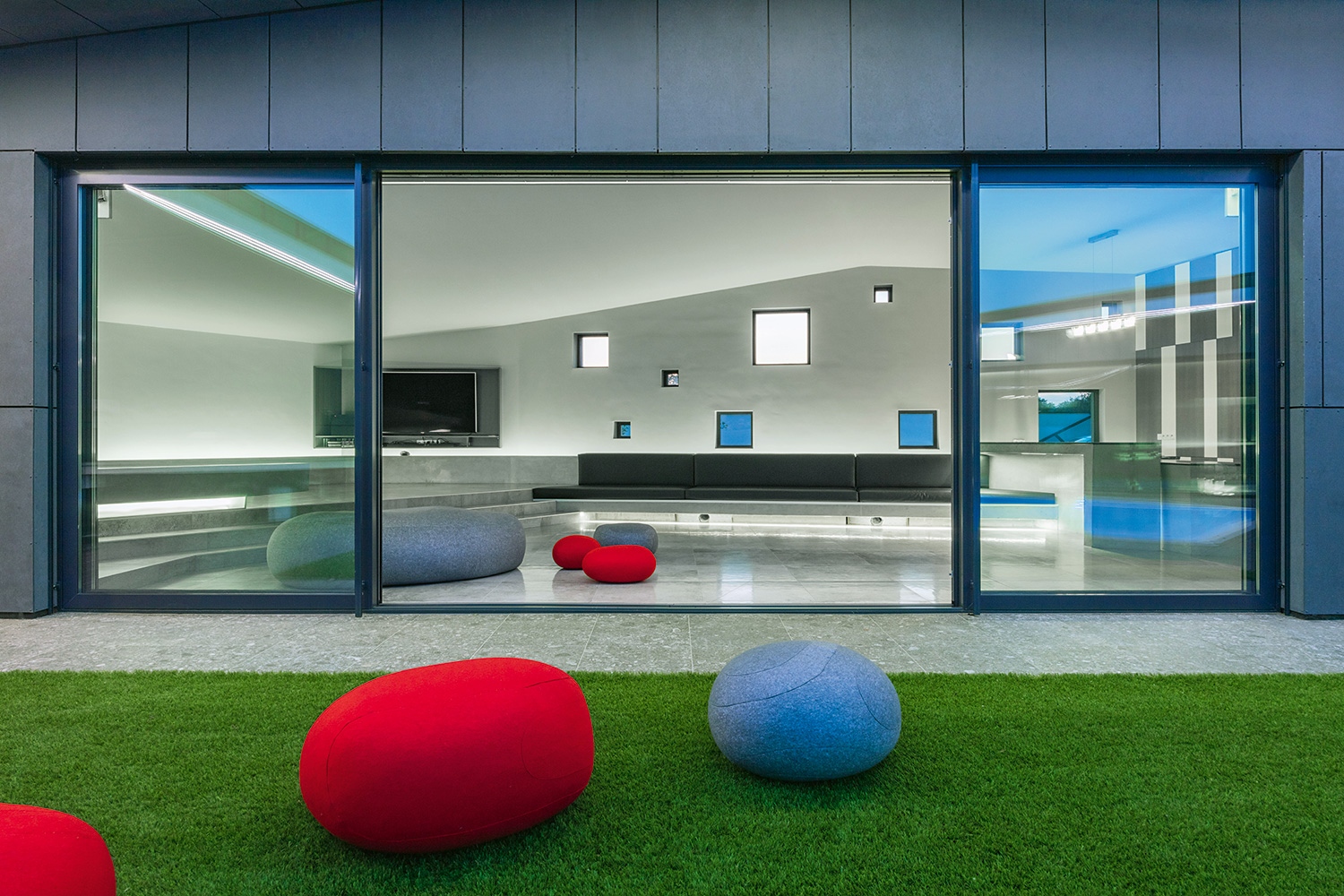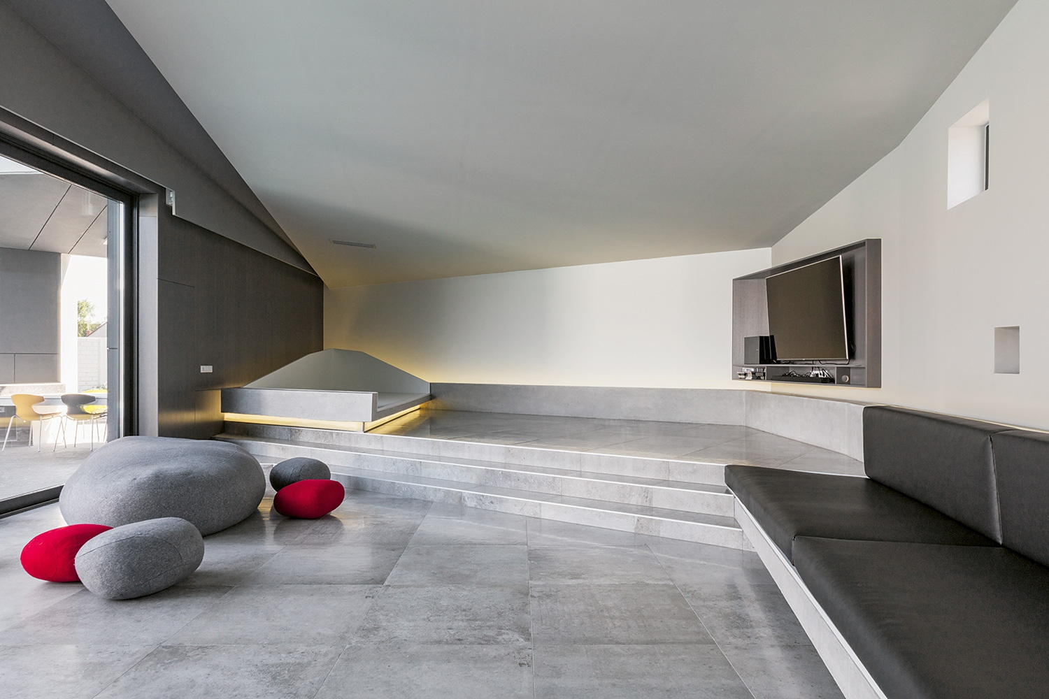 Beton 2017-díjjal jutalmazták ezt a házat, aminek a berendezése már-már szerzetesien puritán, a lényeg maga a tér és nem a benne elhelyezett – vagy épp hiányzó – tárgyak, bútorok. A mesterséges fényt a betonból készült bútoralapokba, valamint a mennyezet (és a tetővonal) alatti sávba süllyesztett, a helységben körbefutó rejtett világítás adja, lámpákat a konyhasziget és a bárpult kivételével sehol sem találunk. Az éles szögek és a durvának, időtlennek ható betonhasználat mellett néhány kőformájú, nemezből készült ülőalkalmatosság visz melegséget, puhaságot a házba. A teljes telken szépen végigvonuló háromszög motívum pedig a távolabbi sarokban létrehozott kerti tárolót és fedett jakuzzit magába foglaló, szintén tompaszöget záró melléképületben csúcsosodik ki, szó szerinti értelemben is.