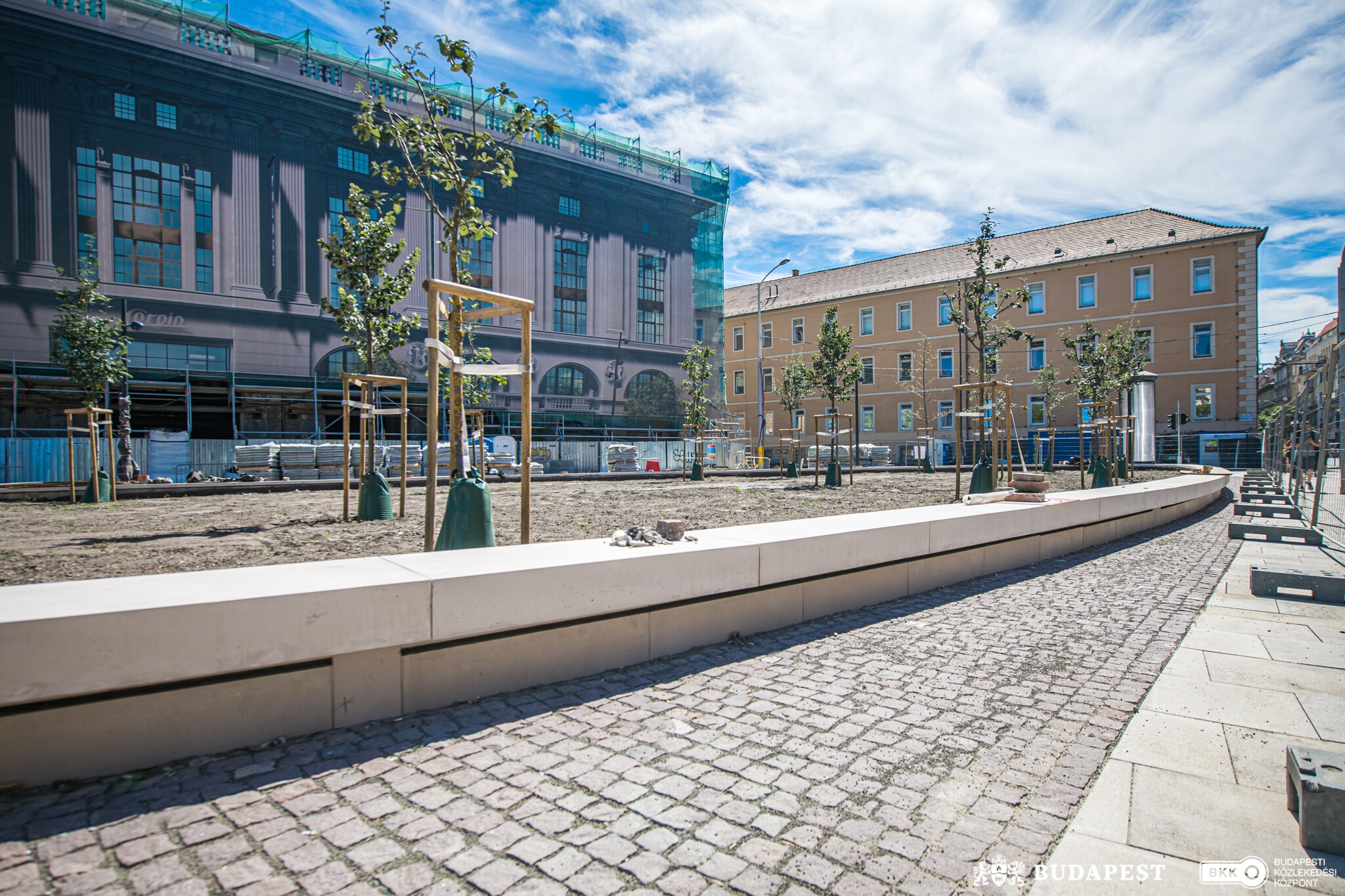 A burkolási munkák, az utcabútorozás még zajlik az elkerített téren, közben a faiskolákban készülődnek az új fák, és a kiemelt kazetták cserje és évelőanyaga az őszi beültetésre. Amikor annak szezonja van jön a második hullám: a befejező kertészeti ültetési munkák.