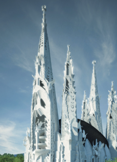 Még inkább hazai színekben indul Gulyás Gábor Szakralitás és természet című pályázata, amely merész egyszerűséggel Makovecz Imre építészetét állítja a középpontba, azon belül is a 2005-ben a Krisztinavárosba tervezett, de meg nem épült Feltámadás temploma építészeti részleteivel illusztrálja négyféle minőség – a fa, a torony, az ember és az angyal – szerepét Makovecz építészetében. Bár ezt a templomot én magam sokkal inkább az életmű grafikai, mintsem építészeti összegzésének tekintem, most egy olyan mondat következik, amiről nem hittem volna, hogy valaha le fogom írni. Ha van alkotó a magyar építészetben, akire a külföld még mindig felkapja a fejét, akivel olyat tudunk mutatni, ami egyedi, akkor kétségkívül Makovecz az – és ez független attól, ki mit gondol szerepének politikai hátteréről, vagy az általa művelt építészet univerzális, vagy épp sajátosan magyar igazságától. A krisztinavárosi templom már fényévekre van a magyar organikus építészet eredeti alapvetésétől, de azzal nem lehet vádolni, hogy nem látványos, vagy netán nem elég gondolatgazdag. A magyar építészetnek nem ez lett az útja, és nem ok nélkül, de hatása kimutatható, még ha nem elsősorban formailag is. Ott azonban még nem tartunk, hogy 2022-ben Makoveczcel álljunk a nagyvilág elé, és ehhez ez a kurátori koncepció sem eléggé elfogulatlan.