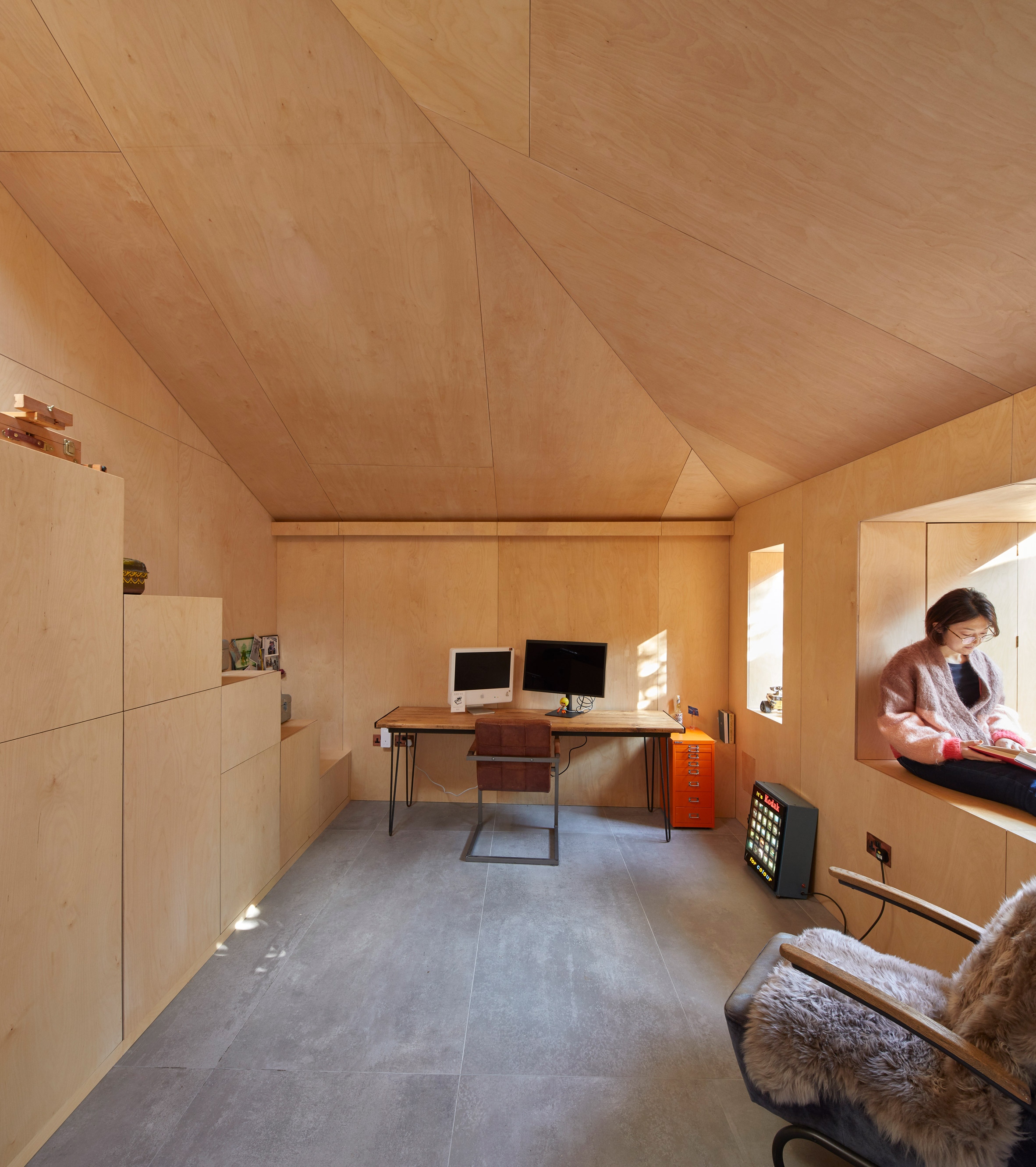A lemezeket a közeli vasútállomásról szerezték be és meghagyták kissé rozsdás mivoltukban, hogy aztán ezzel fedjék le a szoba külsejét, és hogy jól reflektáljon a ház mögött futó vasúti sínekre. A 15 négyzetméteres kuckó két téglafal közé ékelődik be, a teteje kicsit a piramisokra hajaz, az ablakai a kertre néznek, ha pedig a ház mögötti eseményeket szeretné megcsodálni az ember, akkor csak a tetőablakon kihajolva lehet ezt megtenni.A családi ház kertjében álló helyiség falai és a tető is hang- és hőszigeteltek.