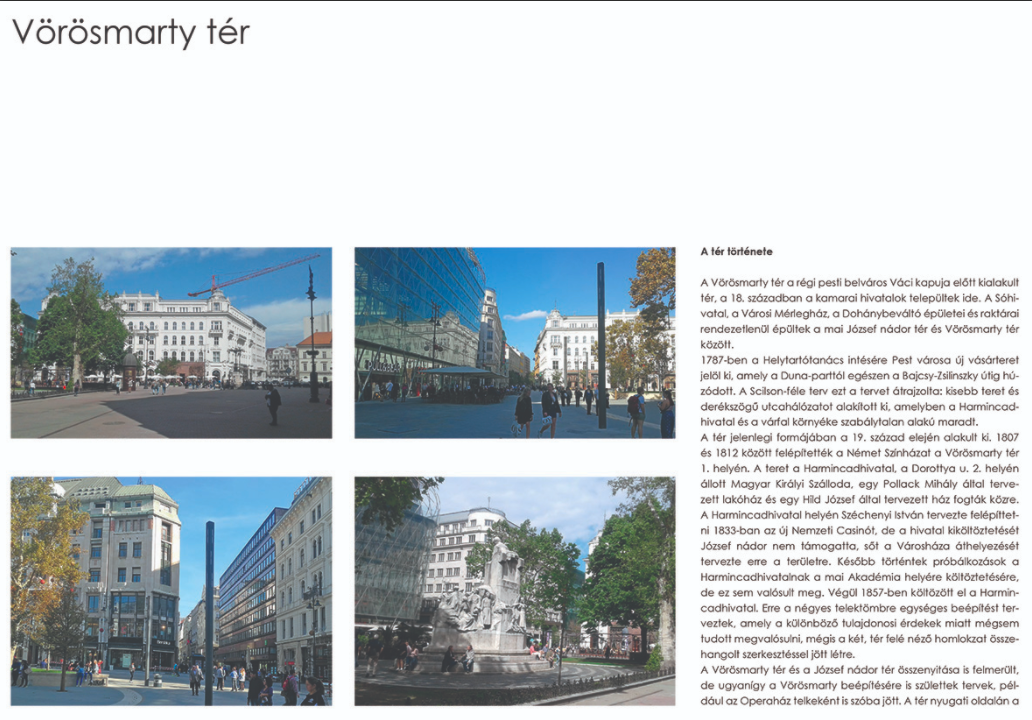 A könyv 54 budapesti teret dolgoz fel a városépítész szemével tárja őket az olvasó elé. Rengeteg fotó, történeti térkép, elemző rajz és tervrajz segítségével mutatja be, milyenek is tereink – térszöveteink mai állapotukban. Lehet használni tankönyvként, mintakönyvként, de lehet hasznos olvasmánya a városépítészet iránt érdeklődőknek is.