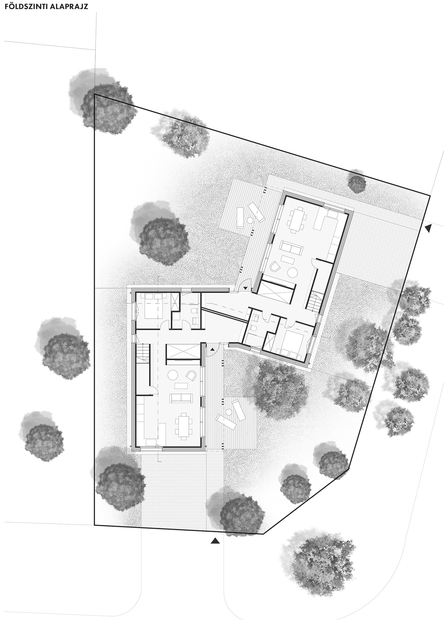 Az ikerház alaprajzi kialakítása nem a szokványos egymáshoz simuló, esetleg eltolt sémát követi. A két lakrész egymástól enyhén elfordulva, külön-külön tömegben kapott helyet, melyeket egy előtérként szolgáló nyaktag köt össze. A két épület közrefog egy 50 éves fenyőfát, amit még Júlia néni ültetett. Ezzel a telepítéssel sikerült a nem túl nagy telken mindkét lakóegység számára intim udvart teremteni, ezzel a kert is a lakás szerves részévé válik. Ezt tovább fokozza a tervezők által kiemelten fontosnak tartott átmeneti terek nagyvonalú alkalmazása.