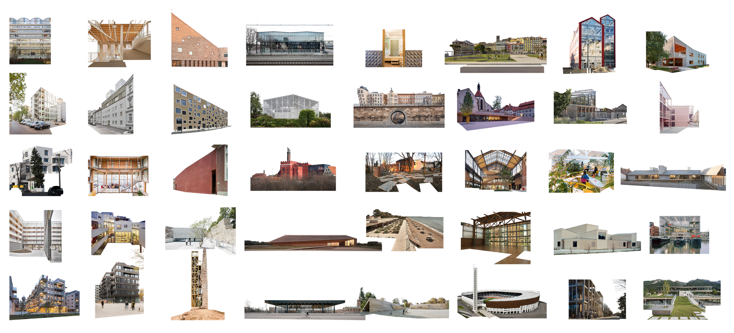 A kiválasztott pályaművek Európa szerte 18 országban találhatók. Ausztriában 5 (Neustift im Stubaital, Wiener Neustadt, Linz illetve 2 Bécsben), 5 Franciaországban (Guécélard, Romainville, Saint-Jean-de-Boiseau és 2 Párizsban), 5 Spanyolországban (Cornellà de Llobregat, Puig-Reig és 3 Barcelonában). Három épület Belgiumban tekinthető meg (Brüsszel, Ghent és Hasselt), további 3 Németországban (mindhárom Berlinben), 3 Nagy-Britanniában (Helensburgh és 2 Londonban). Két munka található Dániában (Ebeltoft, Ribe), Finnországban (Helsinki, Vantaa), Lengyelországban (Oświęcim és Rybnik), valamint Portugáliában (mindkettő Lisszabonban). A többi kiválasztott munka Csehországban (Prága), Görögországban (Kourouta, Amaliada), Hollandiában (Tilburg), Magyarországon (Budapest), Norvégiában (Stavanger), Olaszországban (Turin), Romániában (Bukarest) és Szlovéniában (Ptuj) található.