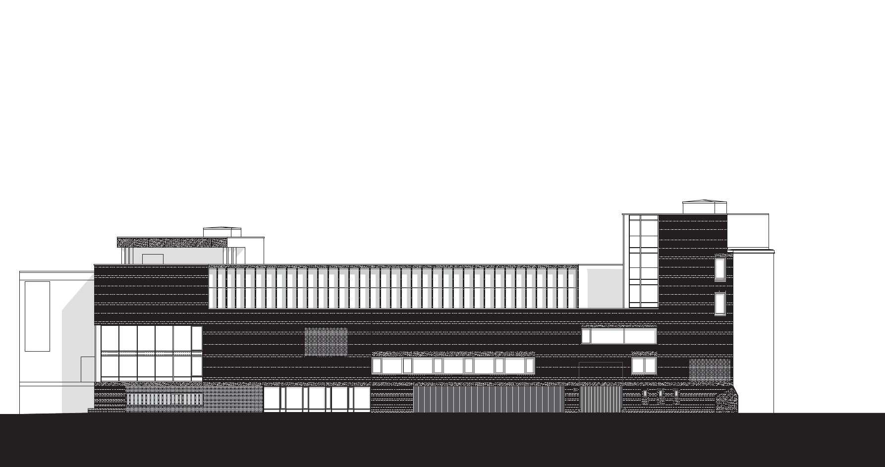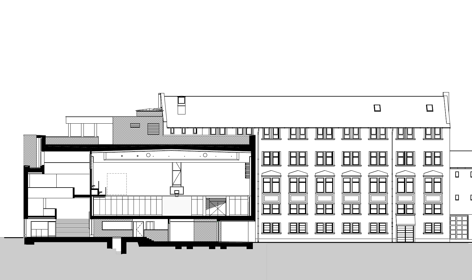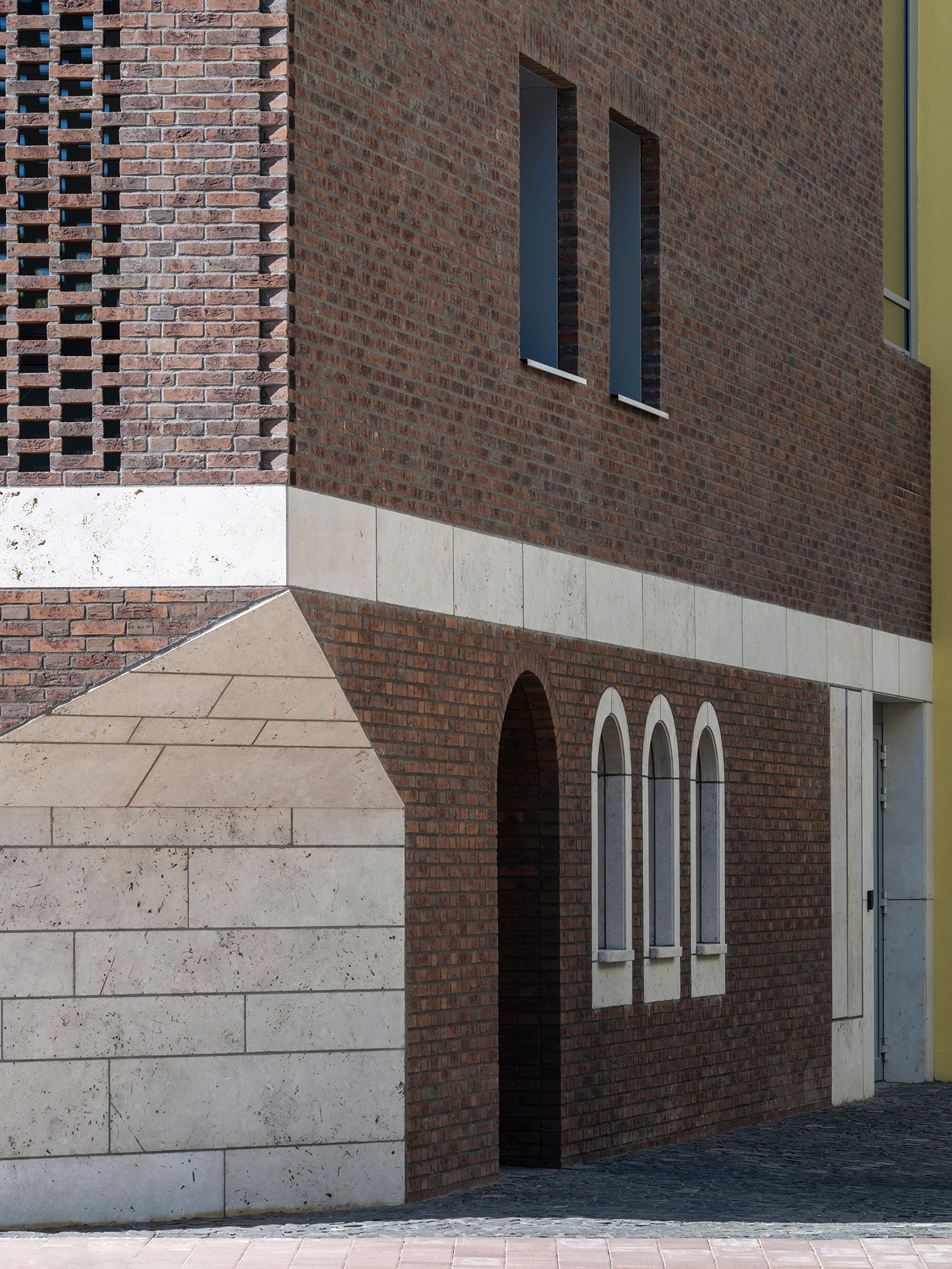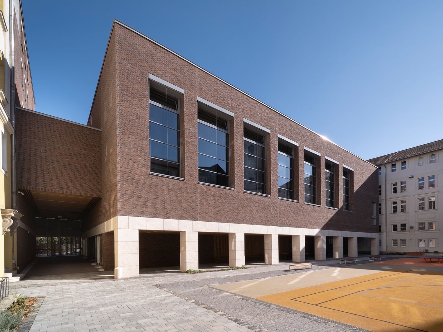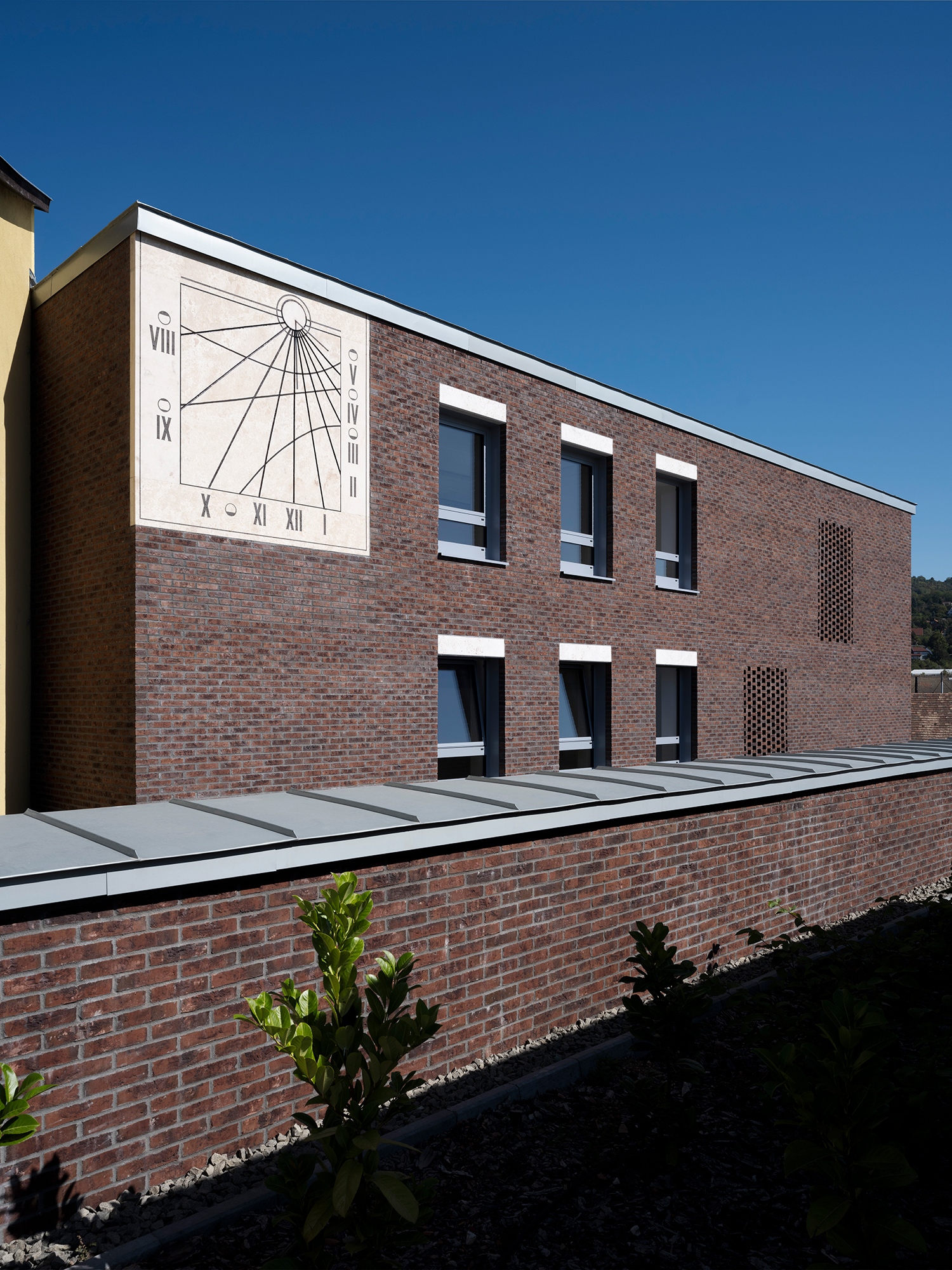 A sarok negatív kiharapásában is mintha egy régvolt kor házteteje elevenedne meg egy pillanatra. Az épülettömeg formai megmunkálása, az anyagváltások, az üvegfelületek arányai mind az épület funkcióit fejezik ki építészeti eszközökkel. A tornacsarnok, bár közvetlenül nem látszódik az utcáról, mégis mintha meg lenne „említve” azáltal, hogy tömbje az utcai síktól hátrahúzva kiemelkedik. Egy téglákkal függőlegesen sávozott bevilágító fut végig és hívja fel a figyelmet, hogy itt belül valami más történik.