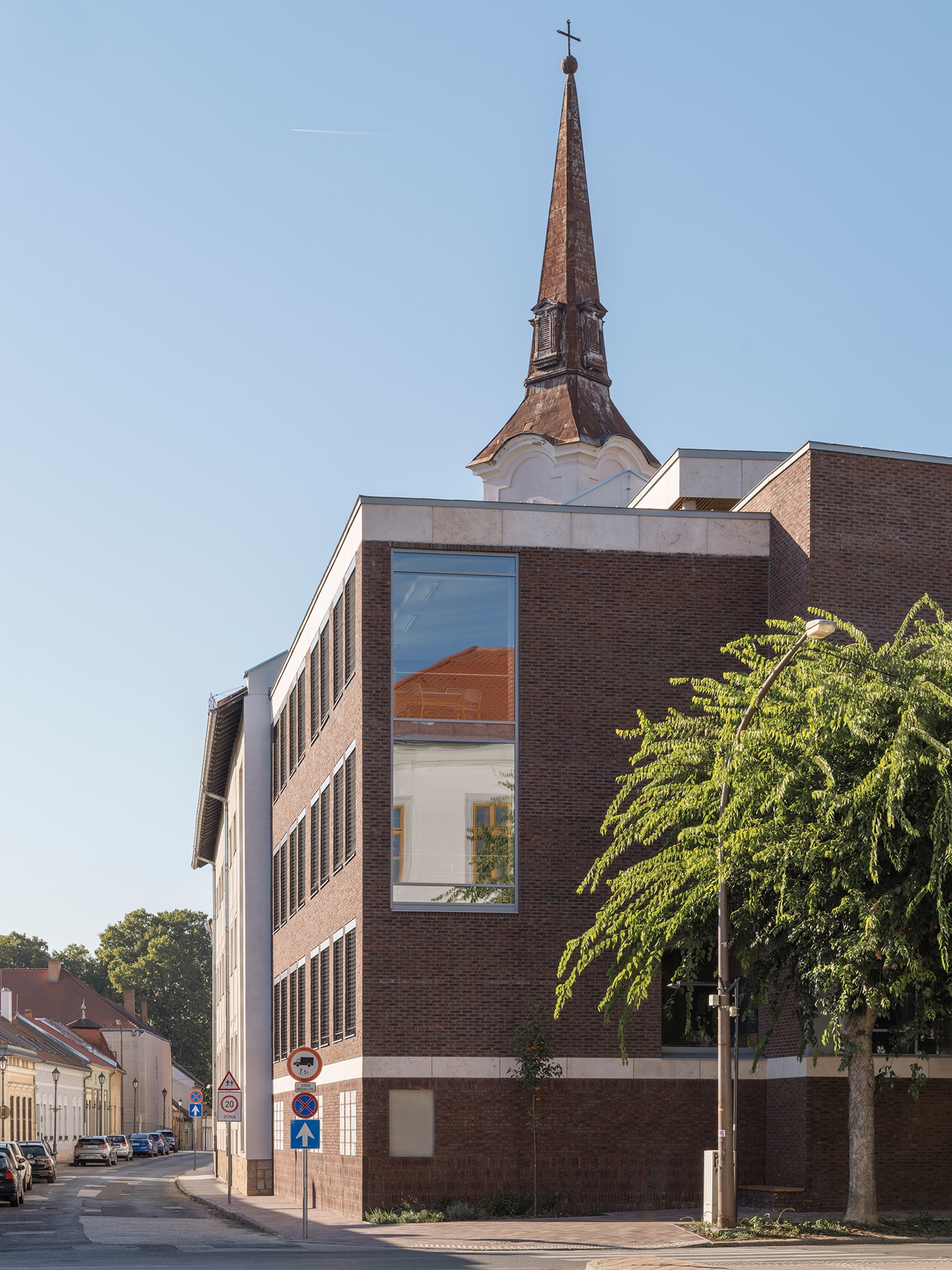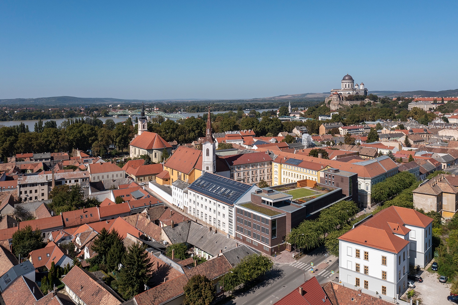 A kiegészített-befejezett épülettömb hatása az intézményen túlmutató, a bővítés városépítészeti tett, talán nem túlzás azt állítani, hogy Esztergom arculatához is hozzátett valamit, hiszen az iskola a Kossuth Lajos utcában helyezkedik el, amely a város főutcájának tekinthető. Tehát jelentős helyen áll az épület, és a bővítés után méreteit tekintve a város legnagyobb épületeinek sorába lépett. Az iskola évtizedeken át egy csonka, befejezetlen épületnek hatott, látványában az iskolai és a kollégiumi szárny két hatalmas tűzfala volt meghatározó. Az új épületszárny az iskolai és a kollégiumi tömböt immár összeköti, így az utcai térfal kiteljesedett. Az elkészült bővítés bátran, mai építészeti nyelven szólal meg a történelmi belváros házainak szomszédságában. Sötét téglaburkolat fedi a teljes épületet (talán még a szerzetesi ruha színére is utal), ezt ellenpontozzák több helyen a nyílászárókhoz kapcsolódó fehér mészkő betétek, illetve az udvari árkád fehér oszlopai. Mintha nagy tömbökből lenne kifaragva az épület, de az érzékeny gesztusok végül emberléptékűvé szelídítik.