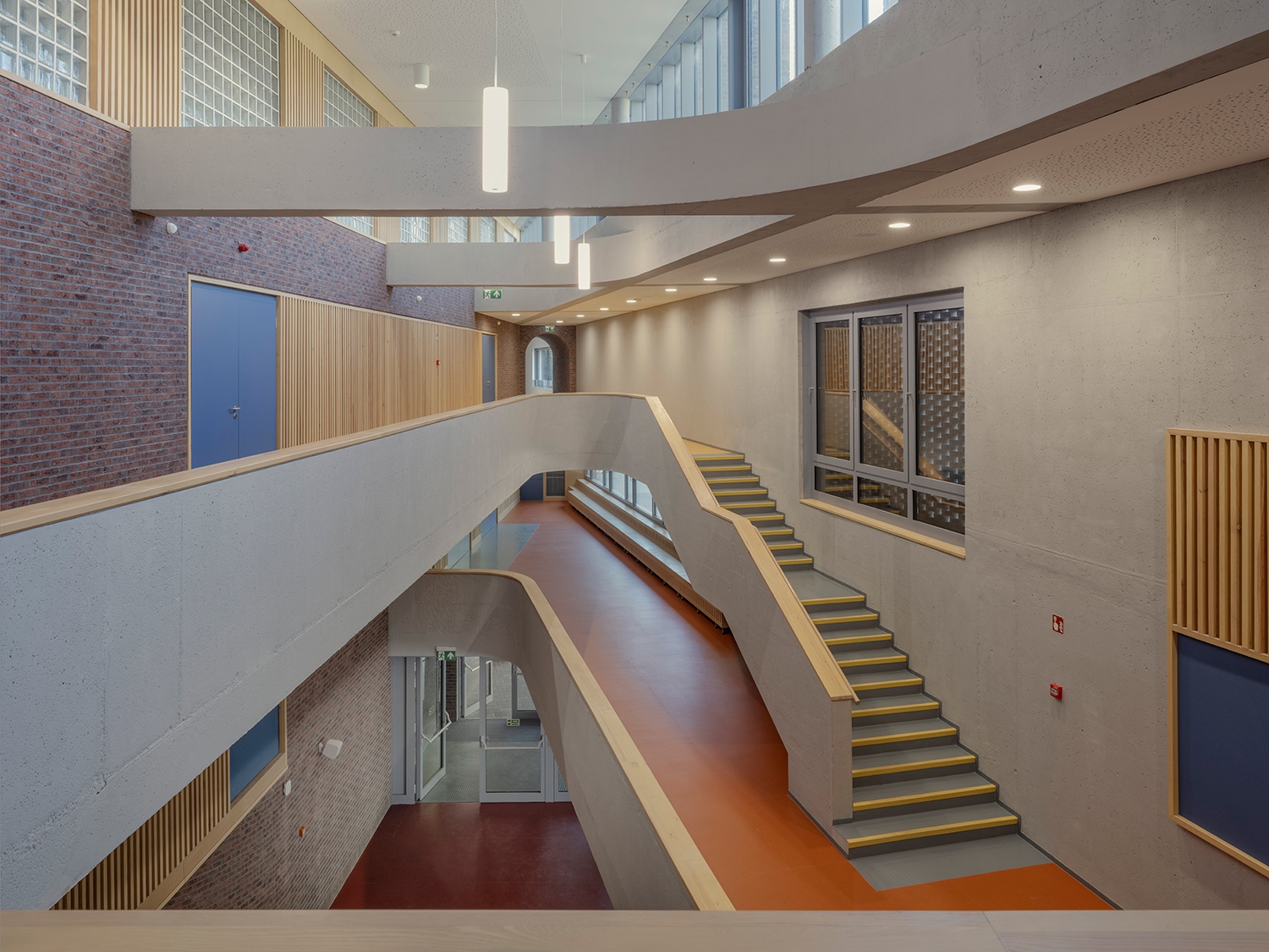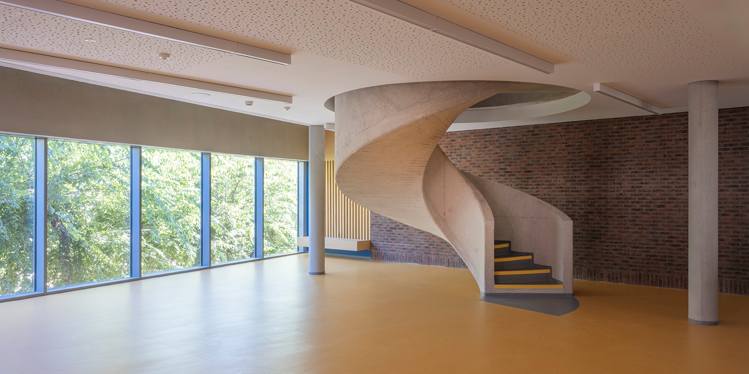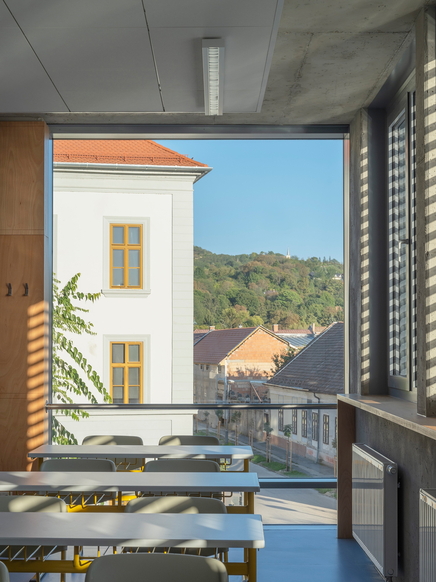 A közlekedőszintek teraszos elrendezése átláthatóvá teszi a teret, ugyanakkor a födémek több helyen közösségi térré szélesednek. A második emeletről a harmadikra szoborszerű csigalépcső vezet, valamint ezen a szinten nyílik átjárás a kollégium felé egy boltíves átjárón keresztül. Az épület mélyebb traktusaiba is világosságot tudtak hozni a tervezők egy vertikális fényakna segítségével. Az iskolai szárny bővítésével 6 új tanteremmel lett gazdagabb az oktatás. Igényes berendezést vehettek birtokba a diákok. A nagy ablakfelületeknek köszönhetően átjárja a fény a termeket.