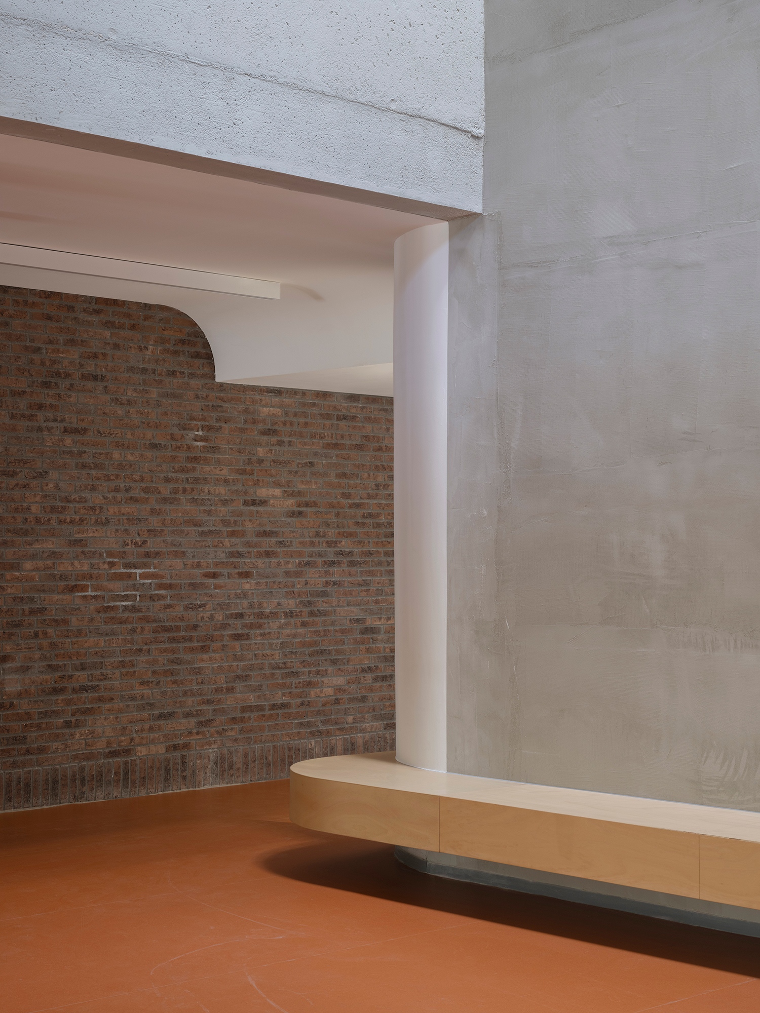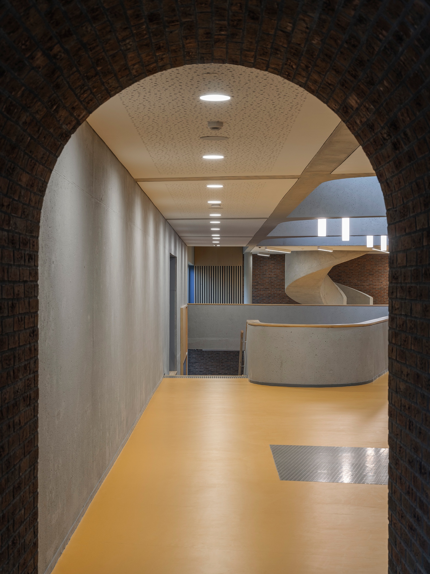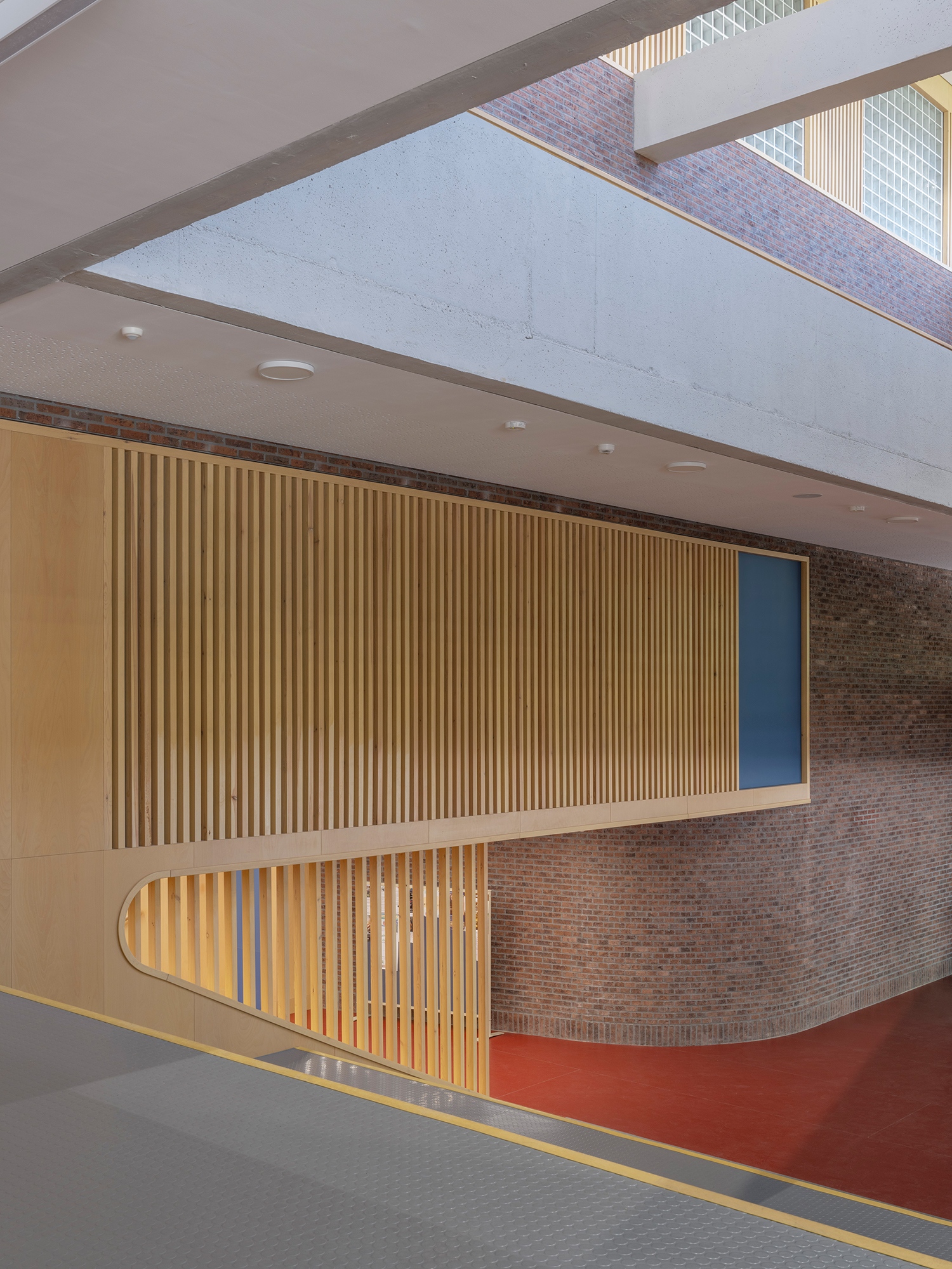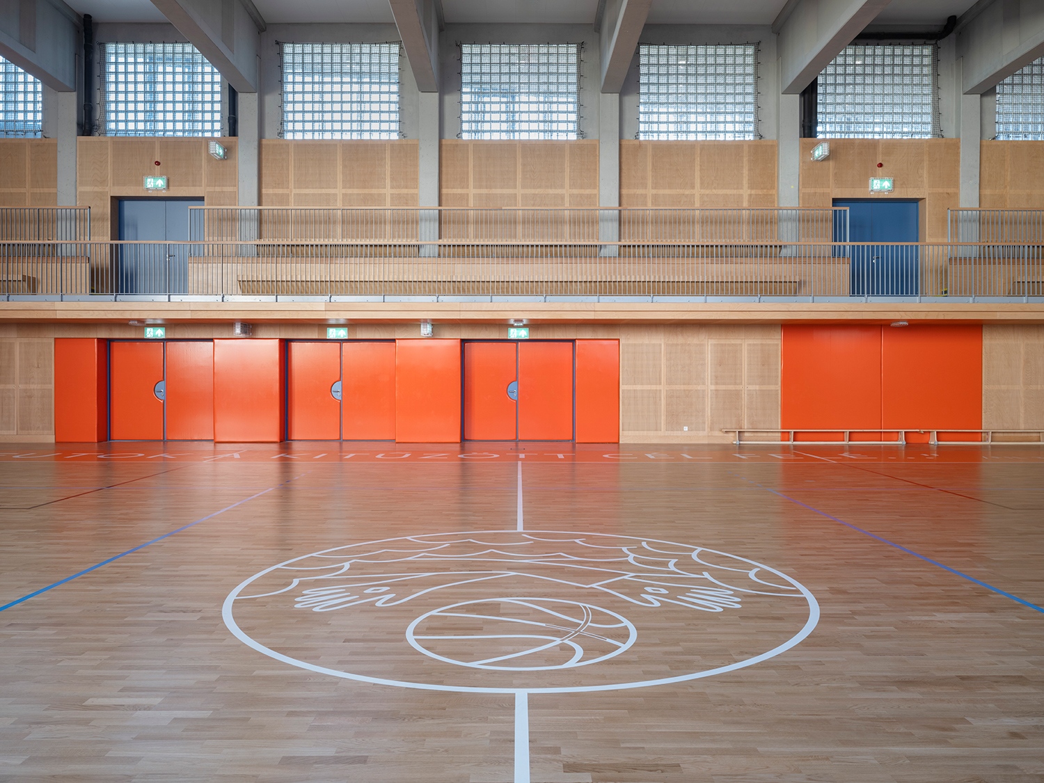 A színek és burkolatok hierarchiájában az első és legdíszesebb a tornacsarnok fala, melyet tégla- és faburkolat is öltöztet. Semleges háttérként az utcai fal meleg betonszíne szolgál. Az ív mint motívum többször is megjelenik, horizontális és vertikális elrendezésben, összességében izgalmas térbeli formajátékot teremtve. Az ívesen záródó lépcsők és teraszos közlekedők tektonikusan épülnek egymásra, az íves motívumok a legfelső szinten az utcai falat hátrakötő vasbetongerendákban jelennek meg, amelyek tartószerkezetből díszítőelemmé nemesednek. Már a megérkezéskor kitágul és húz felfelé a tér vertikális dimenziója. Fent hatalmas bevilágító ablaksávon árad be a fény.