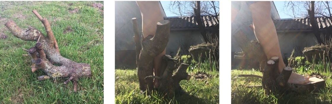 A második csoport darabjaiból származó alapanyag lehetővé tette a teljes talp kialakítását. A közterületre átnyúló eperfákat az ELMŰ éves szinten „újraformálja” (a fák megcsonkítása az antropogén tevékenység testközeli megtapasztalása számomra), s ennek következtében számos olyan leeső, nagyobb méretű fadarabot találtam, amelyek megfelelőnek bizonyultak a tervezéshez. Ezekben fedeztem fel leginkább az emberi lábfej és a vádli arányait, helyét, így ezeket az emberi testformát idézve alakítottam ki, s hagytam meg rusztikus mivoltukban.