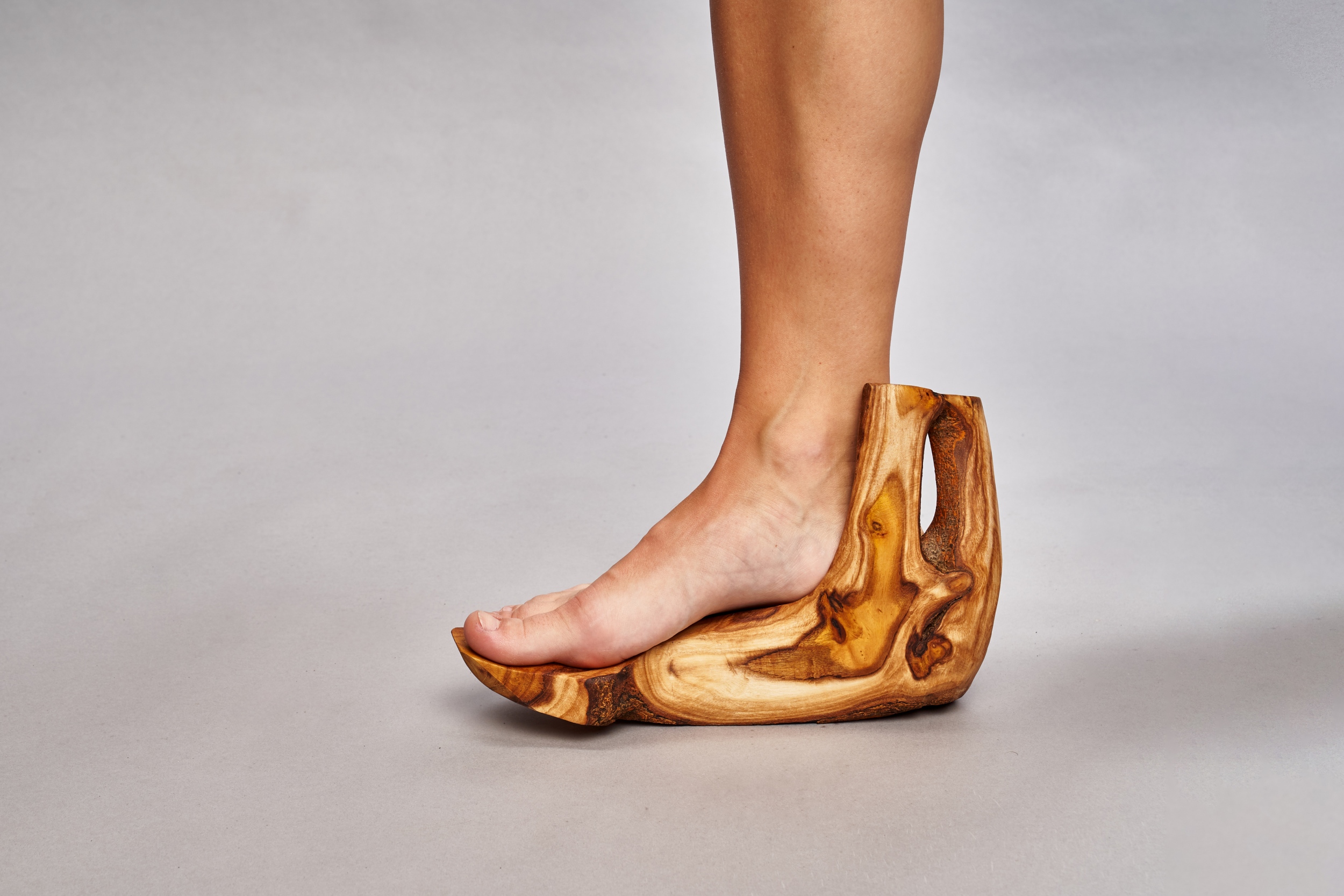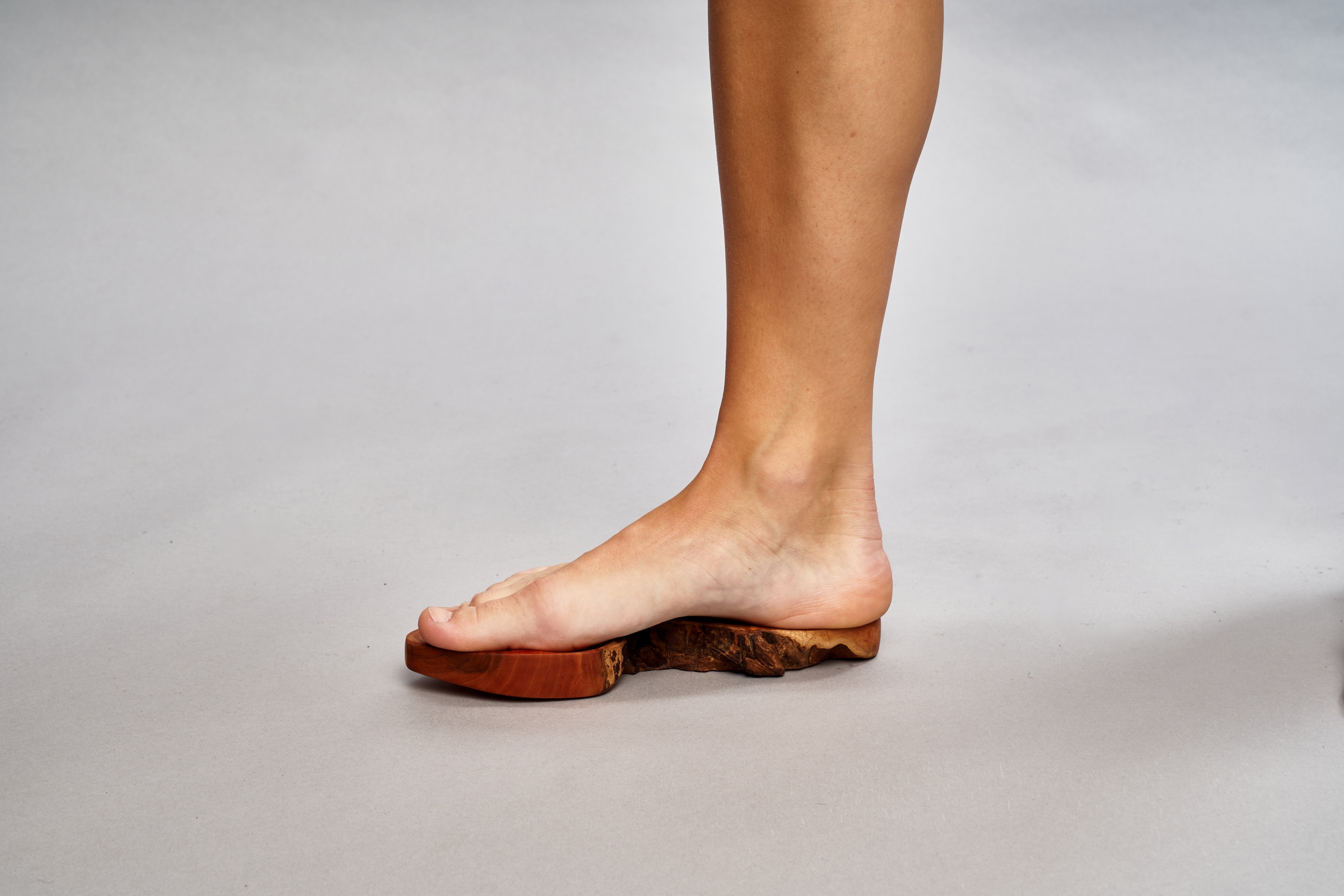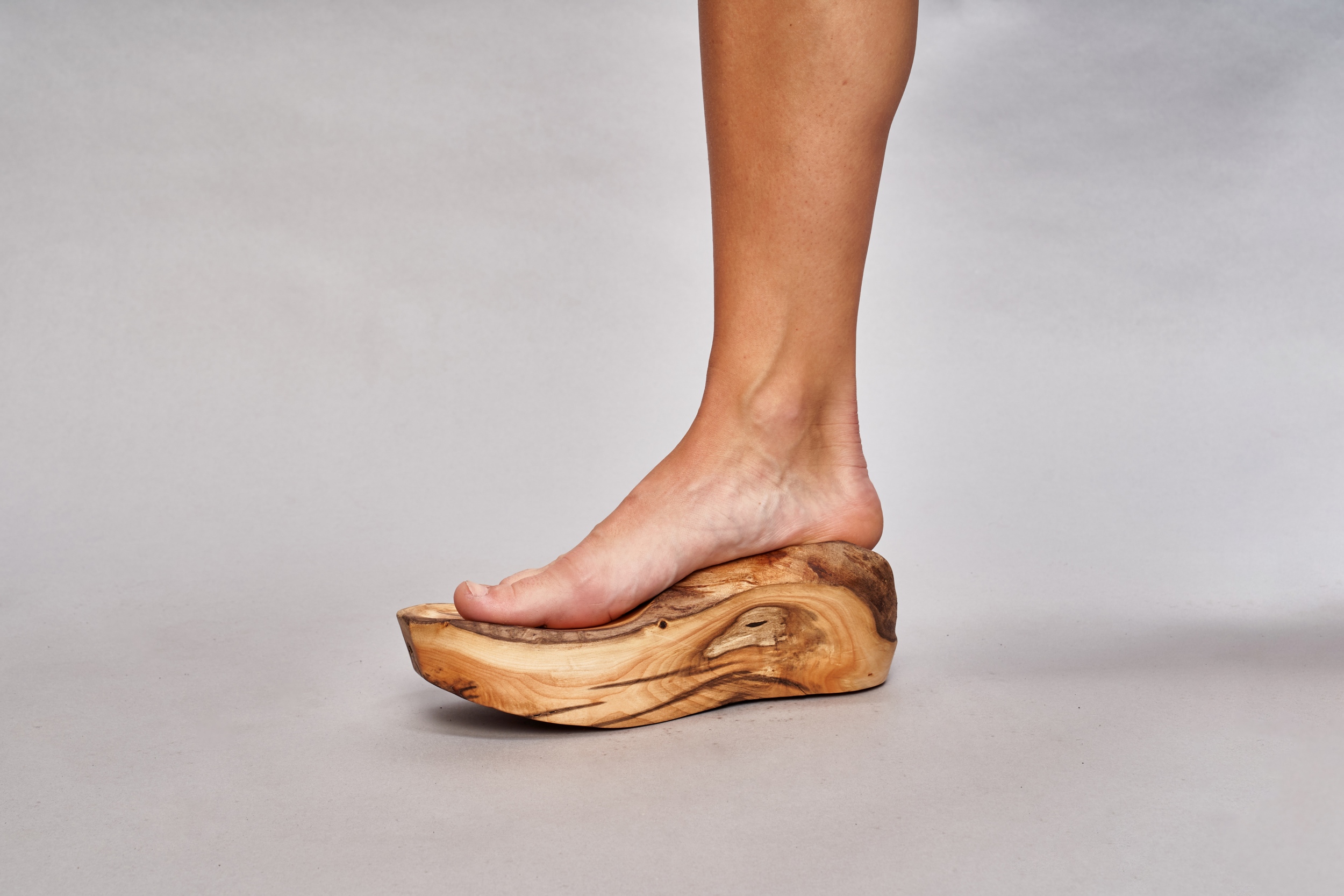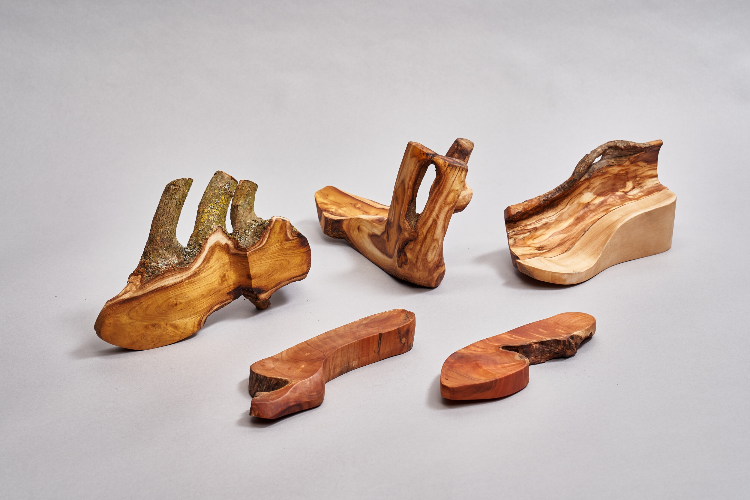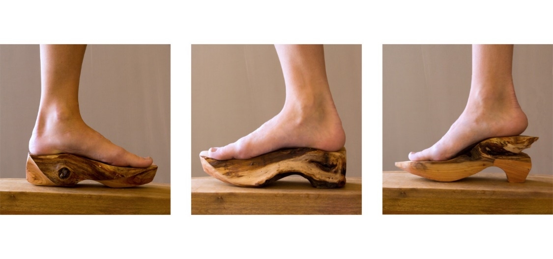 A harmadik csoport fái, az ártéri füzek pedig már a feldolgozás közbeni összpontosított formai megfigyelés eredményei során gyűjtött darabok, amelyek a végleges tárgycsoport alapanyagaként szolgáltak. Ezek megmunkálása során vegyítettem a rusztikus (a lábfej és talpboltozat anatómiájának leginkább megfelelő) részeket az általam meghatározott (a saját formavilágomra jellemző) megmunkált, csiszolt részekkel. Ezek a darabok már a cipők talpformáinak íveit, síkjait idézik.