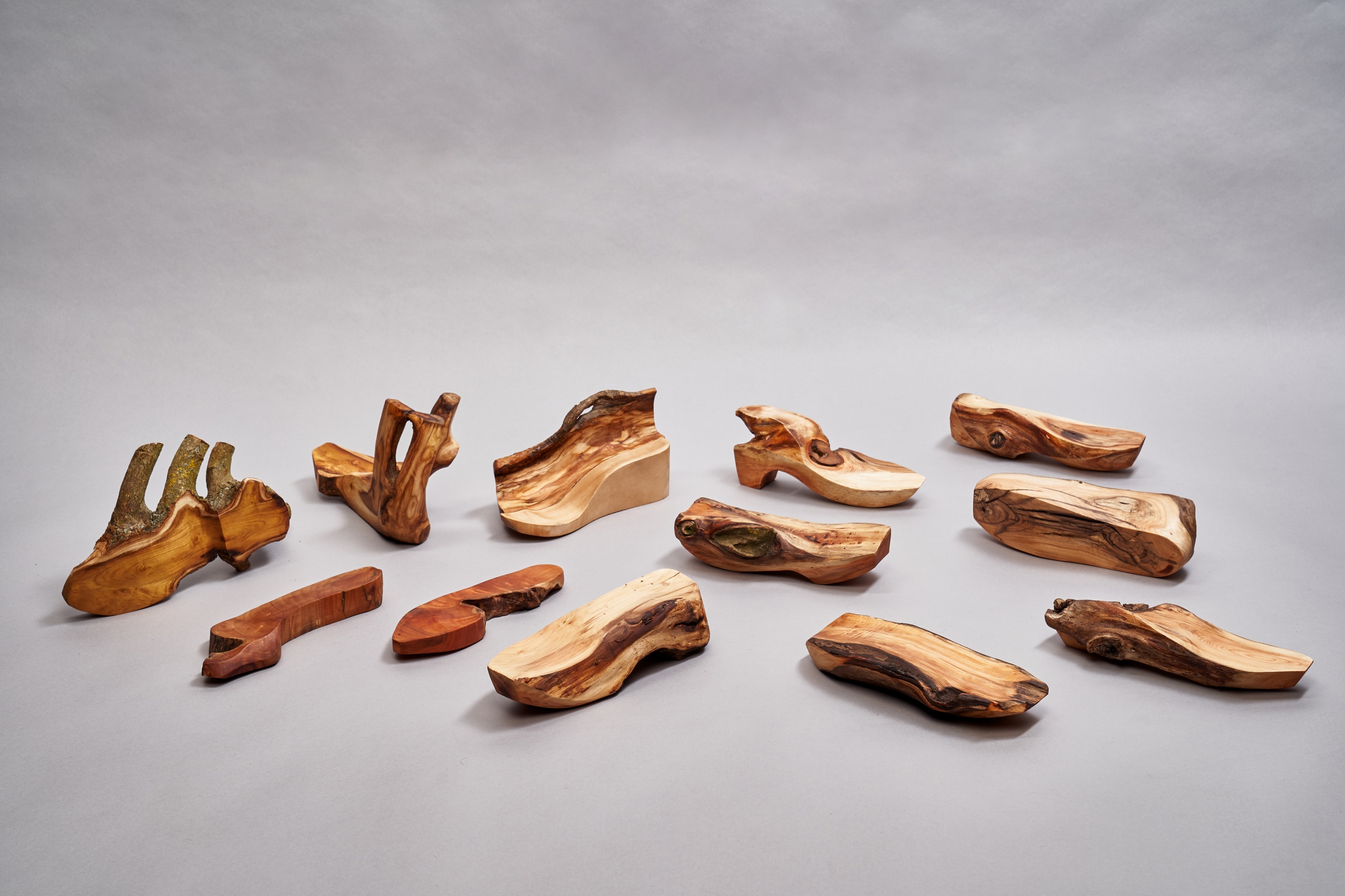 Az első csoport darabjai a környezeti hatások következtében és a korhadás megkezdődése miatt nem tették lehetővé, hogy teljes talpakat alakítsak ki belőlük, így ezeket később a kivitelezés során úgy egészítettem ki, hogy a hozzá épített darabok felerősítsék a természet által kialakított rusztikus felület és forma esztétikai, anatómiai és funkcionális tulajdonságait. A kiegészítéshez egy cipőgyárból kaptam leselejtezett fatalpakat, így ennek a csoportnak a fáit (főleg kőris) ezekkel dolgoztam össze.