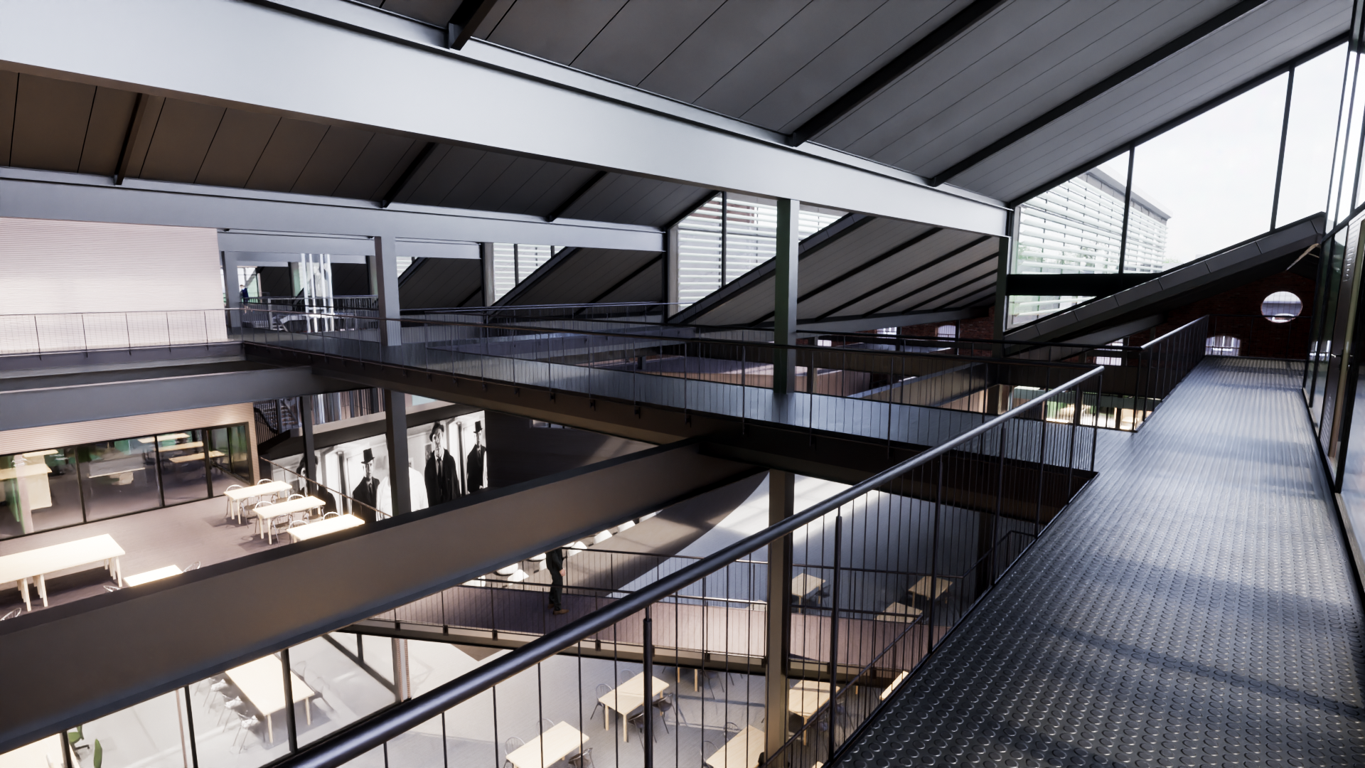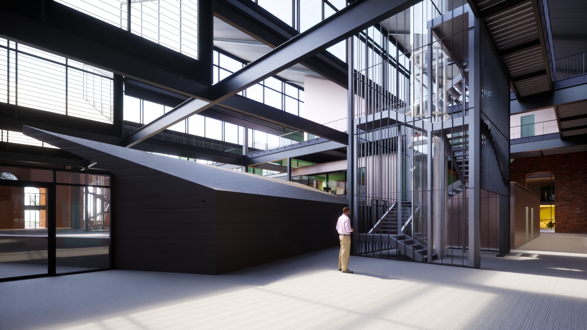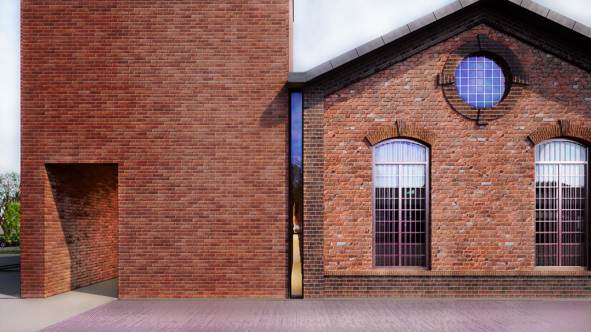 A másik hozzáépítés az épülethez a megérkezés oldalnál történik, ahol egy nagy léptékű bejárat és kiállítótér kapott helyett, Az épület eredetileg nem rendelkezett ilyen bejárattal, hiszen csak egy gyártócsarnok volt a sok közül. Ennek megoldására a meglévő épület sorolásos, additív rendszerének elvei mentén hozzátettem még egy egységet, a bejárati árkádsort, amely mögött a kiállítótér található.