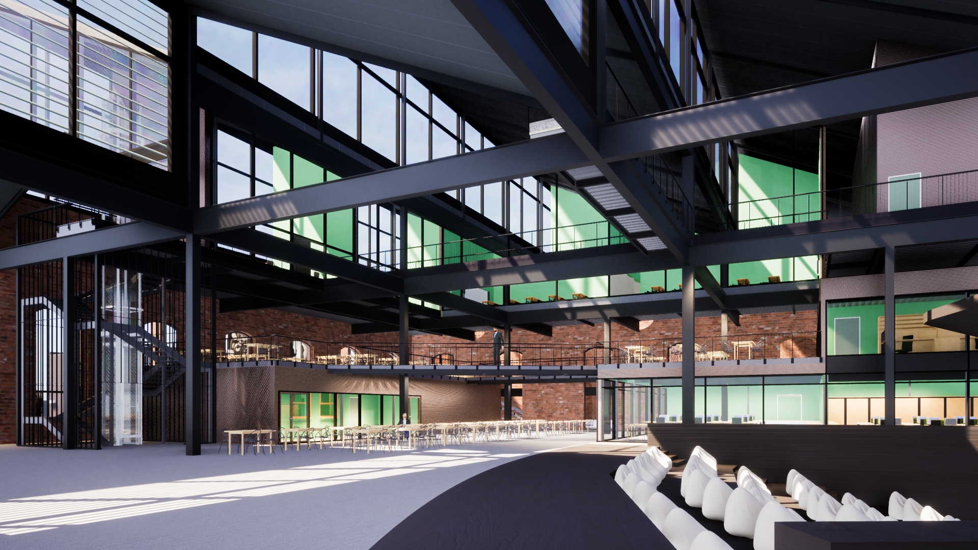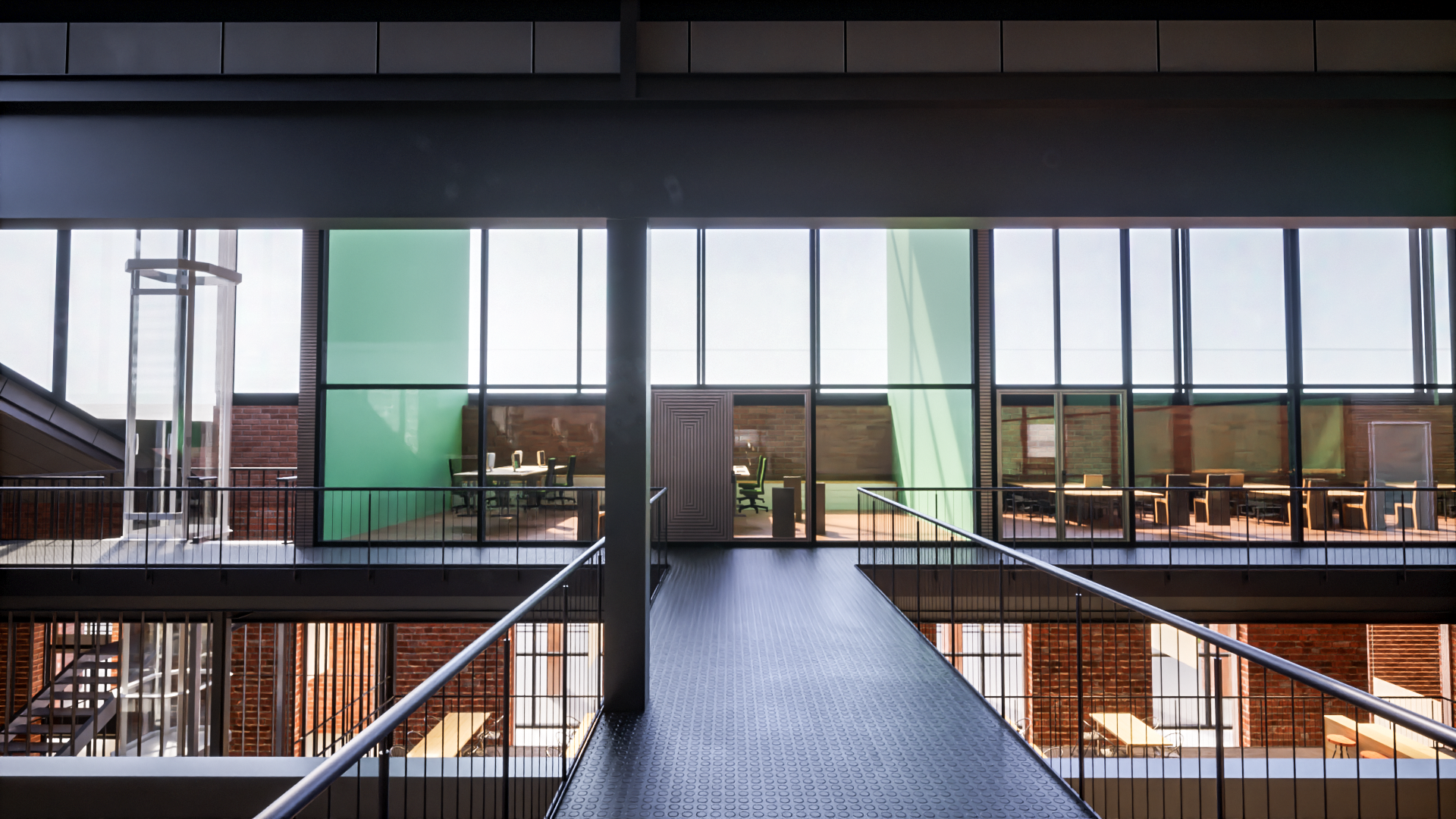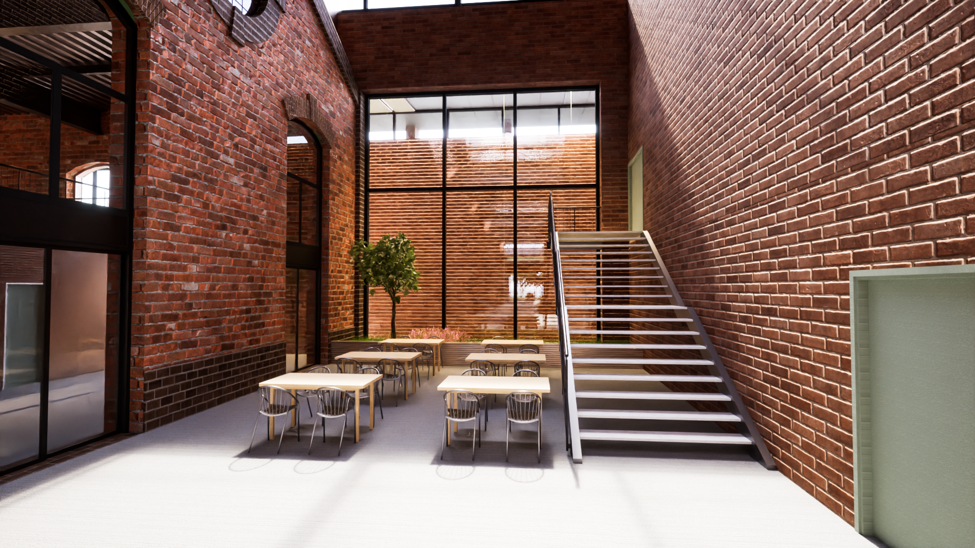 A másik hozzáépítés az épülethez a megérkezés oldalnál történik, ahol egy nagy léptékű bejárat és kiállítótér kapott helyett, Az épület eredetileg nem rendelkezett ilyen bejárattal, hiszen csak egy gyártócsarnok volt a sok közül. Ennek megoldására a meglévő épület sorolásos, additív rendszerének elvei mentén hozzátettem még egy egységet, a bejárati árkádsort, amely mögött a kiállítótér található.