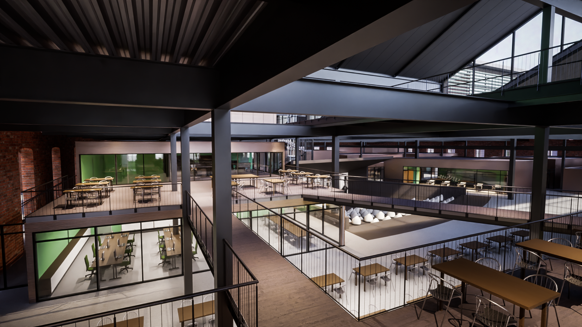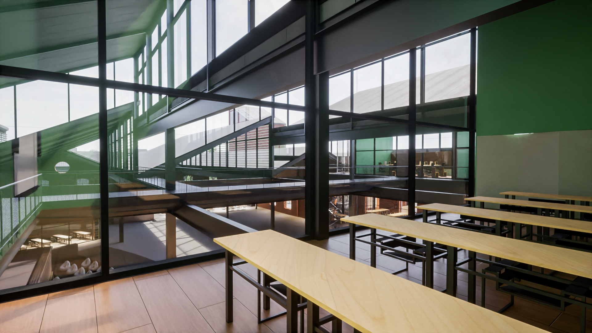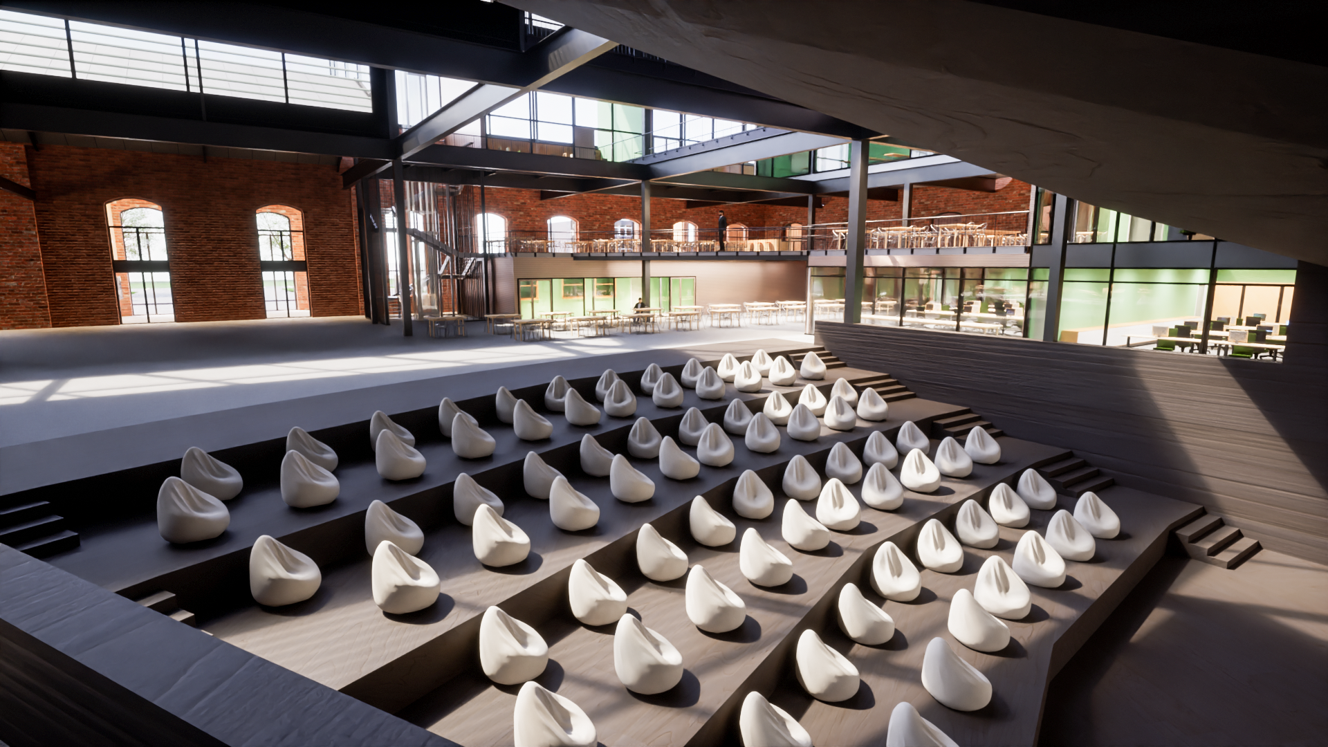 A meglévő épület belsejében a „stúdióváros” helyezkedik el, amely a belső tér erősségeire épít. A téren belül különböző méretű boxokba kerültek a funkciók, amik a lehető legnagyobb elvi tisztasággal kerültek megformálásra, belsejük a legalapvetőbb elemi igénykört szolgálja ki (mosdóblokk, lakatosműhely, stúdiótér stb.). A belső a régi stúdiók (stúdióvárosok) felépítési rendszerét képezi le, mindezt egy nagy belső térben, a város egy-egy épületének egy-egy box felel meg. A megérkezéshez legközelebb, felül, az étkező és vetítőterek kerültek be, középen egy nagy közösségi térrel, ami egy kvázi belső parkként jelenik meg a középső bejárati tengelyben. Lent, bal oldalt a sín mentén raktárak, felettük műhelyek kaptak helyet. Lent, a jobb oldalon egy belső kis stúdiótér található, kicsit zártabb kontextusban, körülötte irodák és a számítógépes feldolgozás terei. Az emeletre az oktatási funkciók, valamint a stúdió menedzsment és a könyvelés irodái kerültek.