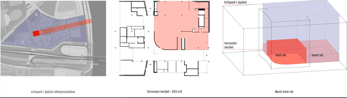 Az Infopark I épületének belső átriumos tere benti-kinti térként értelmezhető, így a tervezési terület átriumban lévő része kinti térként, az alacsonyabb belmagasságúak benti térként jelennek meg. Új közlekedési útvonalak kialakításával, vizuális és fizikai térfalak használatával tagoltam a rendelkezésre álló teret. Az egységek városi helyek után kapták a nevüket: Főtér, Park, Piac, Árkád és Bistro.