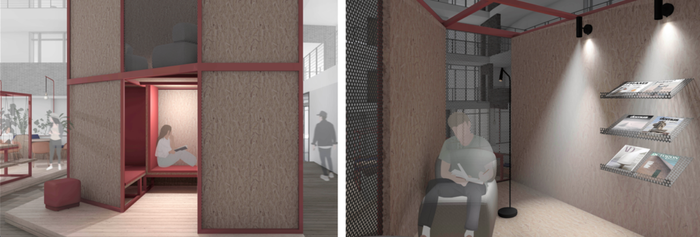 A fiatalok táplálkozási, étkezési és tanulási szokásaiból vezettem le a térhasználatot. Az egyes funkciók nem tisztán, hanem keveredve jelennek meg a helyszíneken, viszont mindegyiknek van egy fő hangsúlya, és a térbeli kapcsolat adta szinergiákat is jól hasznosítják. Az új kialakítás kismértékű beavatkozást igényel a meglévő struktúrákban, lehetőséget adva a későbbi rugalmas változtatásra. Nyersebb anyagokat – OSB lapot, perforált fémlemezt, zártszelvényszerkezeteket és betont használtam, ezeket puhítják a textilfelületek és a növények.