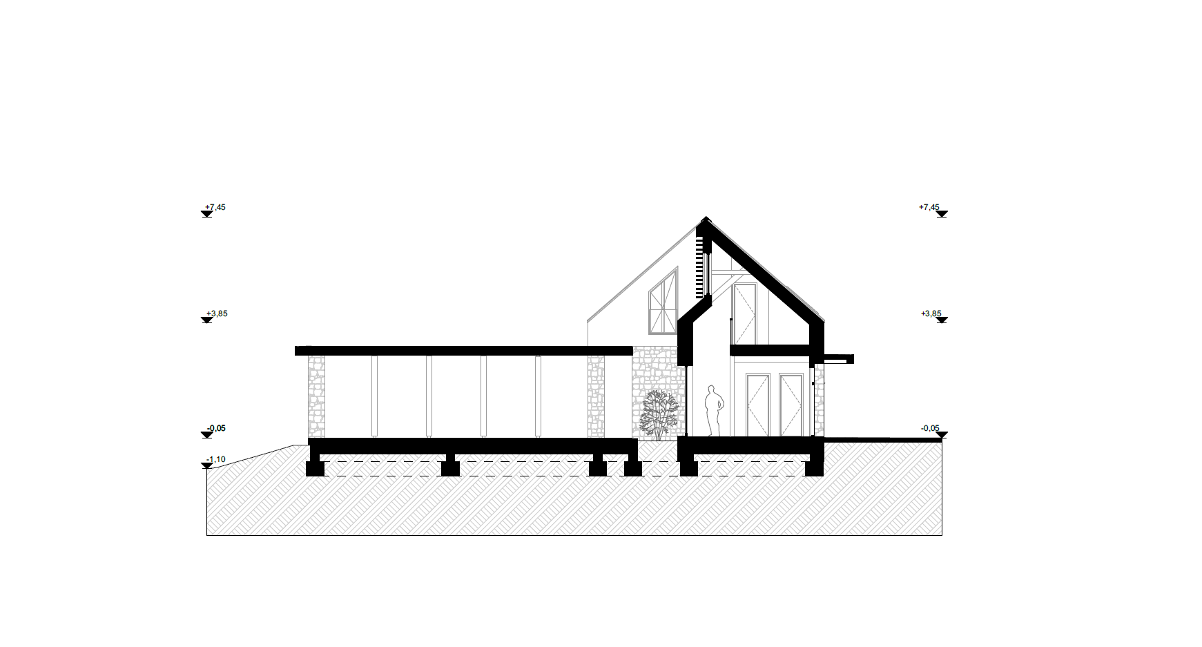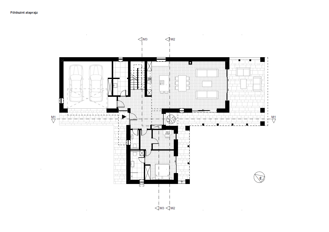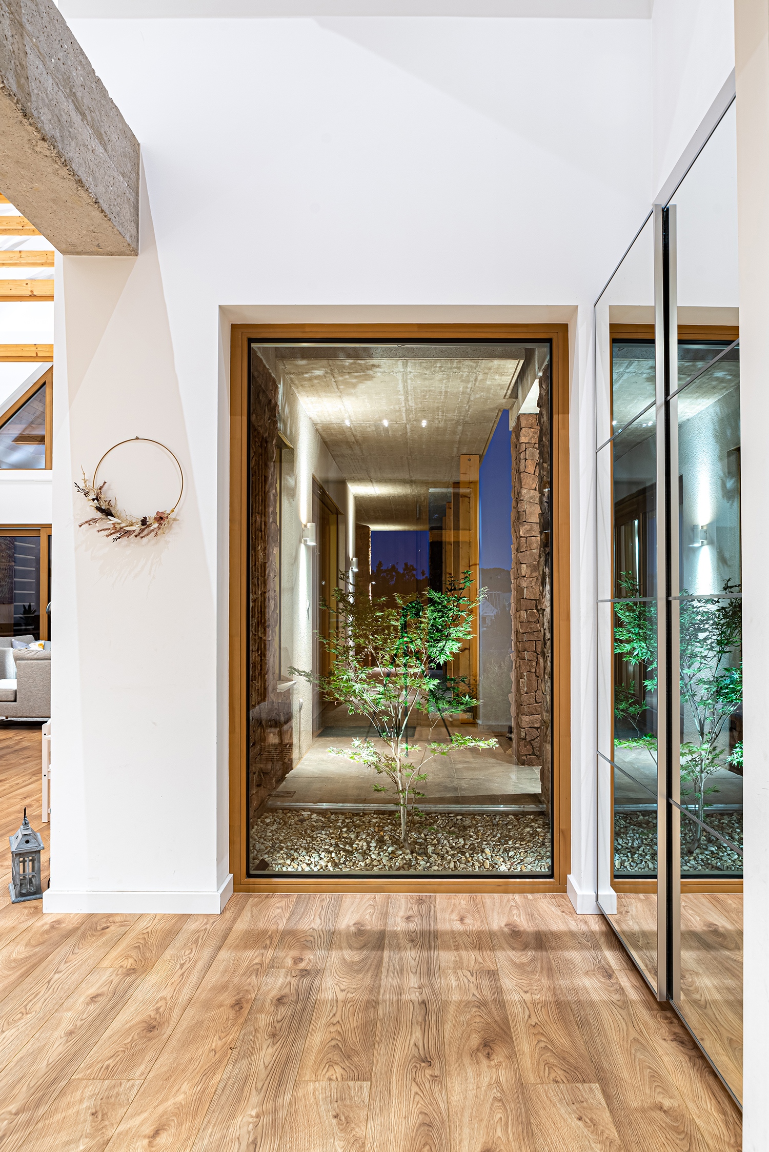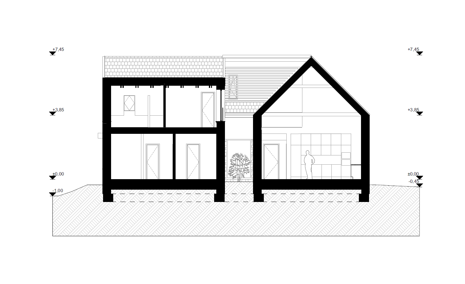 A külső és belső tér közti átmenetek a ház alaprajzi szerkesztésében is megjelennek. A T elrendezés központi magjára szervezték a közlekedést, az előkertből a belső térbe lépve könnyű a tájékozódás: egyből megtaláljuk a lépcsőt, a közösségi teret és a földszinti lakrészt, valamint a garázsba is közvetlenül be lehet lépni az előtérből. A tágas közösségi tér a konyhát, a nappalit és az étkezőt egyesíti, a látszó fedélszékes nagy belmagasság az emeleti galériával is vizuális kapcsolatot teremt. A tetőtérbe rejtve találhatóak meg a gyerekszobák, a szülői háló, a fürdő és a gardrób. A lépcsőről a galériára lépve a földszinti közösségi térbe, a fedett teraszra és a kertbe is átlátni, és ez a transzparens térszerkezet nemcsak a ház, de a család hétköznapi életének az egységét is megteremti.