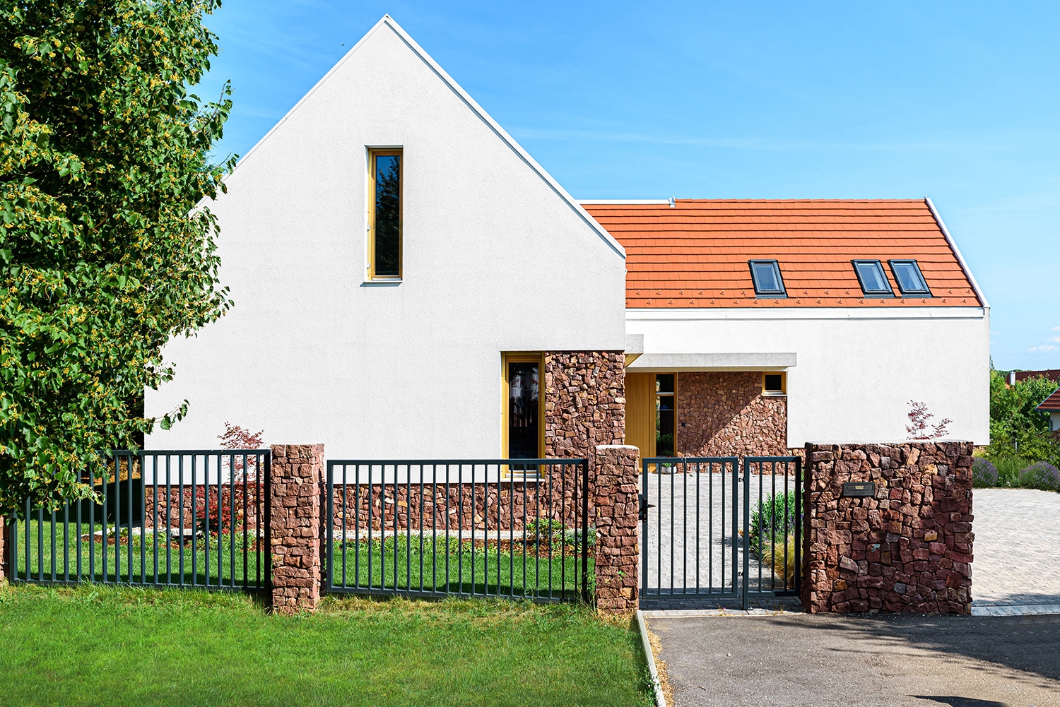 A tervezők stratégiája épp ezért a formák másolása helyett a szerepük újraértelmezésére irányult. A szabályozásnak megfelelően az épületet a telek közepén, szabadonállóan helyezték el, és két egymásra merőleges épületszárnyból egy T formájú elrendezést alakítottak ki. A telepítés a telket is két részre osztotta, az utca felől érkezők egy előkertbe léphetnek be, ahol a gépkocsitárolásra is lehetőség nyílt. A haránt irányú épületszárny határvonalat húz az előkert és a hátsókert közé, de a homlokzat megnyitásain keresztül vizuális kapcsolat alakul ki a kertrészek közt. A hátsó kert védettebb világában gyümölcsfák közt a gyerekek játszóterei és a felnőttek pihenőhelyei bújnak meg, miközben kilátás nyílik a Balaton-felvidék lankás hegyoldalaira.