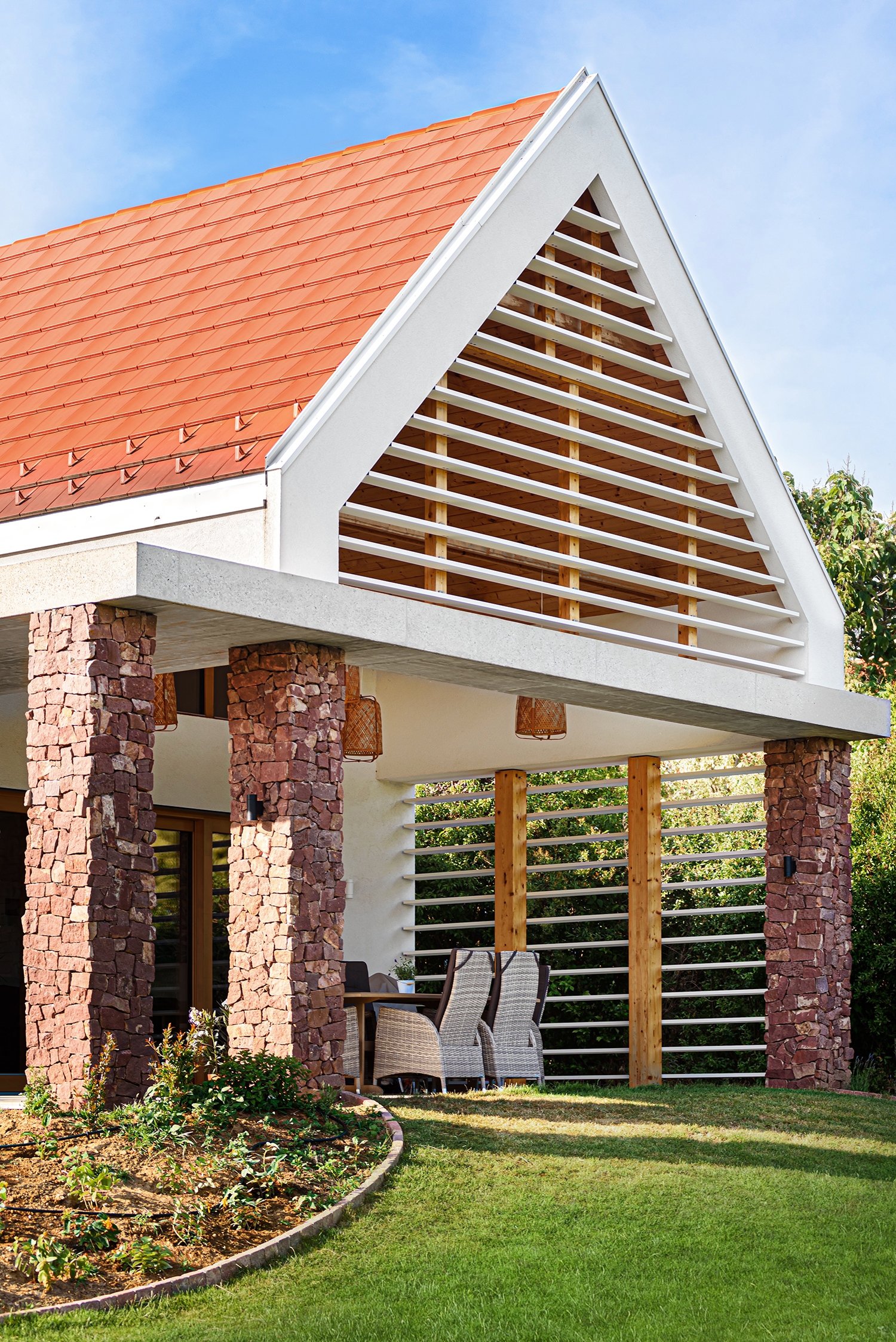 A ház karakterének megformálásában fontos szerep jut az átmeneti tereknek. A közösségi rész egy fedett teraszként nyílik meg a kert felé, a déli és délnyugati homlokzatokat pedig fedett külső közlekedők árnyékolják. A gazdag átmeneti térstruktúra a Balaton-felvidék vernakuláris építészetének tornácos házaira utal, de nem a formák másolásával, hanem a funkcionális és klimatikus szempontok figyelembevételével. A fedett terasz oromzatos kialakítása pedig a környékre szintén jellemző faszerkezetű verandák összetett térhasználatát idézi meg. A hely történetével az épület anyaghasználata is kapcsolatot keres, a jellegzetes vörös homokkő, a fehér vakolat és a fa egyaránt alakítják a ház atmoszféráját, miközben a korszerű látszóbeton-felületek egyértelműen kijelölik az építés időhorizontját. A hagyományos anyagok, formák és terek újraértelmezésével a ház már egy egyre inkább urbanizálódó táj autentikus elemeként jelenik meg.