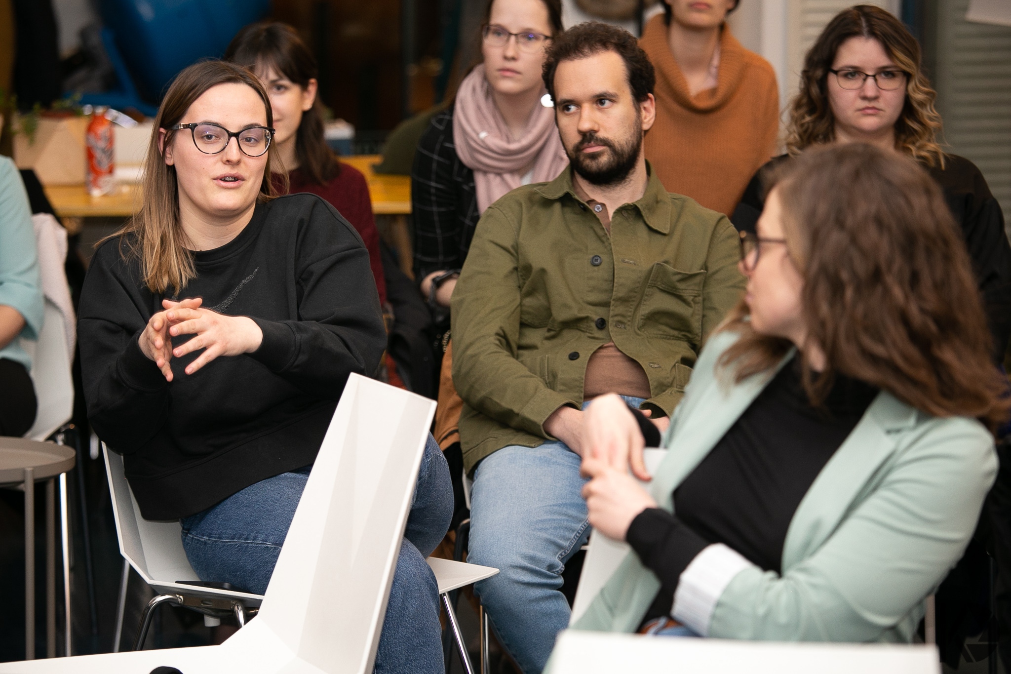 A beszélgetés ezen pontján bevonódott a közönség is, kialakult a klubhangulat, éppen a párbeszédről lett párbeszéd. A fiatal építészek a büszkeséget és empátiát említették, mint az építészek előtt álló akadályt. Király Zoltán ezt megerősítette egy építész-megrendelő párbeszédről hozott példával, ahol a szegény megbízó teljesen kiszolgáltatottan ül, mert az építészek nem fordítják le a mondandójukat számára értelmezhetően, helyette olyanok szavakat használnak, mint „térkompozíció”, meg eléjük tesznek számukra értelmezhetetlen terveket.