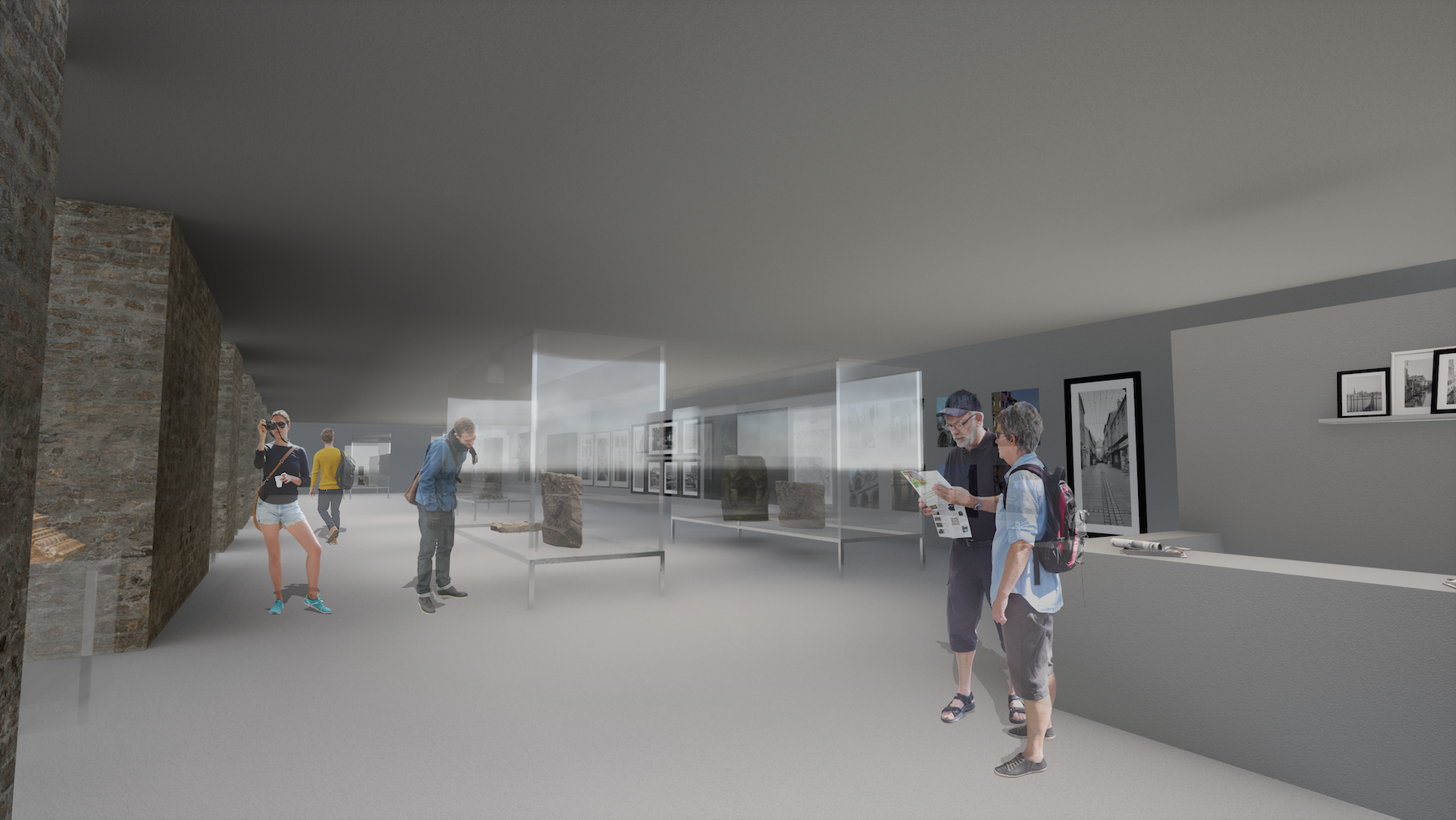 A süllyeszték kialakítása során a helyszíni adottságok befolyásolták a kontúr létrehozását, úgymint az egykori védfal vonala, a szemközti épületek helyzete, a templom helyzete, valamint a templomkert kialakult határai. Az így létrejött tér egy átmenet a városi köztér és a kiállítás között, egyfajta fogadótérként funkcionál, ahova az emberek akár a kiállítás megtekintése nélkül is bemehetnek, és időt tölthetnek el a tér végében elhelyezett vendéglátóhelyen.