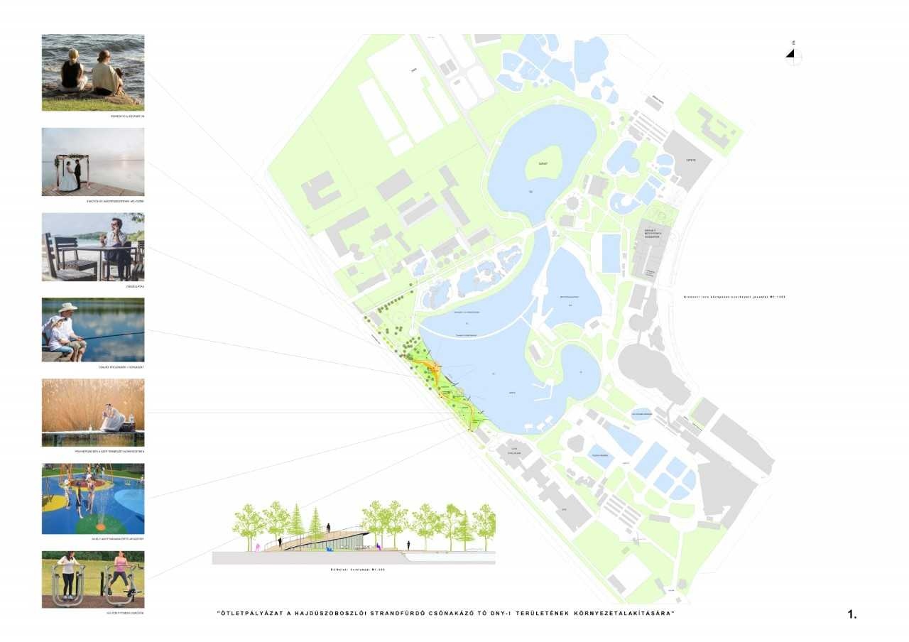 Az ötletpályázat tervezési területe Hajdúszoboszló legismertebb és legfrekventáltabb területén, a csónakázó tó partján, a strandfürdő szomszédságában található. A terület jelenleg a fürdő területéhez tartozik, a város szabadon bejárható közterületeitől kerítés választja el. Sétálójeggyel ugyan azok is bemehetnek és körbe gyalogolhatják a tavat, akik a fürdő szolgáltatásait nem veszik igénybe, mégis úgy tűnik, hogy a város életében jelentős lépést jelent majd, ha a tó ezen partszakaszán szabadon megközelíthetővé válik, a zöldfelületek pedig a városi közösséget és az ide látogatókat egyaránt kiszolgáló rekreációs területet képeznek. A ma látható természeti környezet komoly értéket képvisel, a ligetes karakter, a területet az úttól és a parkolóktól térileg finoman lehatároló, ugyanakkor az átközlekedést nem gátoló faállomány pedig kedvező adottság. Magával ragadó és sok lehetőséget hordoz magában a partvonal is, a tó vizének és a szárazföldnek a találkozása. A tervezés során ezért igyekeztek feltárni a meglévő értékeket és azokhoz illeszteni a fejlesztési javaslataikat.