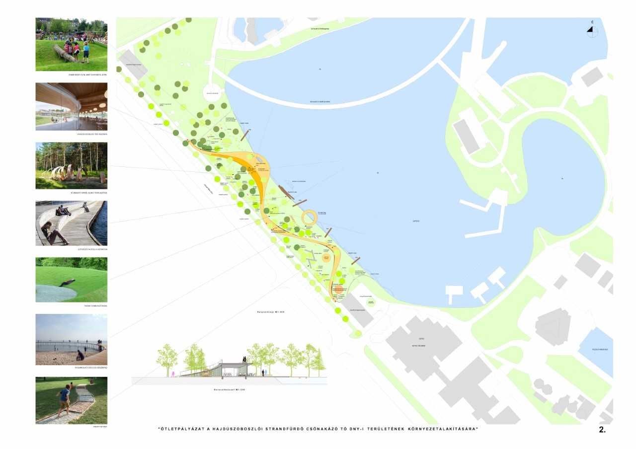 A fentiek szellemében mind a gyalogos útvonalat, mind a további köztéri elemeket úgy helyezték el, hogy a meglévő faállomány meg tudjon maradni. A gyalogos hullámvonal mentén szabadtéri fittness eszközöket, a tóparti környezethez illeszkedő, búvóhelyként és mászókaként is funkcionáló játszótéri hajót, víziszínpadot és üléseket, kilátódombot, kávézót, vendéglátó- és rendezvényteraszt alakítottank ki. A szárazföld és a vízfelület különleges élményt nyújtó határvonalán a víz fölé kifutó stégeket és a vízfelszínhez lelépcsőző, fafelületű dokkot terveztek. A ligetes részeken, a fák között, pedig különböző, természetközeli építmények: kneppl sétány, mélyedés híddal, átjárható spirál alakú térplasztika, háló megjelenésű mászókák, faanyagú, gömbszerű búvóhely járulnának hozzá a változatossághoz és a minőségi időtöltéshez.