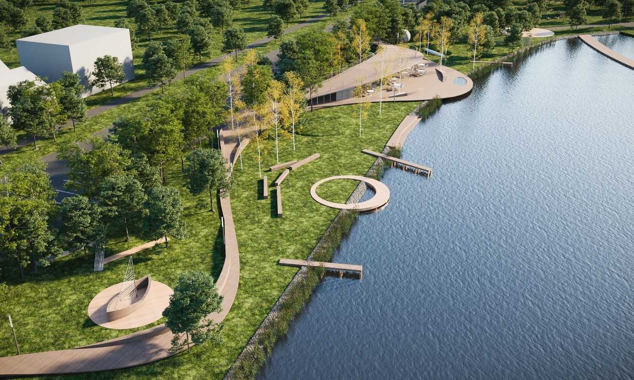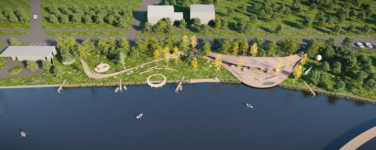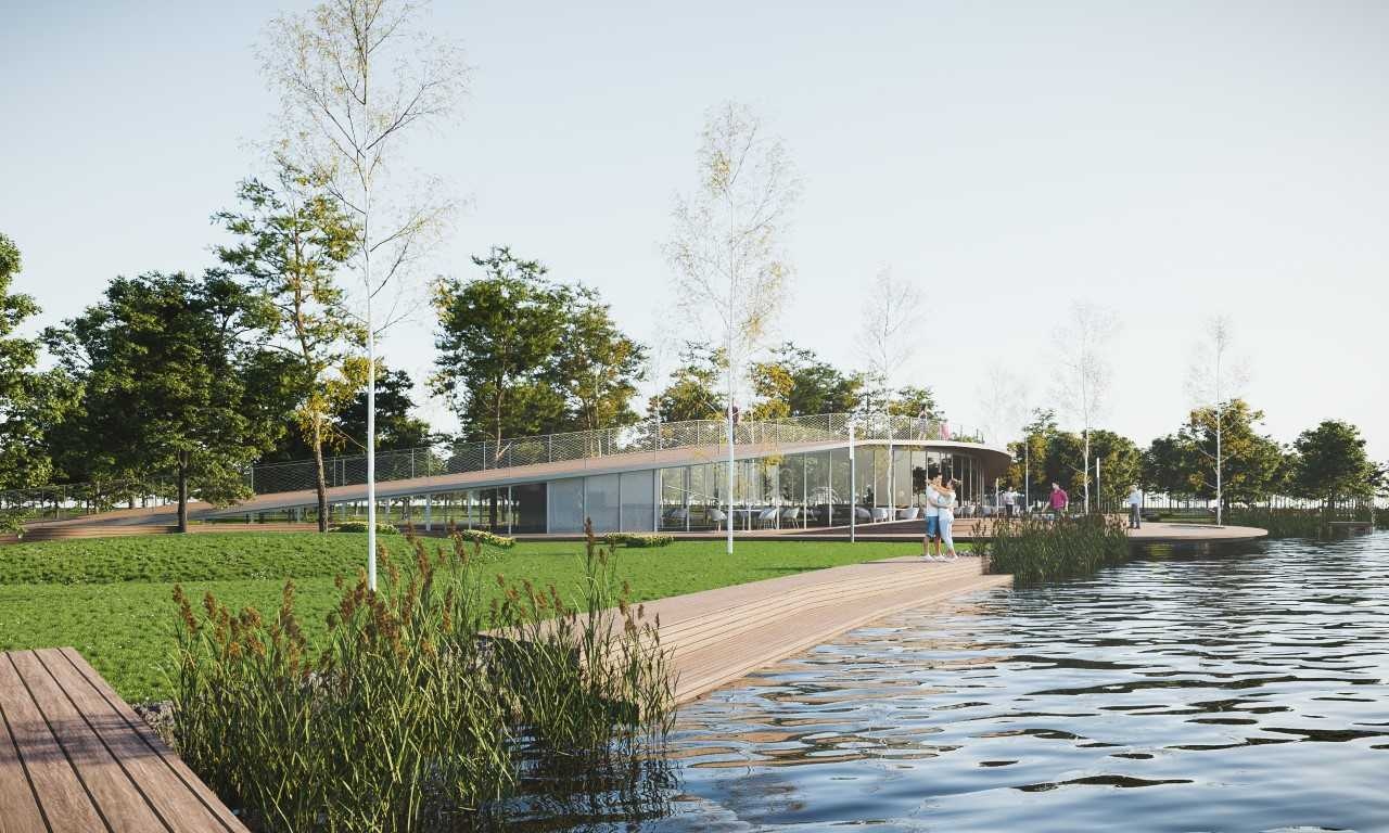 Az építésziroda fontosnak tartotta, hogy a vizuális kapcsolatokat erősítsék és új nézőpontokat tárjanak fel az idelátogatók előtt. A vízparti elemeket: stégeket, teraszt igyekeztenk úgy elhelyezni, hogy a tó környezetének értékeit, a karakteres partvonalat minél jobban lehessen érzékelni. A fentieken túl a terület északi részén, súlyponti helyen terveztek egy kávézó-, vendéglátó-, kiszolgáló épületet, mely a hullámvonalú gyalogos útvonalhoz illeszkedve íves alaprajzi kontúrral és szalagszerűen felhajló, járható lapostetővel készülne.