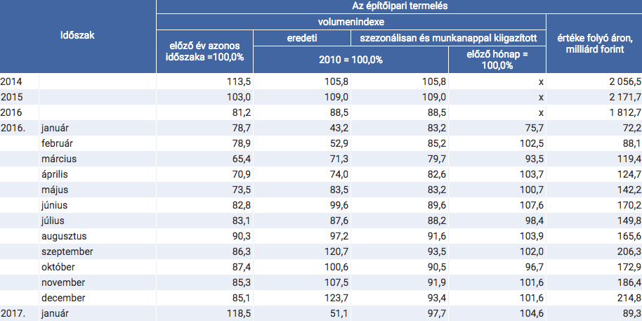 2017 januárjában az építőipari termelés volumene 18,5%-kal haladta meg az egy évvel korábbi alacsony bázist.