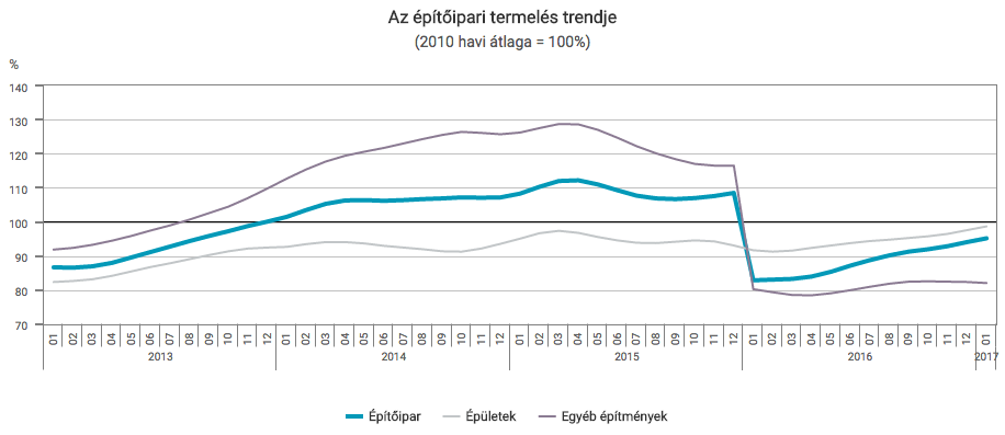 2017 januárjában az építőipari termelés volumene 18,5%-kal haladta meg az egy évvel korábbi alacsony bázist. A termelés a két építményfőcsoportban eltérően alakult: az épületek építése 32,8%-kal bővült, míg egyéb építményeké 3,0%-kal csökkent. A szezonálisan és munkanaphatással kiigazított indexek alapján januárban az építőipar termelése 4,6%-kal emelkedett az előző hónaphoz képest.