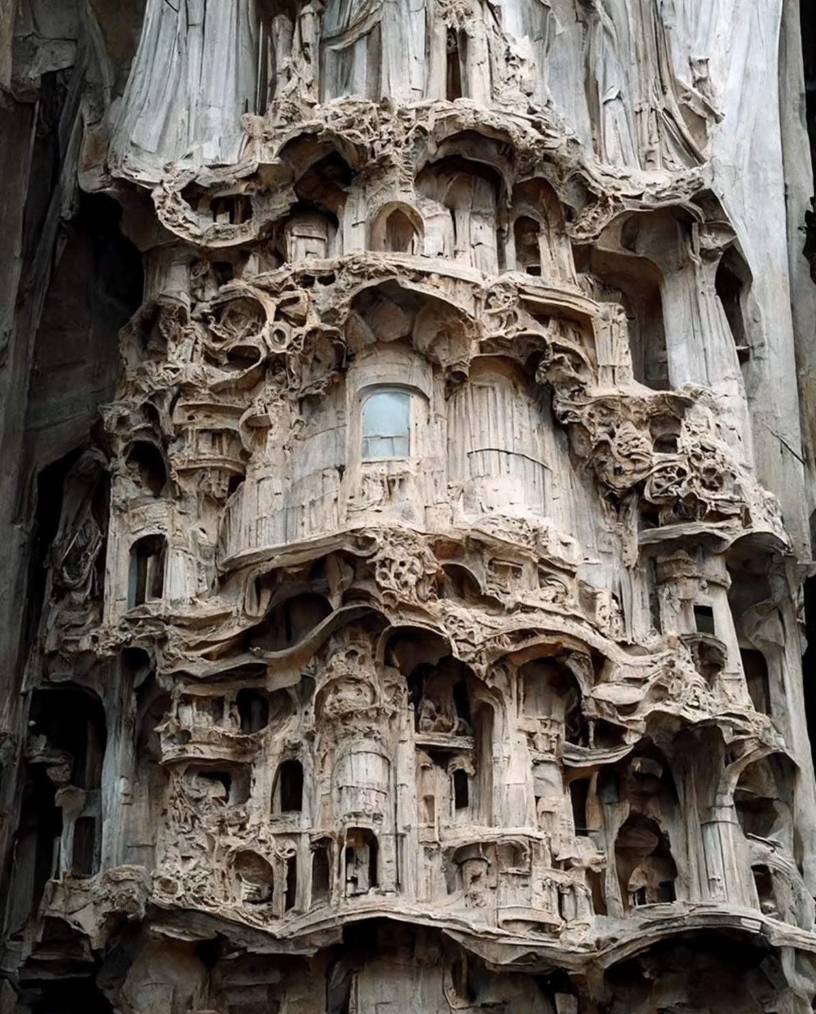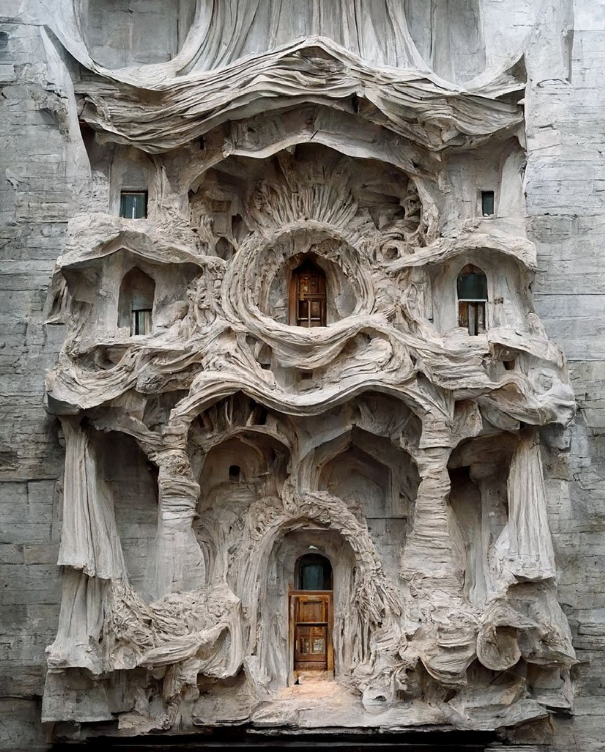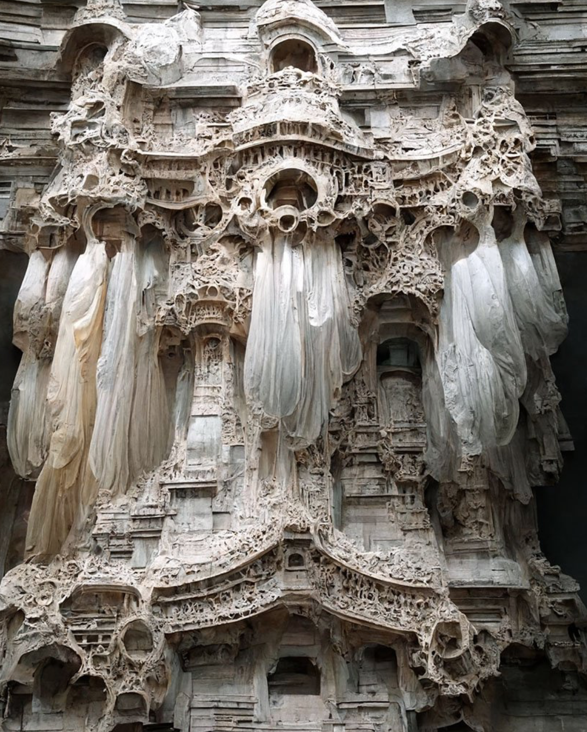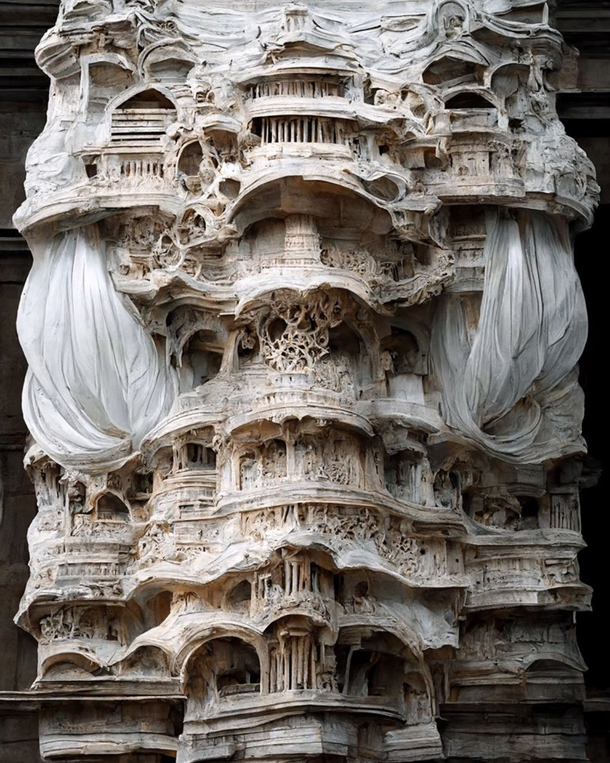 Mohammad Qasim Iqbal a Nottingham Trent University egyedi látásmóddal rendelkező építész hallgatója. 3D tervezői tapasztalatát az OCTOGON oldalain is több alkalommal részletezett (Absztrakt fáraók, Élő fában) Midjourney szoftverrel fejleszti. A mesterséges intelligencia segítségével mutatja be ideáját az újragondolt barokk stílusról: a rideg kőzetet lágy esésű selyemmel mossa össze. Az eredmény egy eddig nem létező, köztes anyag, ami előbb magába olvasztja mindkét matéria alapvető jellemzőit, ezután pedig egy szürreális vízióban tárja elénk.