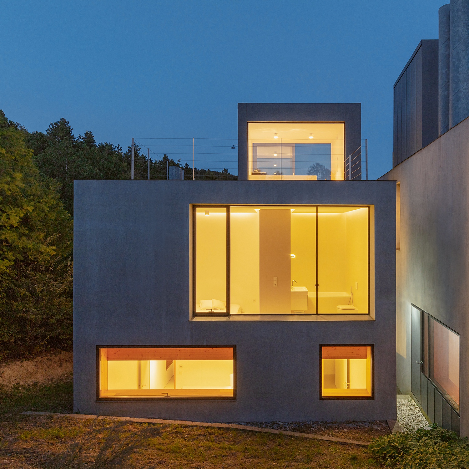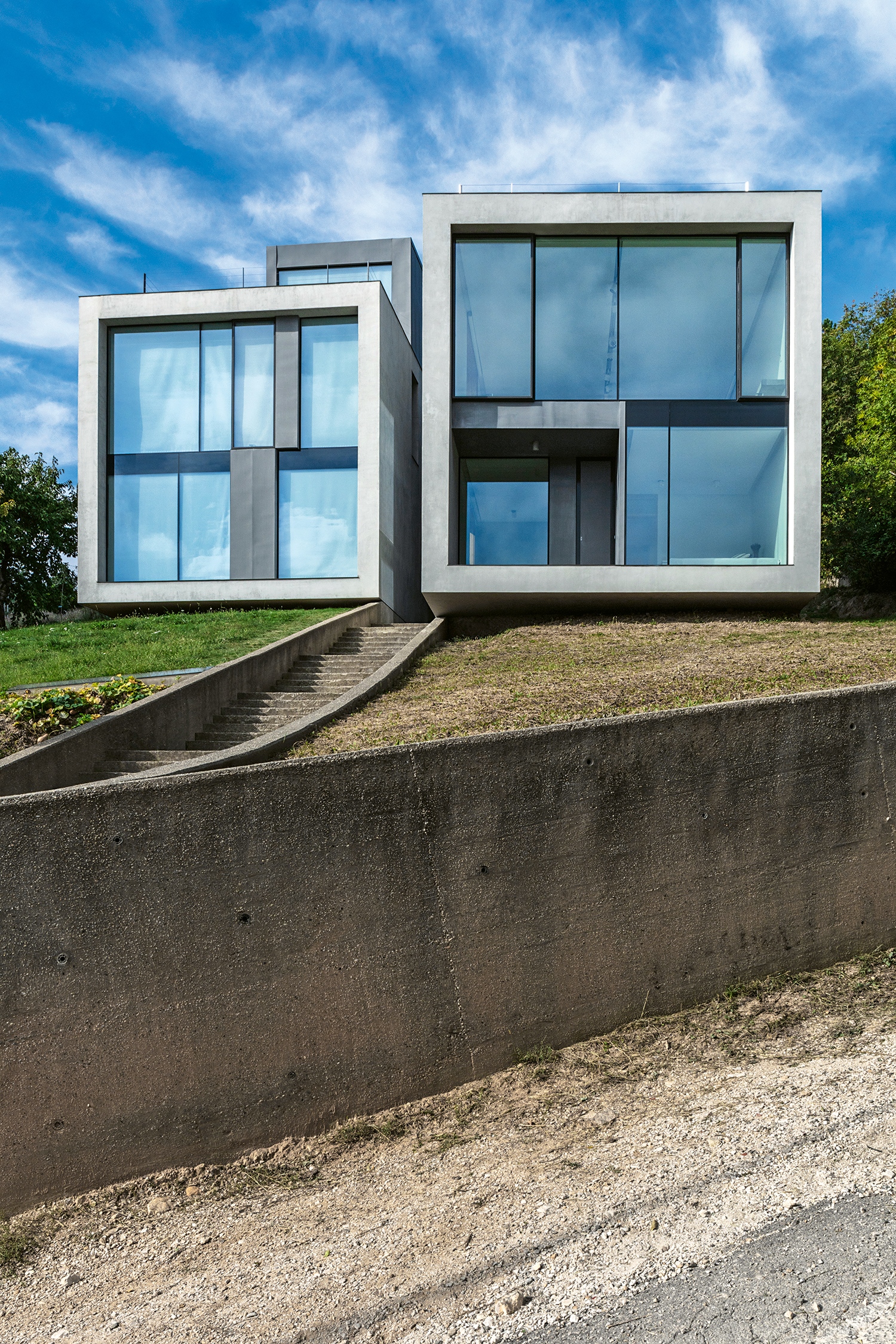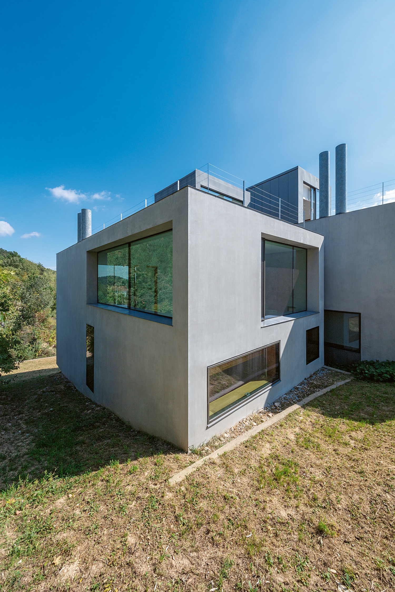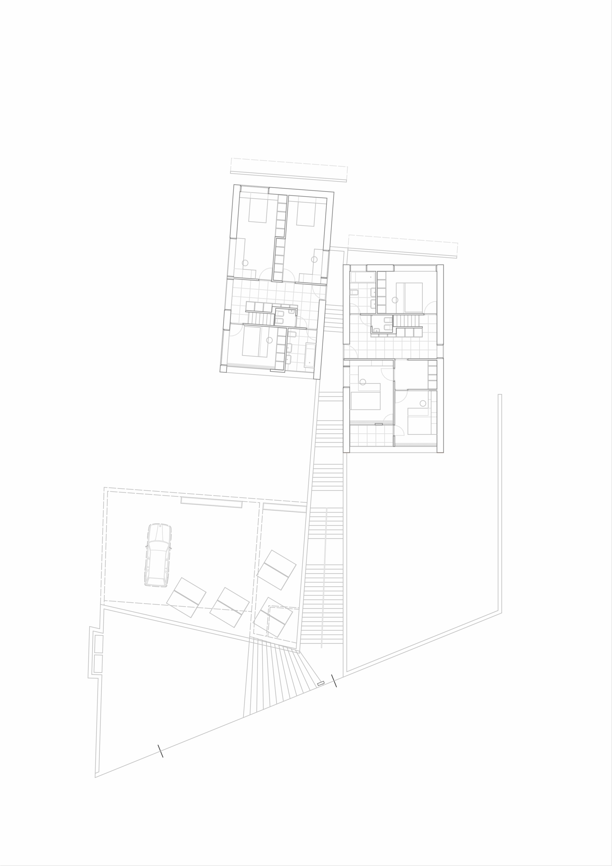 Szép kompozíciós ötlet, amint az egymáshoz képest „tükrözött” két épületrész közé beérkező lépcsőhasadék vonala a két ház közötti néhány fokos elfordulást rajzol ki. Így hangsúlyossá, de nem túlhangsúlyozottá válik egy finom gesztus, amit a tervező a kettős tájolás érdekében alkalmazott, és ezzel maximalizálta a tájra nyíló panoráma szélességét. A feszes, sarkosan tiszta formájú, lejtőbe metsződött szabályos hasábok sziluettjének tömörségét a tetőteraszra helyezett idom bontja csak meg kicsit, ez a fölső dolgozószoba, teraszkijárata pontosan a lakóhasábok méretének nyolcada.