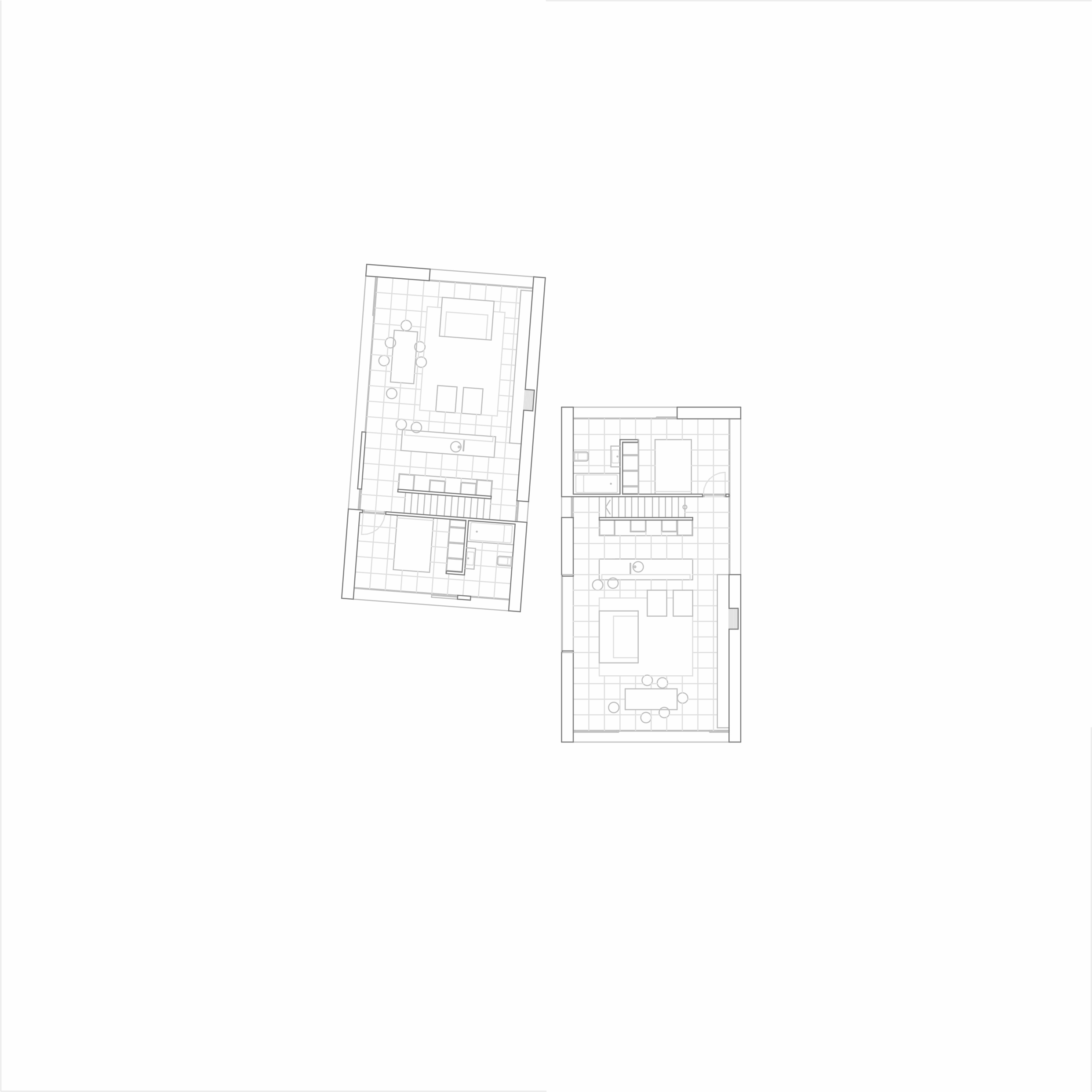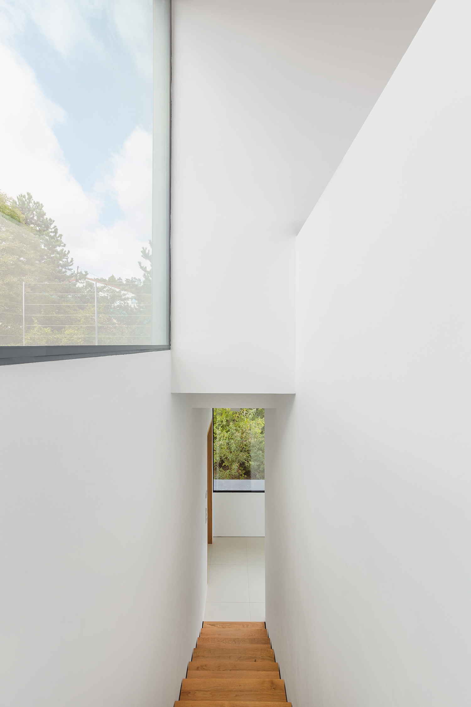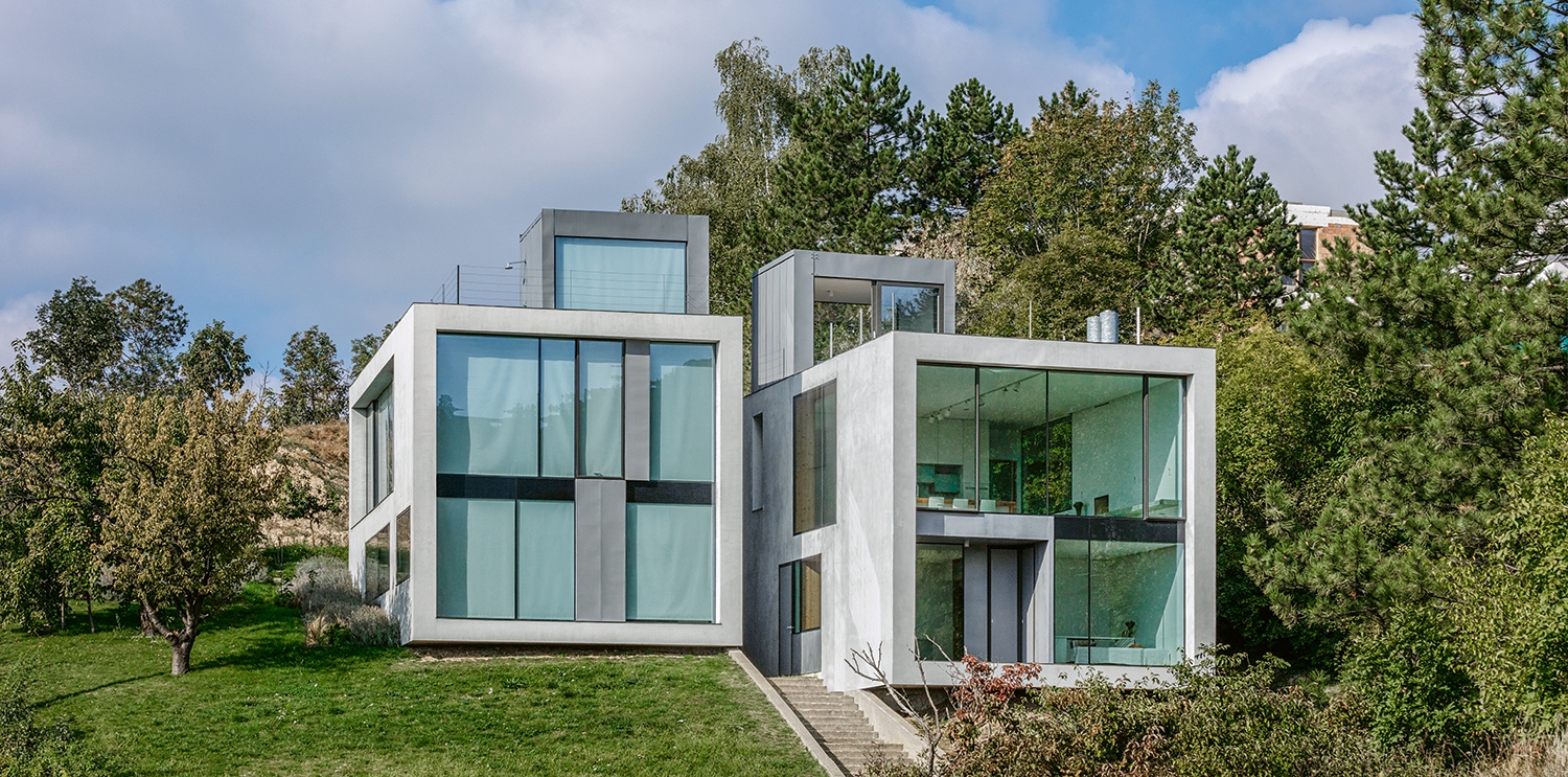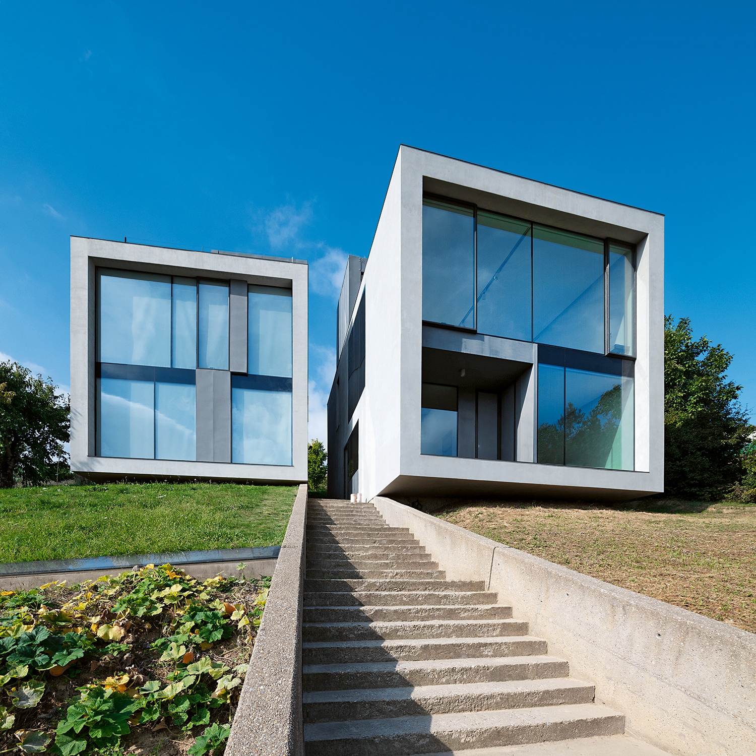 Szép kompozíciós ötlet, amint az egymáshoz képest „tükrözött” két épületrész közé beérkező lépcsőhasadék vonala a két ház közötti néhány fokos elfordulást rajzol ki. Így hangsúlyossá, de nem túlhangsúlyozottá válik egy finom gesztus, amit a tervező a kettős tájolás érdekében alkalmazott, és ezzel maximalizálta a tájra nyíló panoráma szélességét. A feszes, sarkosan tiszta formájú, lejtőbe metsződött szabályos hasábok sziluettjének tömörségét a tetőteraszra helyezett idom bontja csak meg kicsit, ez a fölső dolgozószoba, teraszkijárata pontosan a lakóhasábok méretének nyolcada.