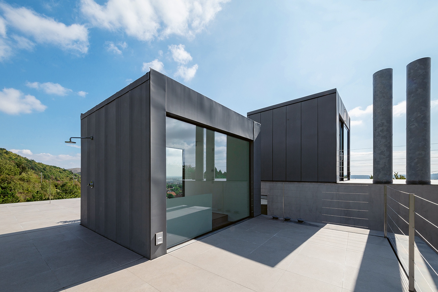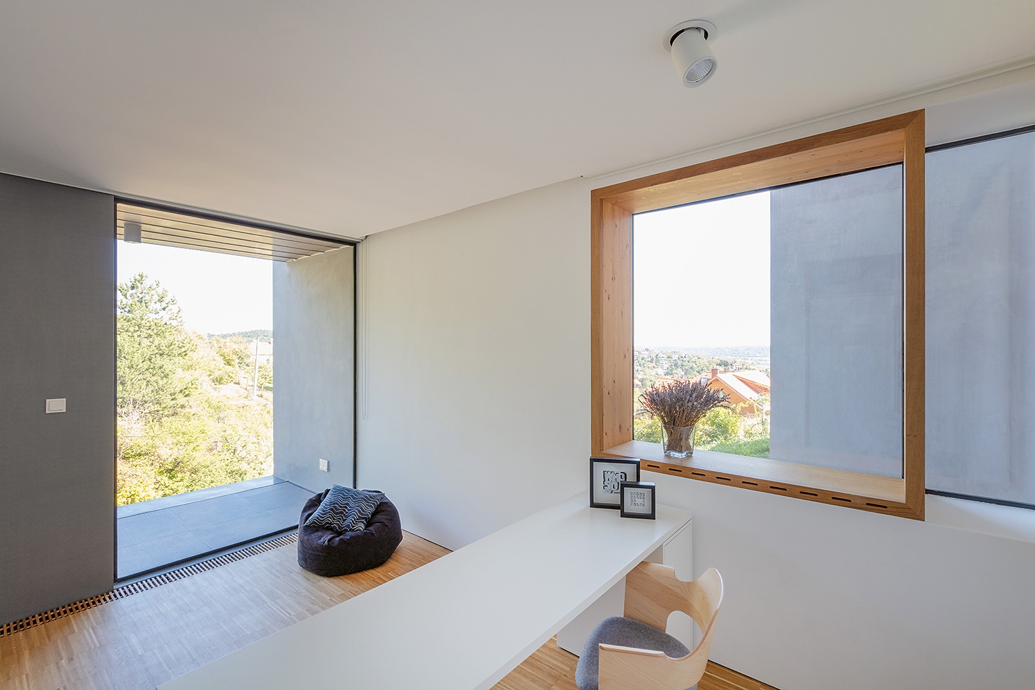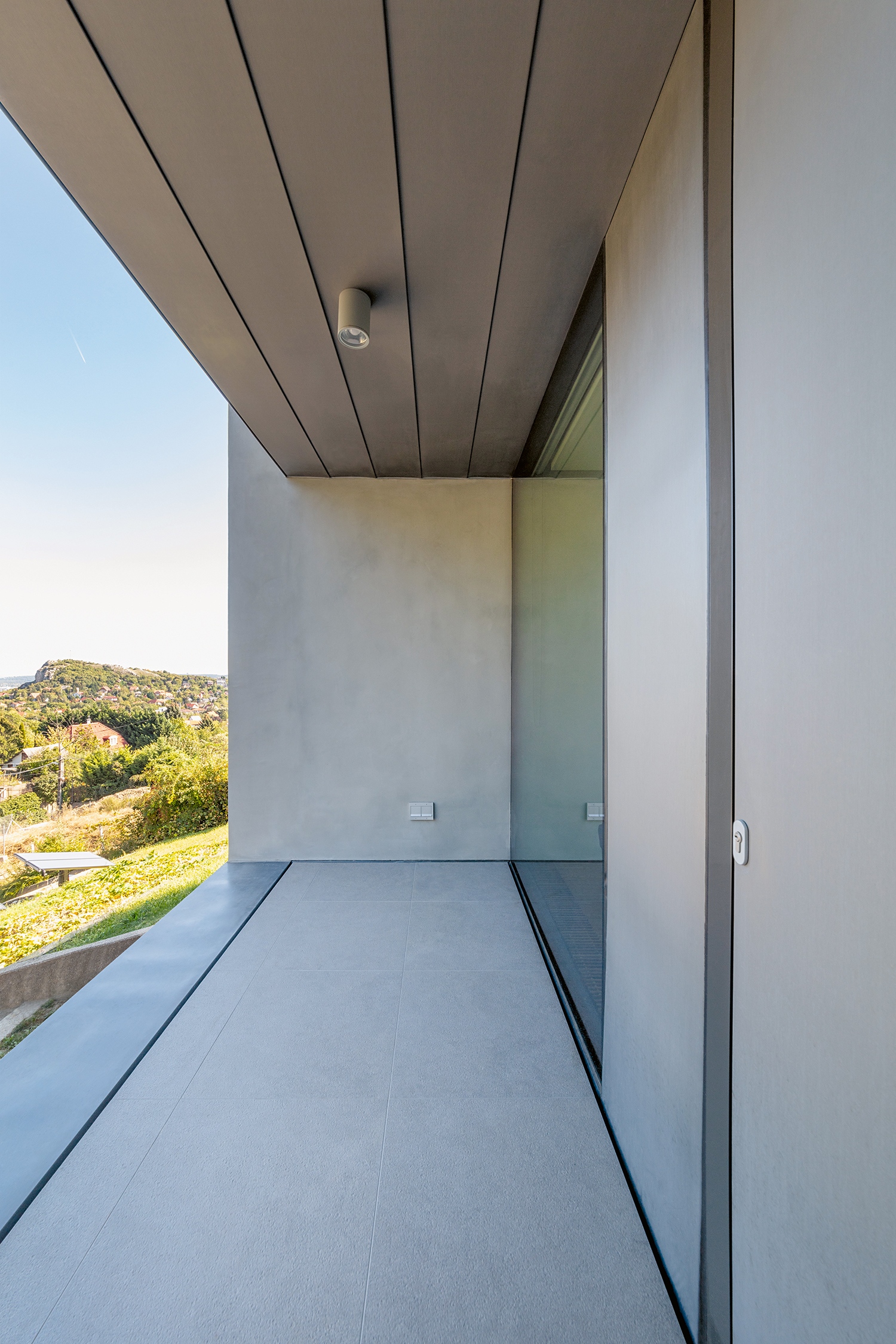 Ez egyfajta térszint felé emelkedés érzetét kelti. Olyan kicsit, mintha egy drónrepülés perspektíváját látnánk viszont, ahol a nézőpont fizikai emelkedésével együtt terül el a maga teljességében, nyílik meg valójában a környező domborzat, természeti környezet és lakóövezet panorámája. Már csak azért sem öncélú döntés mindez, mert az építési telek lejtése egyébként is nehezítette volna a teljes értékű kerthasználatot, ugyanakkor olyan telepítési szituációt eredményezett, amiben a két épületrész egyfajta lebegésben, billegésben állhat a lejtő felső pontján.