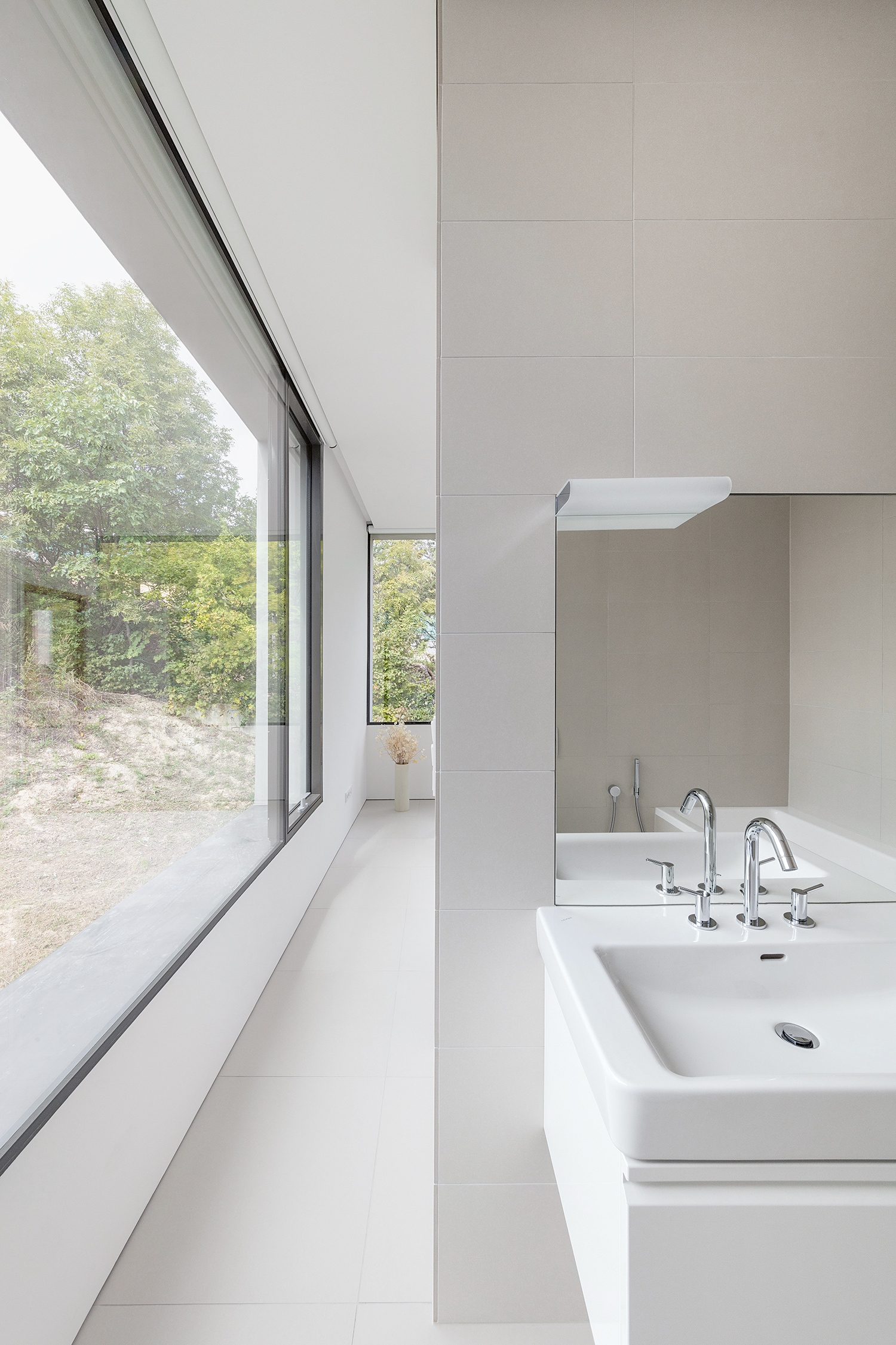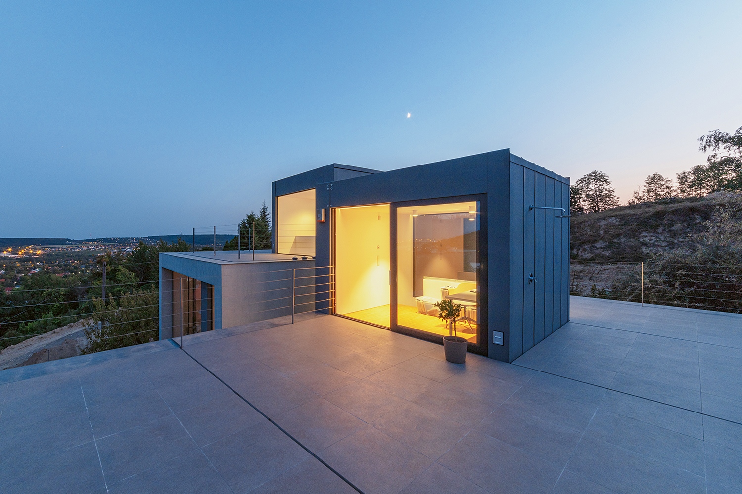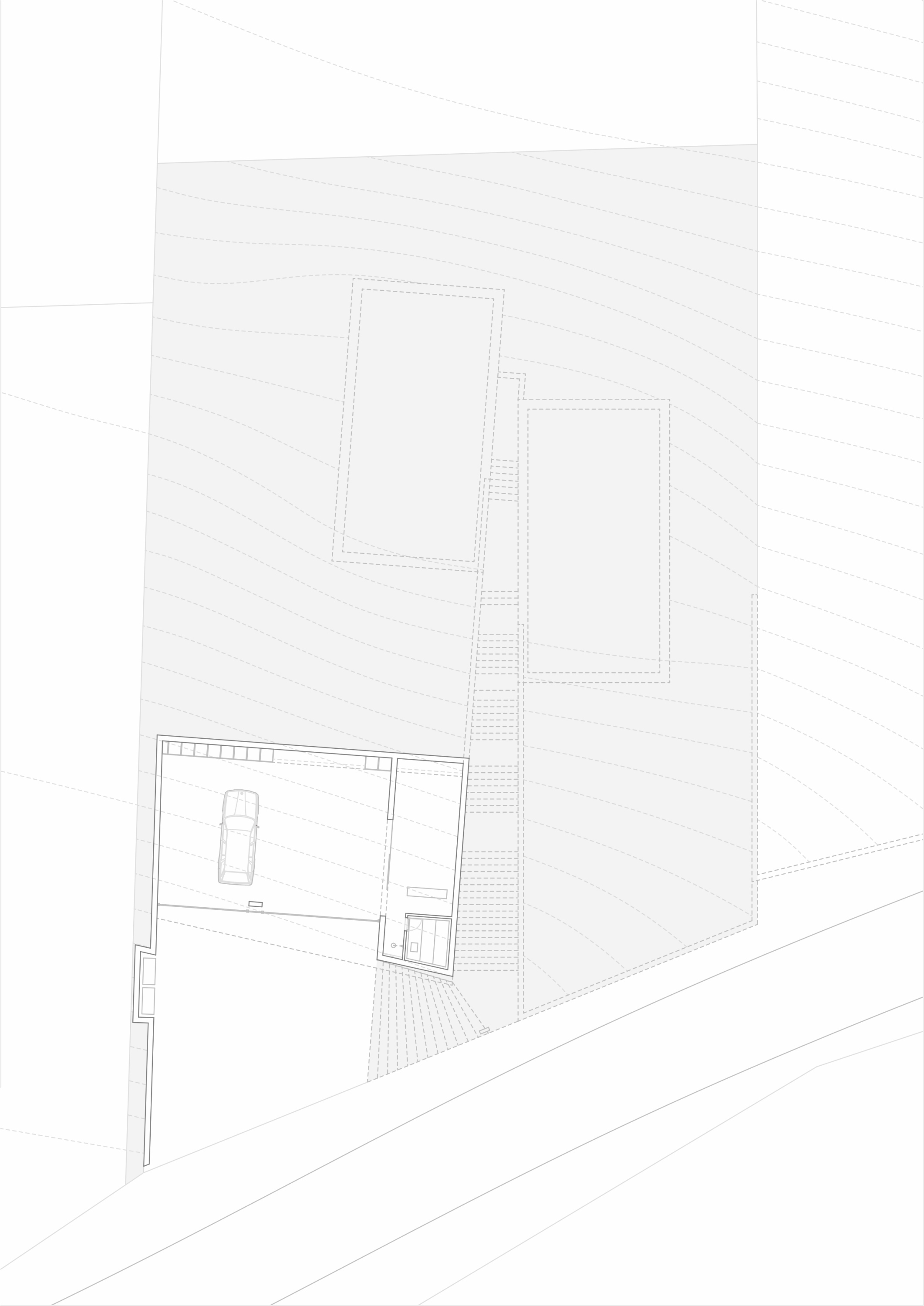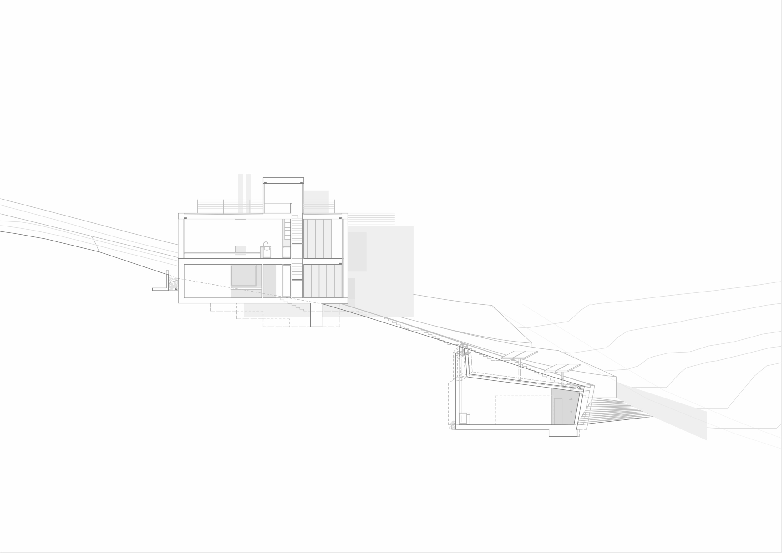Ez egyfajta térszint felé emelkedés érzetét kelti. Olyan kicsit, mintha egy drónrepülés perspektíváját látnánk viszont, ahol a nézőpont fizikai emelkedésével együtt terül el a maga teljességében, nyílik meg valójában a környező domborzat, természeti környezet és lakóövezet panorámája. Már csak azért sem öncélú döntés mindez, mert az építési telek lejtése egyébként is nehezítette volna a teljes értékű kerthasználatot, ugyanakkor olyan telepítési szituációt eredményezett, amiben a két épületrész egyfajta lebegésben, billegésben állhat a lejtő felső pontján.