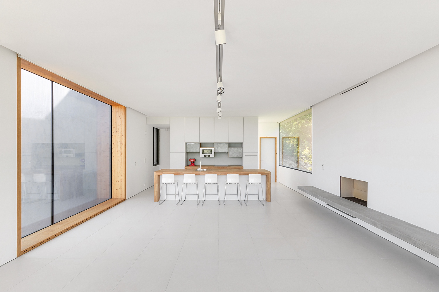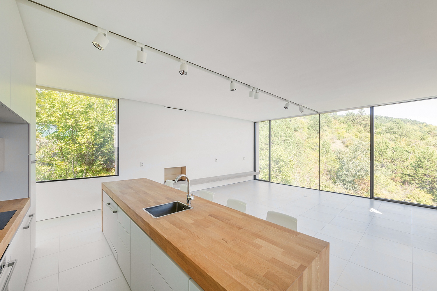 A csomópontok letisztultsága és a kivitelezés perfekcionalizmusa azonban nem állnak meg a házfalakon kívül, a nagyobb szerkezeti elemeknél. A nagyvonalú, minimalista belsőépítészeti megoldások egy-egy pult, vagy leülő apró részleteiben is visszaköszönnek. Érezhető a tudatos tervezői megfontolás, ami a táji környezettel összefüggésben zavartalan kapcsolatot kíván megteremteni a belső tér és a határtalan ég, a szélesen szétterülő panoráma felé.