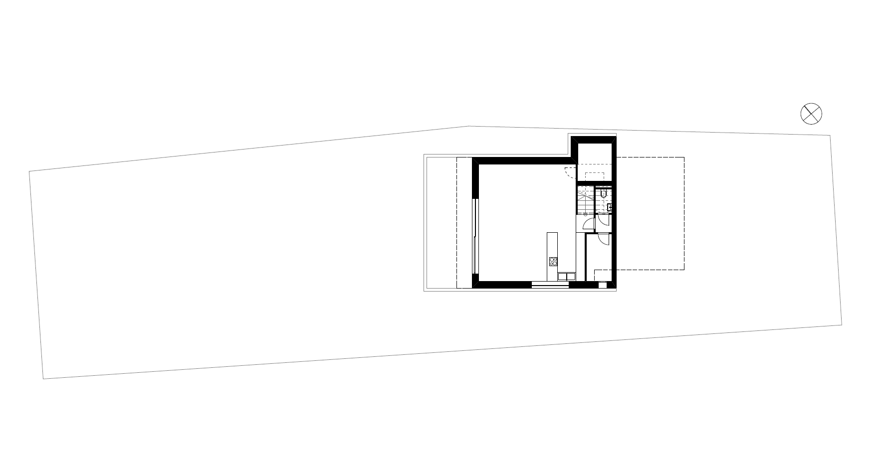 Közösségi térré alakították a korábbi szuterént, belmagasságát pedig a padló mélyítésével növelték meg. Belépve ide rögtön az épület közepén találjuk magunkat, s bár egy statikai bravúrnak köszönhetően az alaprajz osztatlan maradhatott, fejben minden funkció – azaz a konyha, az étkező és a nappali – elkülönül. A helyiség fala délnyugati irányban, a hegyek felé üvegajtóval nyitott, így minden alkalommal élvezhető a fantasztikus naplemente látványa.