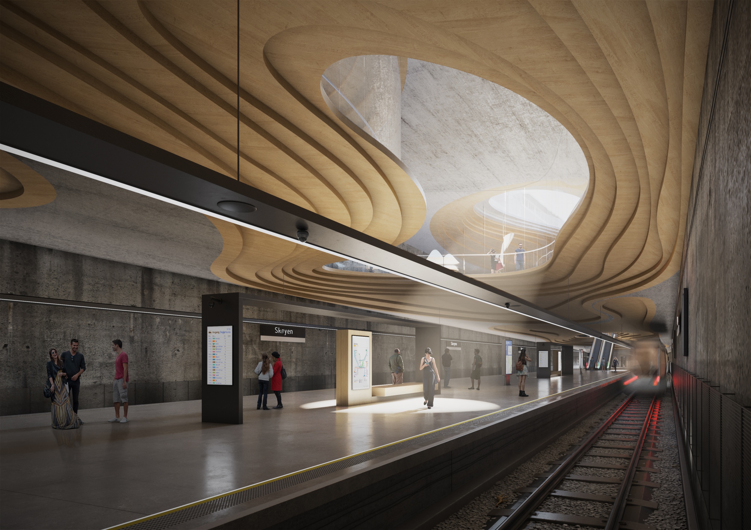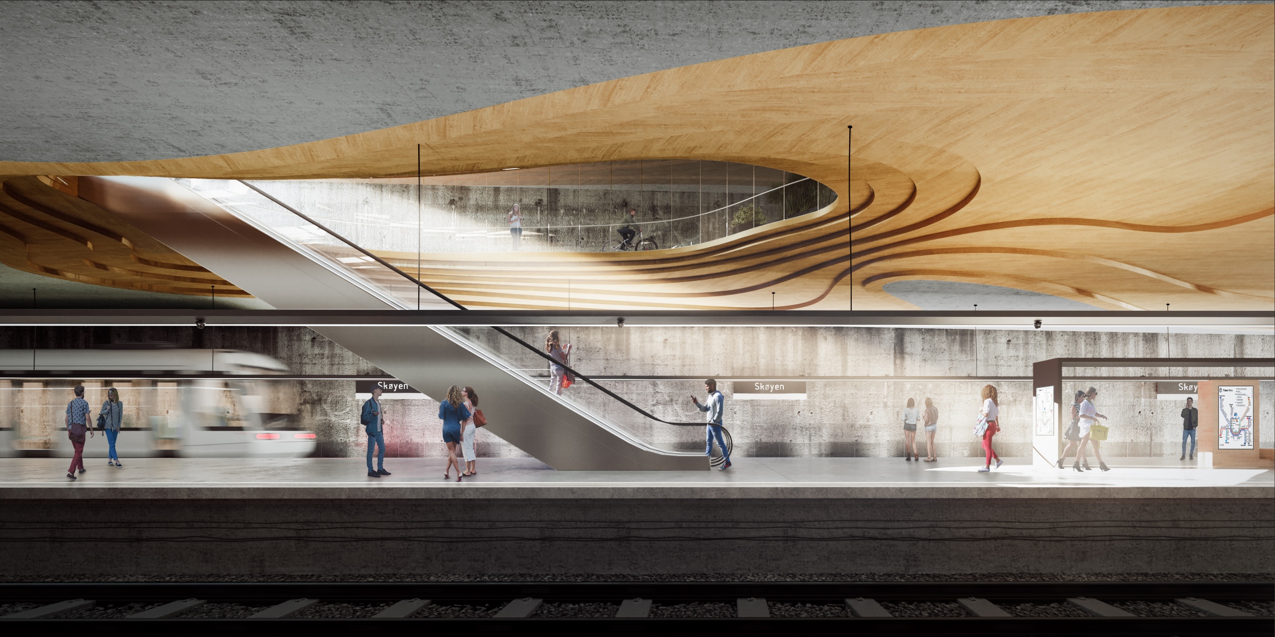 Az Austigard Arkitektur és a Sporaarchitects csapata új metróállomást tervezett Skøyenbe, Oslo új magasházas, frekventált fejlesztési területére. A nemzetközi tervpályázaton a közös koncepcióval 2. díjat nyertek. Az építészeti koncepció egyrészt a metróállomások igazi lényegére reagál, az emberek folyamatos áramlására, másrészt utal környezetére, a norvég fjordok és tengerpartok jellegzetes kacskaringós partvonalára, a norvég fenyő kanyargós textúrájára, sőt, a közelben élt és alkotott Edvard Munch tájképeinek expresszív atmoszférájára. Ezek együttesen hozzák létre azt az álomszerű földalatti tájat, mely kitekint a város felé.